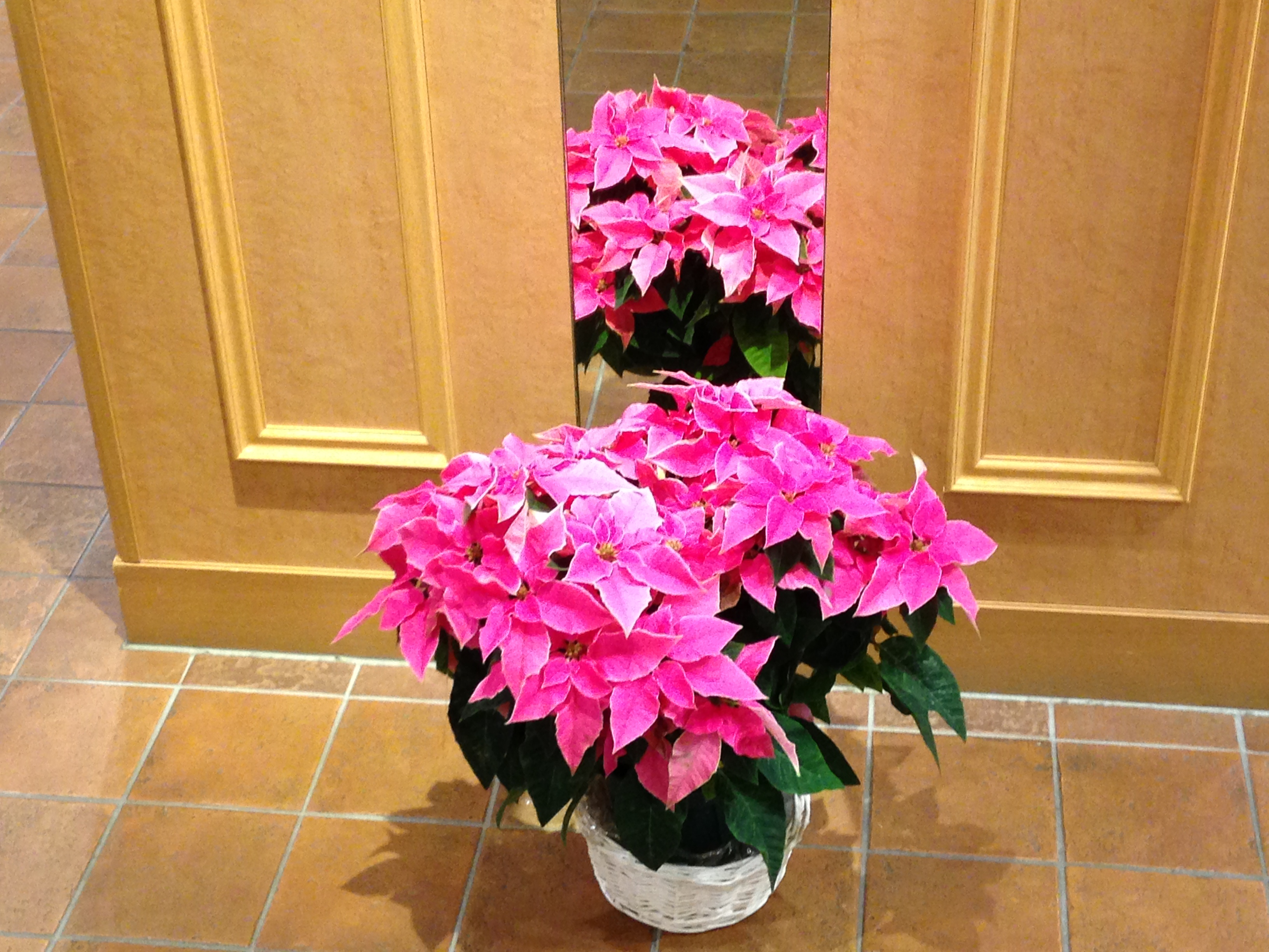 エレベーター柱前にはピンク色のポインセチアの改良版?の