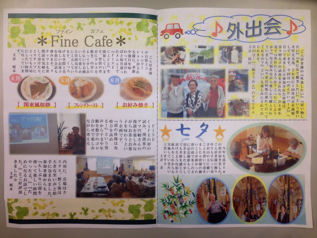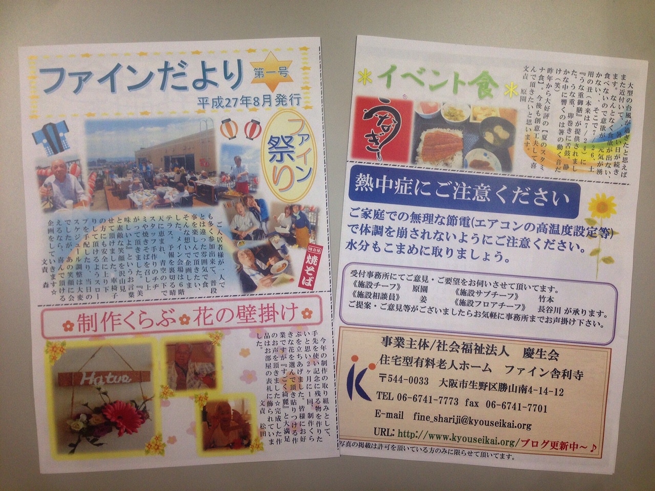 こんにちは☆ 涼しくなってまいりました☆ 夏が終わると思うと少し寂しさも感じるこの頃... ファイン舎利寺では新しい取組みとして、題名の【ファイン便り】を創刊致しました!☆ (今さらですが8月発刊です...(^_^;)) ファイン便り1.jpg ファイン便り.jpg 記事に関しましてはファインで取り組んでいる行事を主にご紹介させて頂いています* 遠方にお住いのご家族様や、スマートフォンやパソコンをお持ちでなくブログを確認できないご家族様にも是非ともご様子等をお届けしたく実施に至りました☆ ご入居者様とご家族様の間で、話のきっかけにもなって頂きたいなぁ、とそんな風にも思っています(*^^)v 発送時期は年3回を予定しております☆ それにはまず、皆様の素敵な笑顔に出会えるよう行事の企画・実施をしっかりと検討していきたいと考えていますので、 またご紹介させて頂きますね(*^^*)