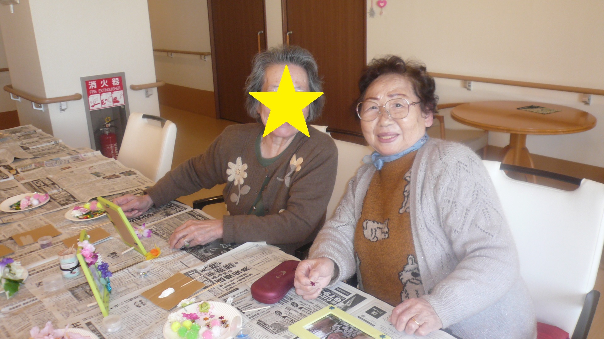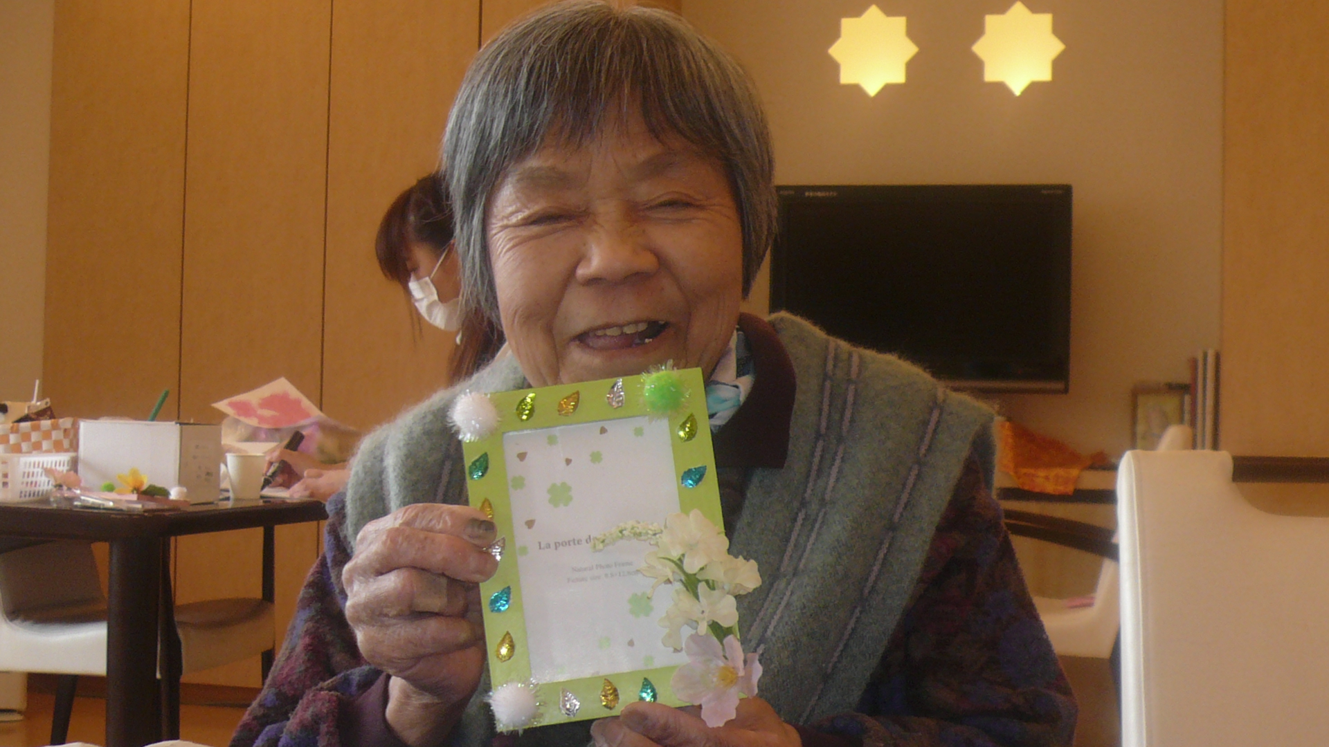 こんにちは☆ 行事紹介パート2です!!!!笑 【1/24(日)  制作くらぶ ♪ フォトフレーム飾り付け】 昨年の≪敬老の日≫に、ファイン舎利寺から入居者様の皆様に 記念撮影をした写真を入れて、フォトフレームをプレゼントさせて頂きました(*^^*) 今回の制作くらぶでは、このフォトフレームを持参いただき、 淵に造花やビーズ等を飾り付け、糊付けしていただき 【世界に一つだけのフォトフレーム】にしていただきました(^_-)-☆ 【 見本 】 selfiecamera_2015-12-25-14-17-31-553.jpg 皆さま、お好きな色でまとめられたりと 個性豊かな仕上がりとなりました* P1030465.JPG 手先を使用して、刺激ある時間をお過ごし頂けたのではないかな、と(*^^) P1030460 - コピー.JPG また昨年の作品になりますが、こちらは壁面作品ですーーーー!!! image1 (17).jpg 壁一面にクリスマスツリーを作っていただきました☆★ 段ボールに、毛糸でくるくるーと巻いていただくだけなので、 手先にしびれや、麻痺の症状をお持ちの方も簡単に出来ると 好評でした(*^_^*) IMG_4442.JPG お一人お一人の作品が合体して、1本の素敵なクリスマスツリーとなりました* 皆さんで一つの物を作り上げる!というのも記念ですよね* 次回の制作くらぶは、春に向けて【桜】に関する壁面作品を 制作する予定ですーーーーー* また素敵な作品が出来ますように...☆