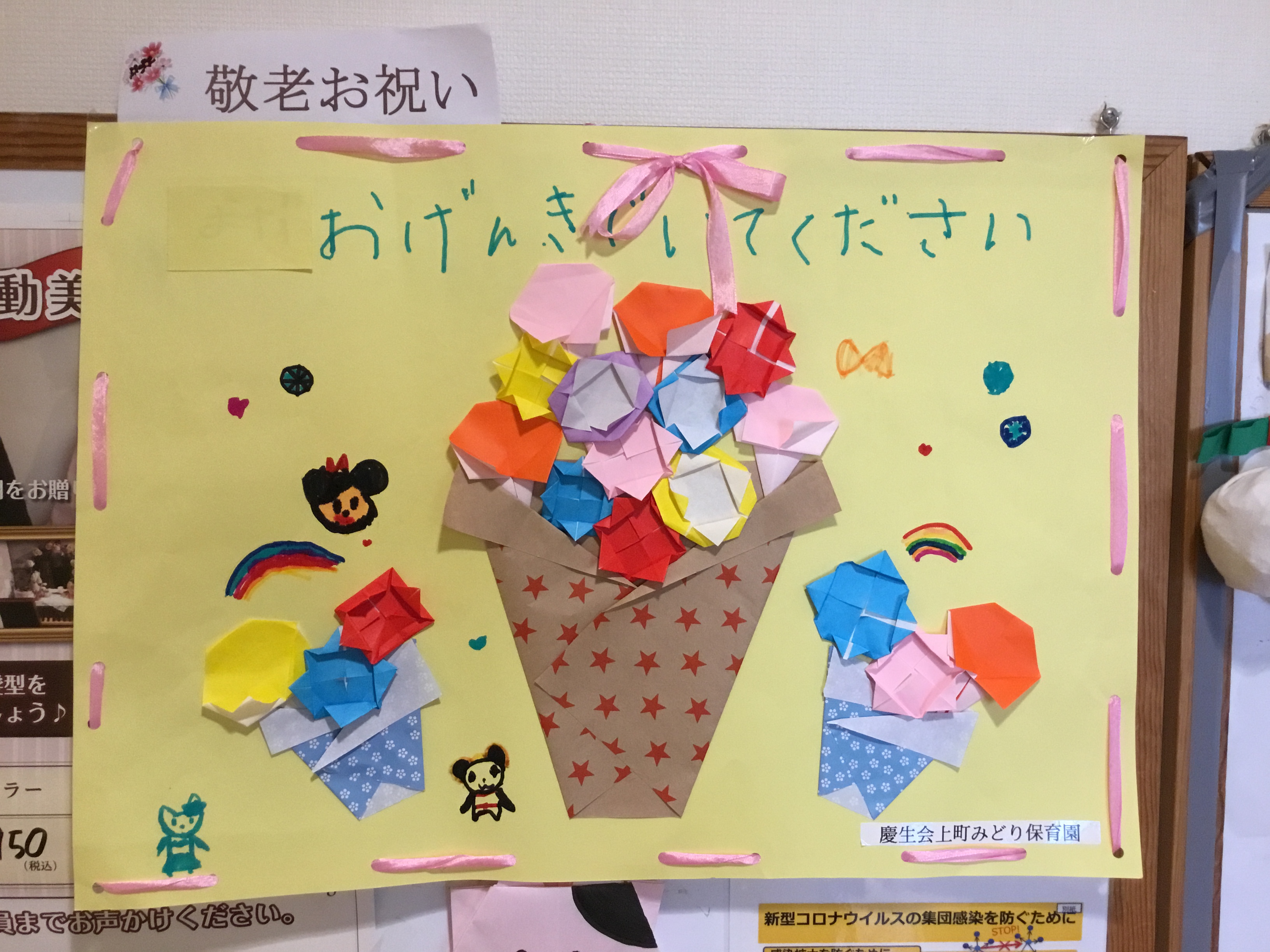 おじいさん・おばあさんの長寿とご健康をお祝いしまして、折り紙を使用して花束を作成したそうです!