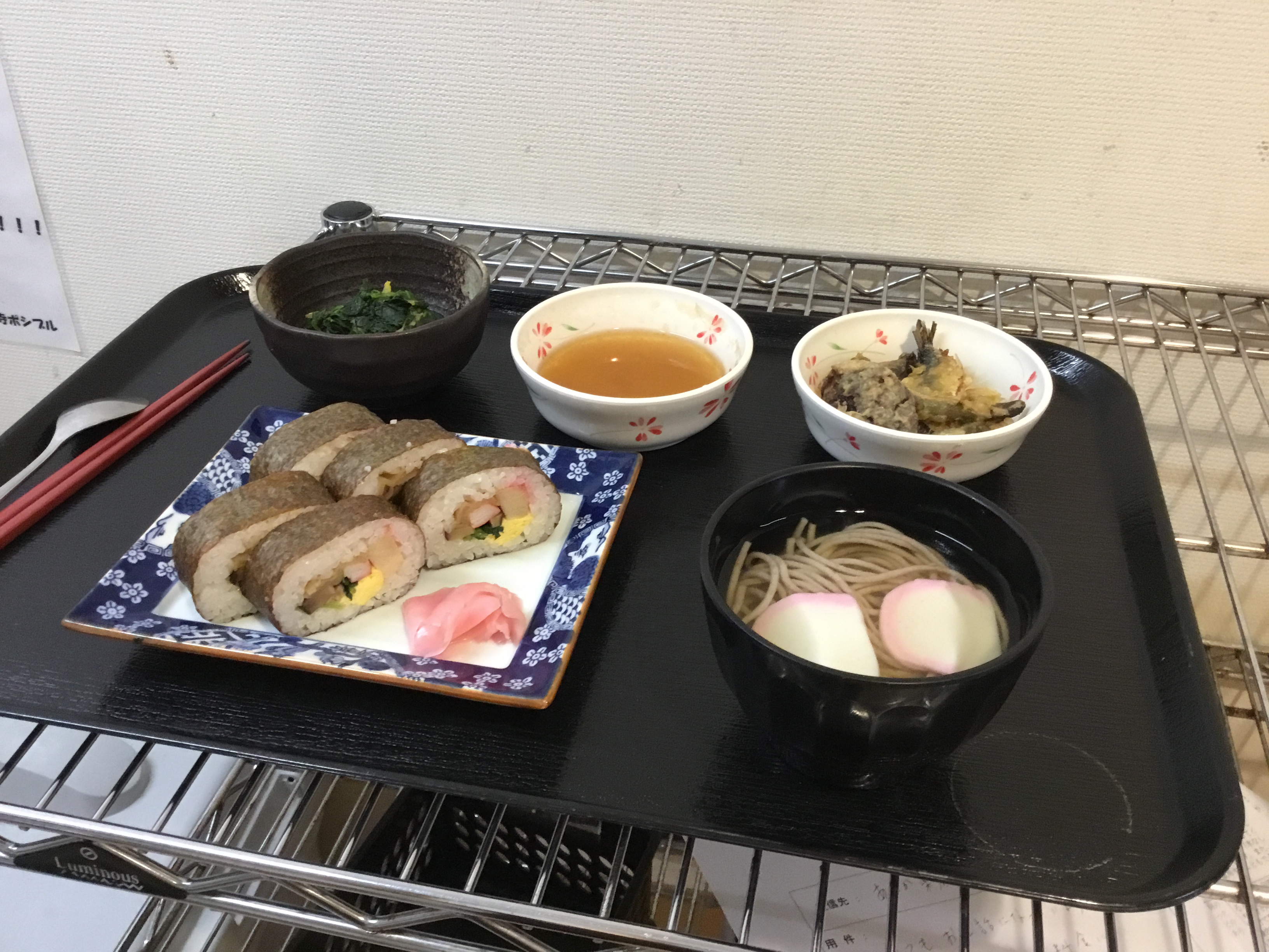 本日の夕食では巻き寿司、節分蕎麦、いわしの天ぷら等が振る舞われました(^_^)