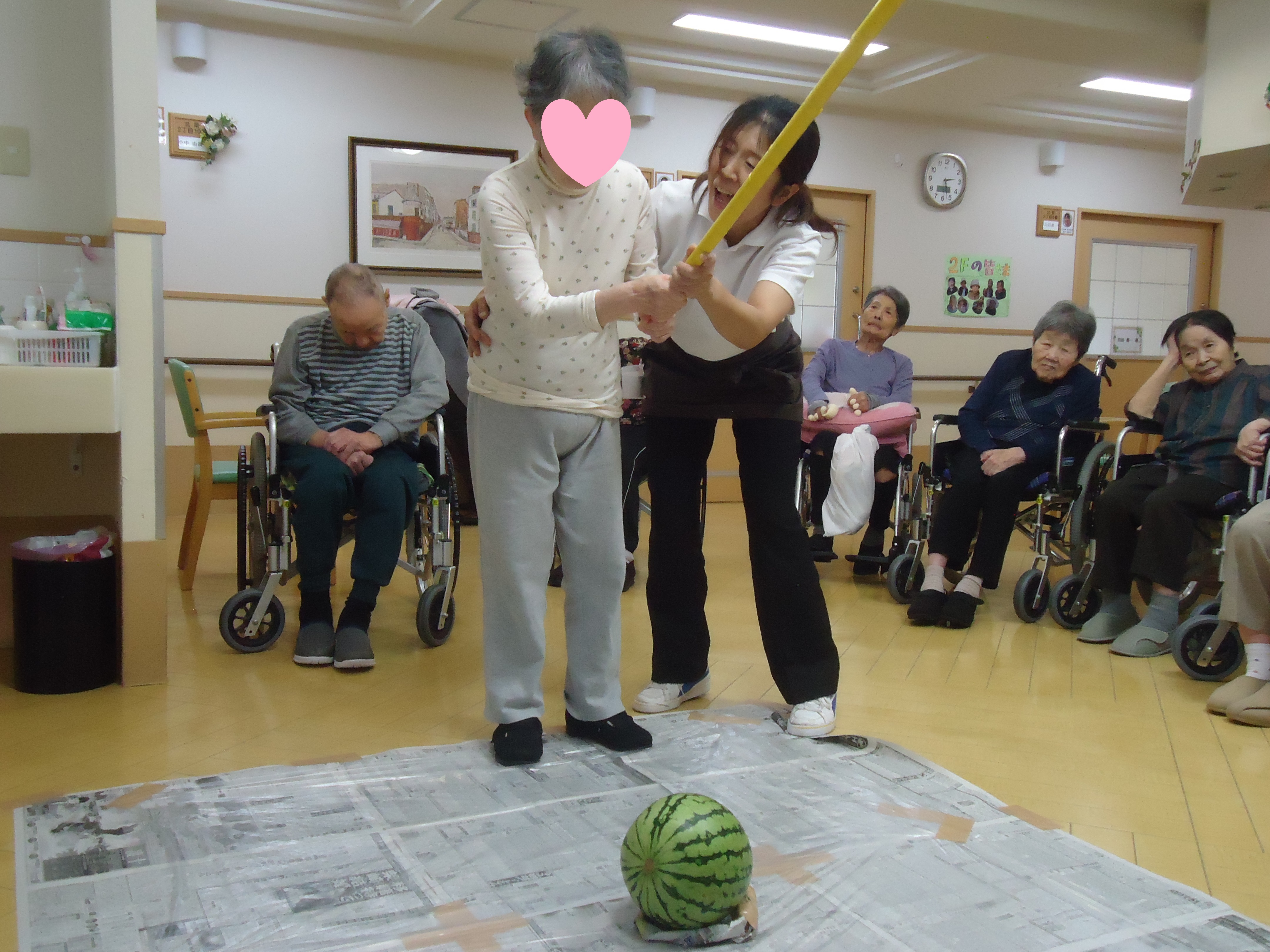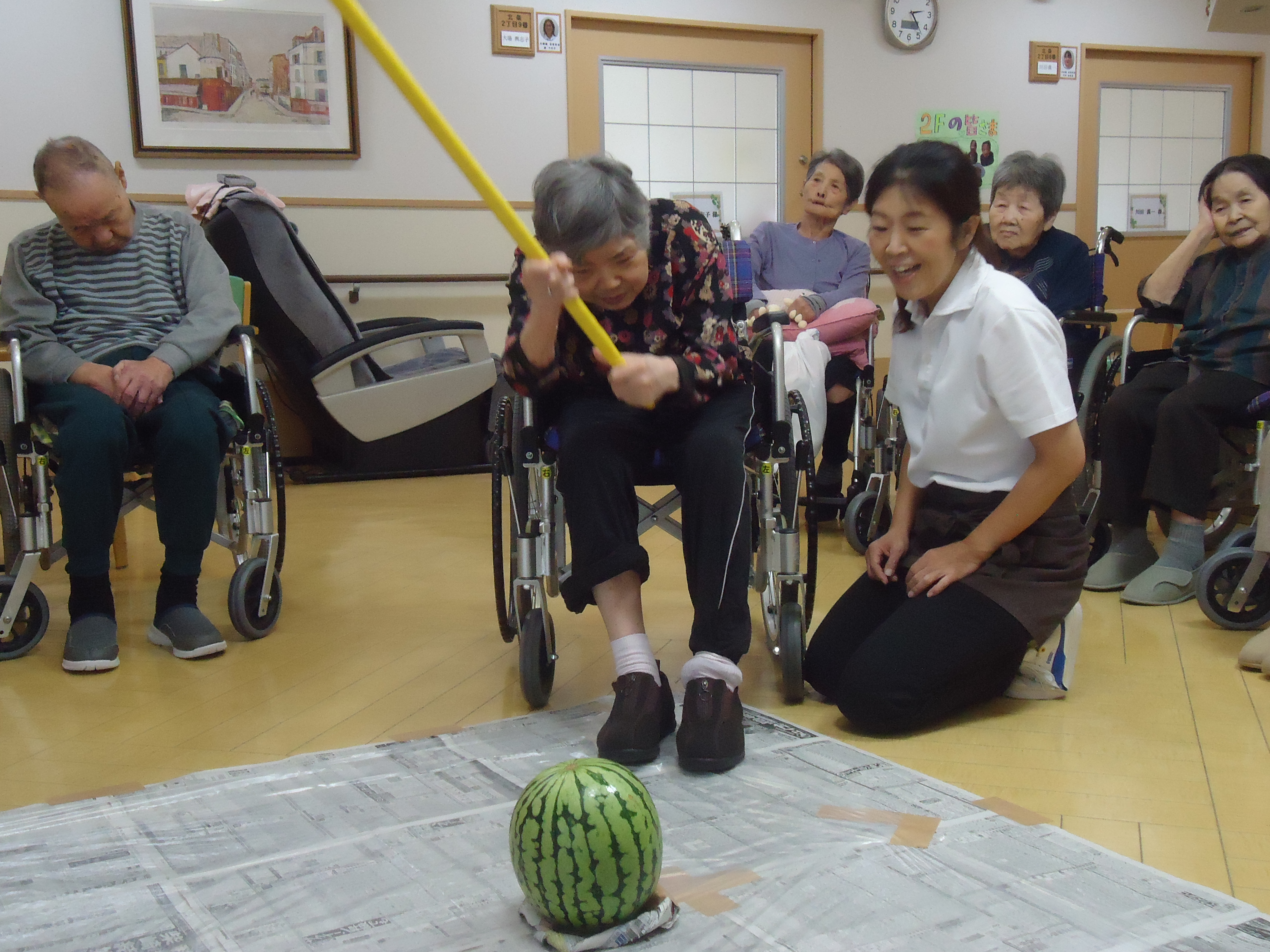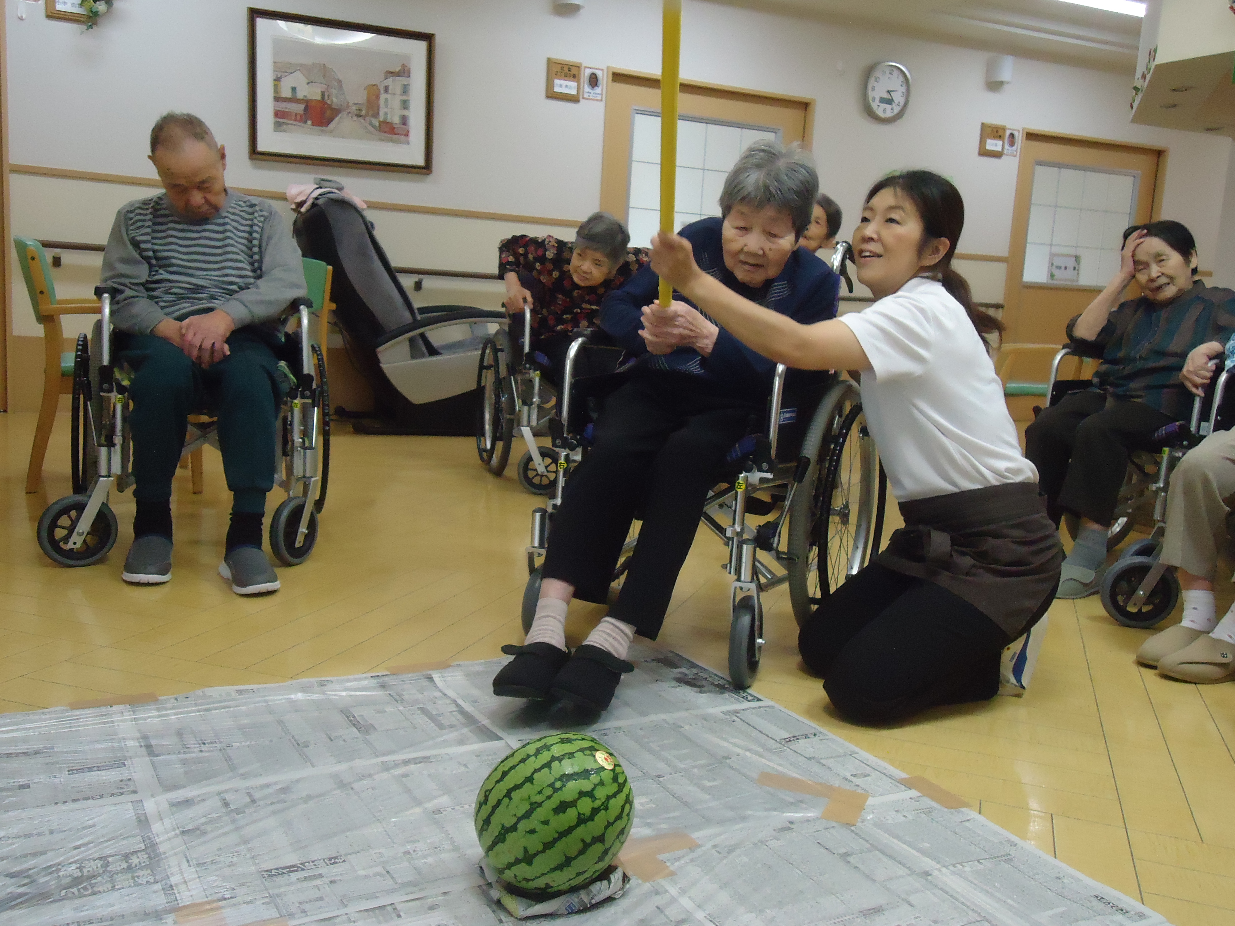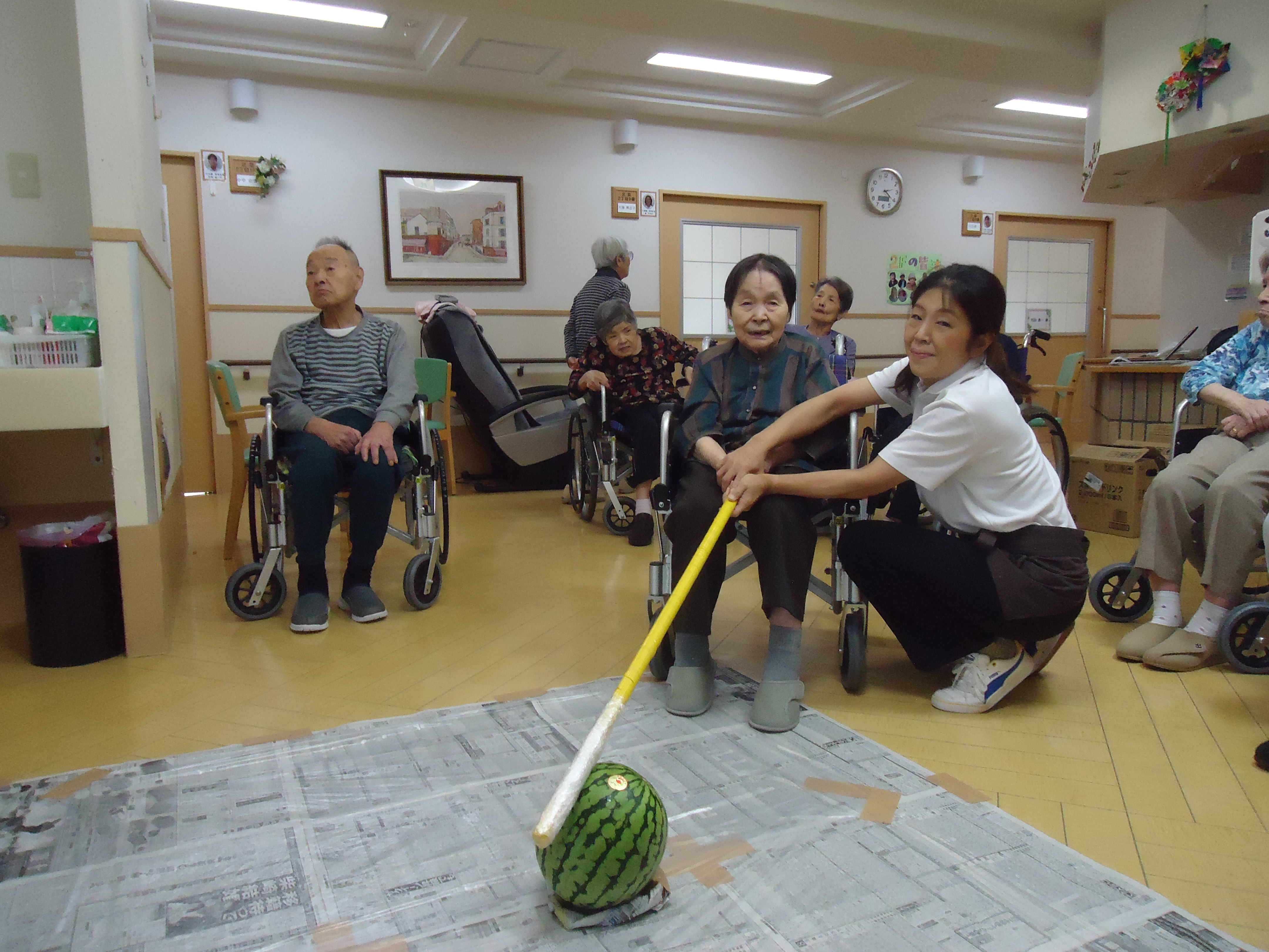 ↓顔程の大きさのスイカです。こちらを利用者の皆さんで順番に狙っていきますよー!