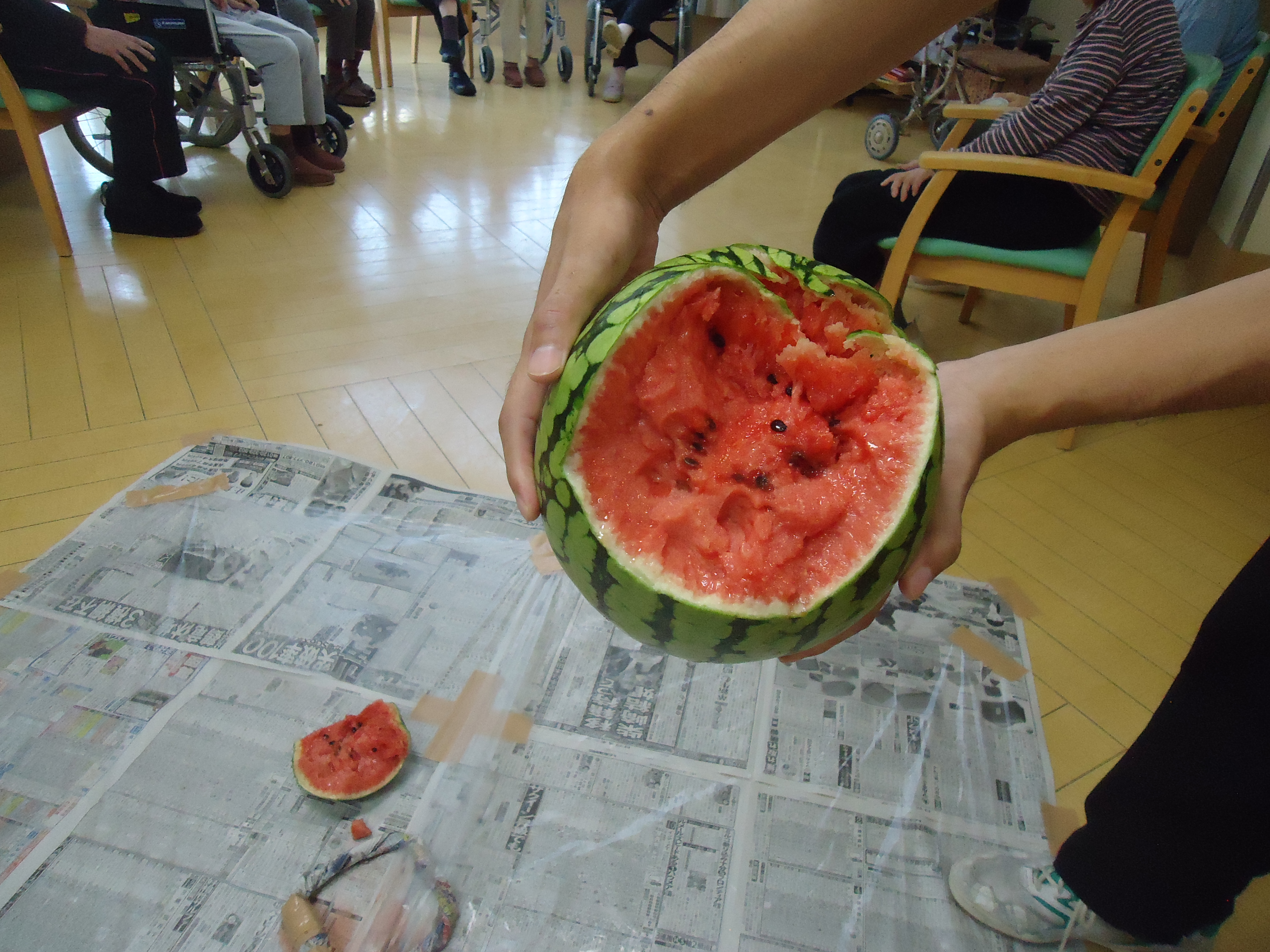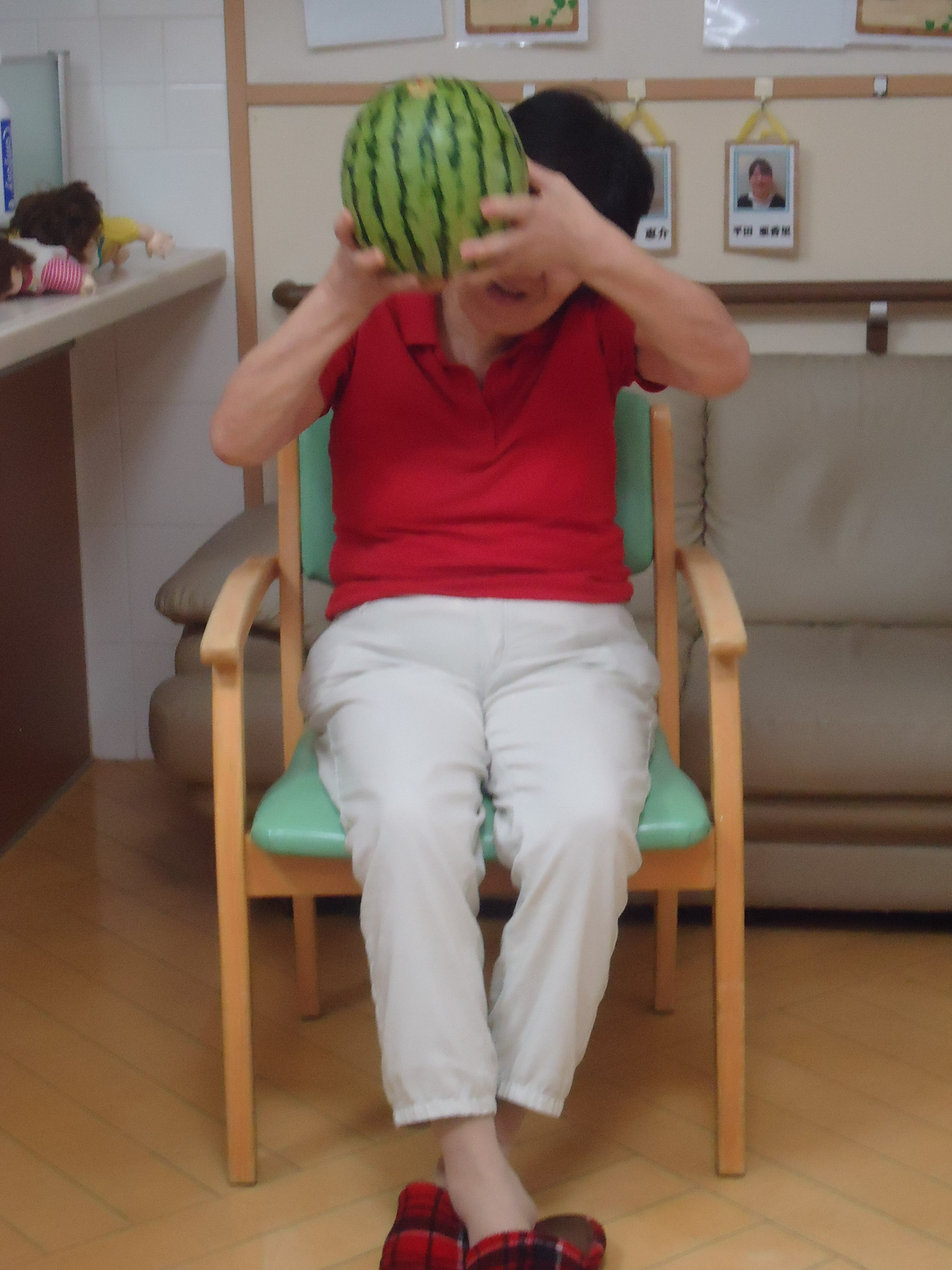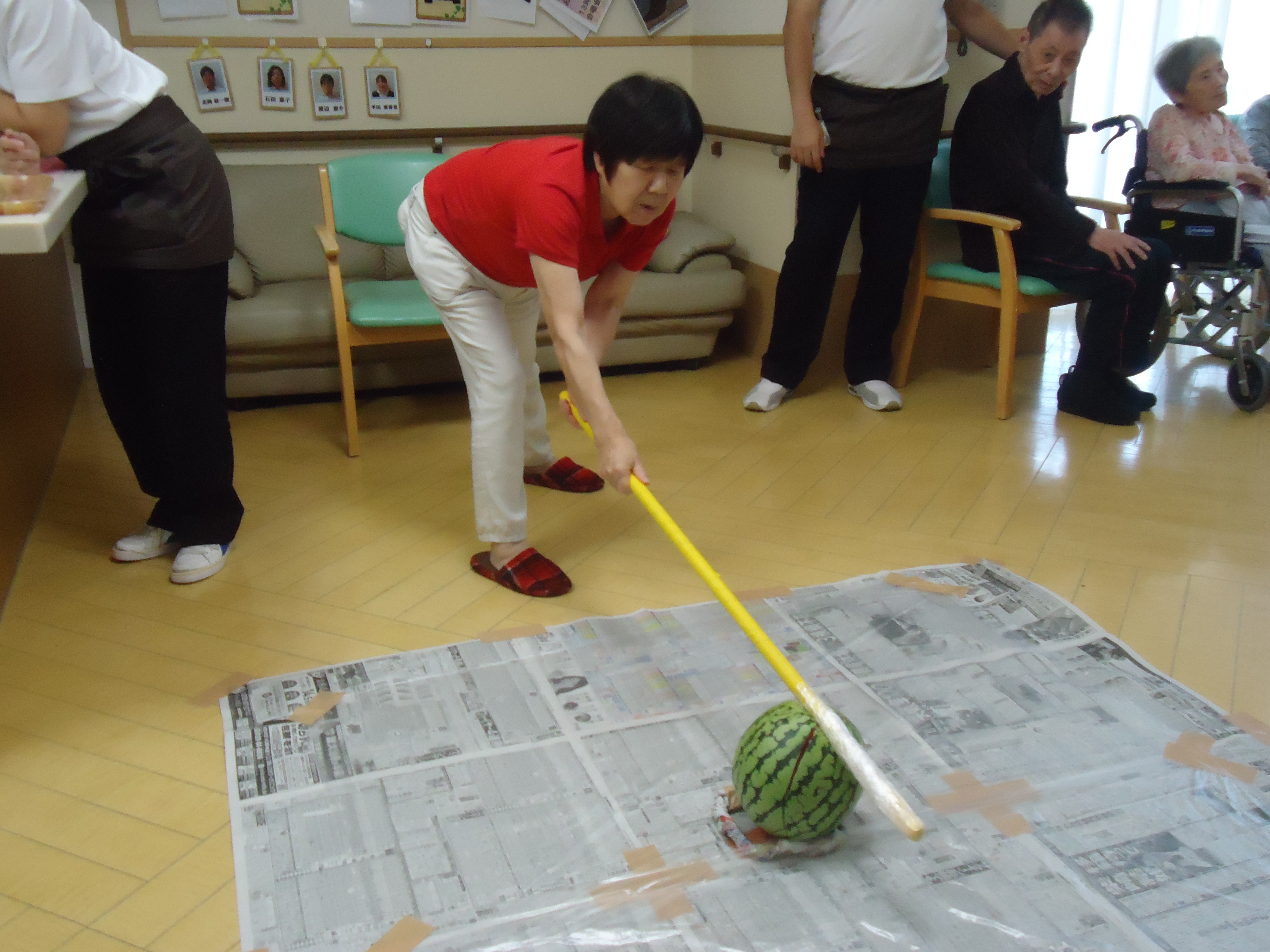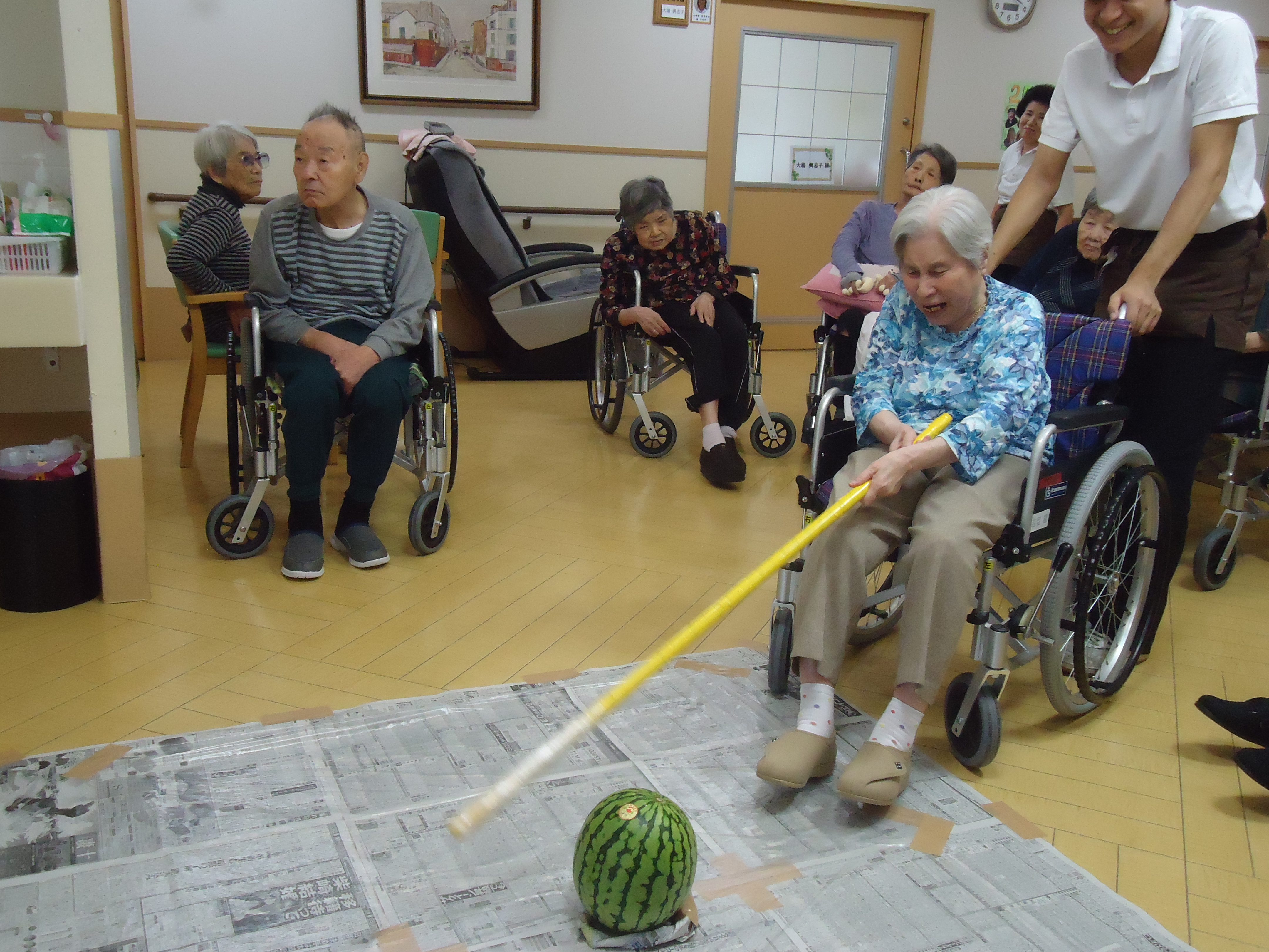 ↓顔程の大きさのスイカです。こちらを利用者の皆さんで順番に狙っていきますよー!