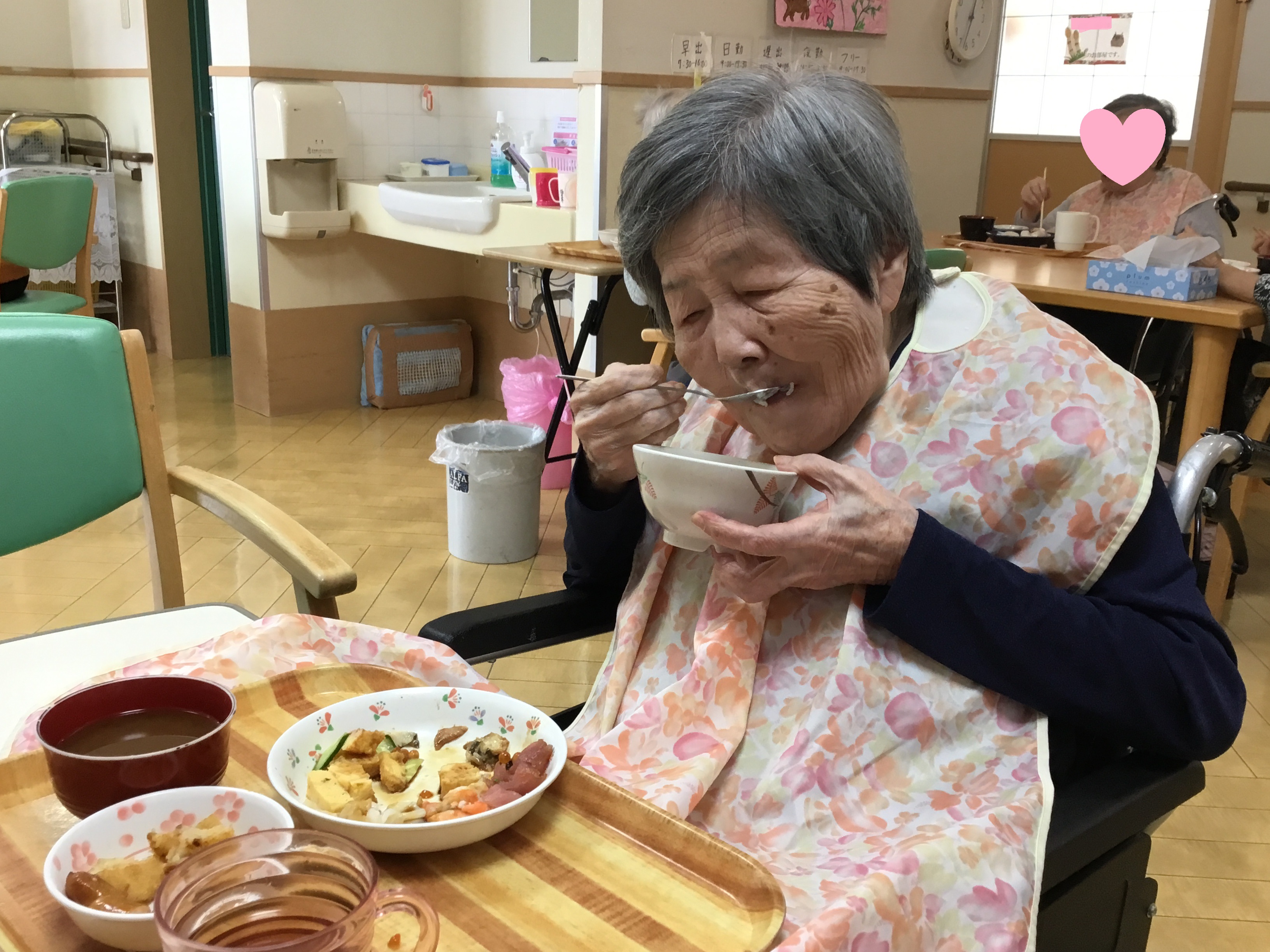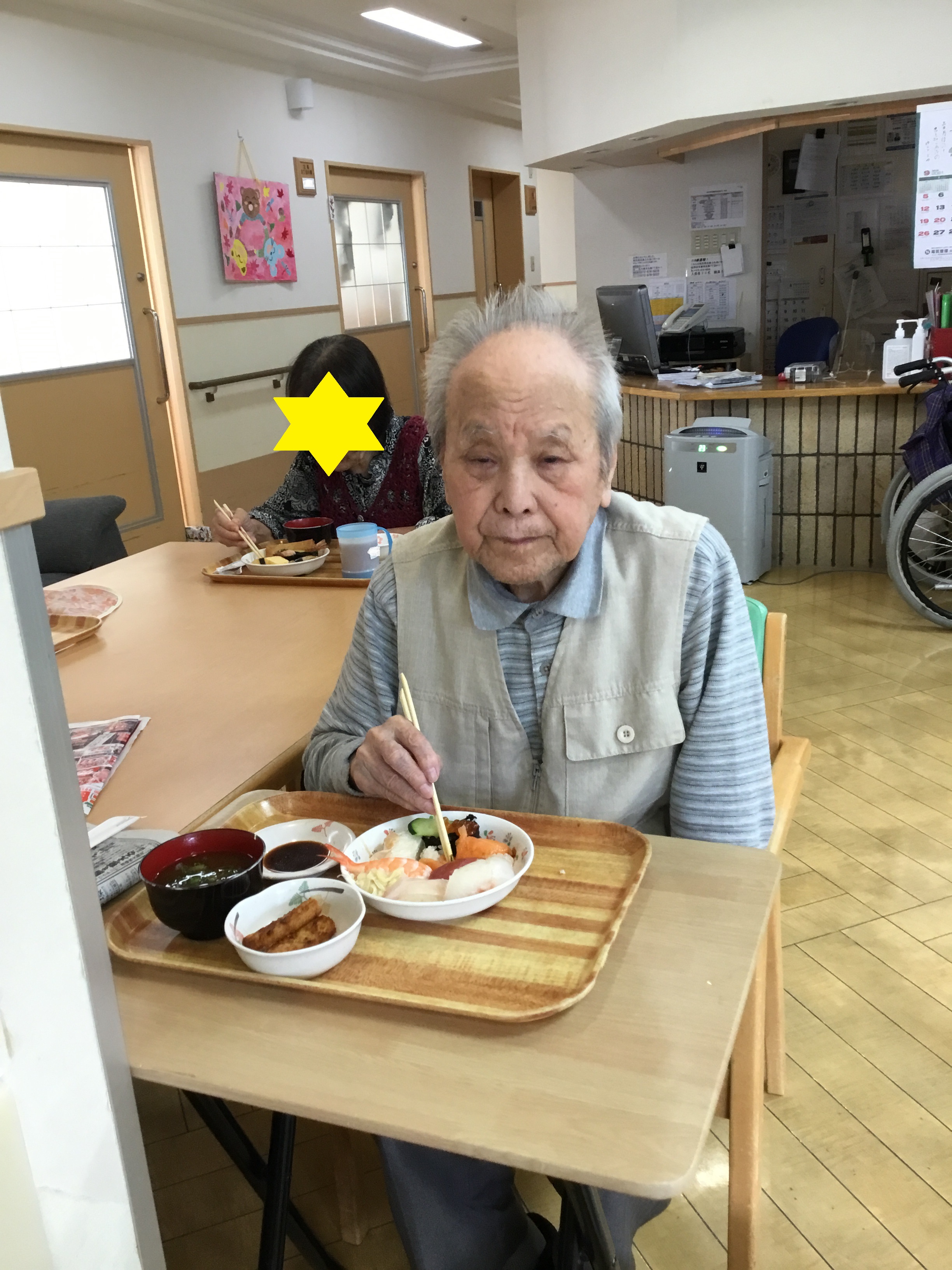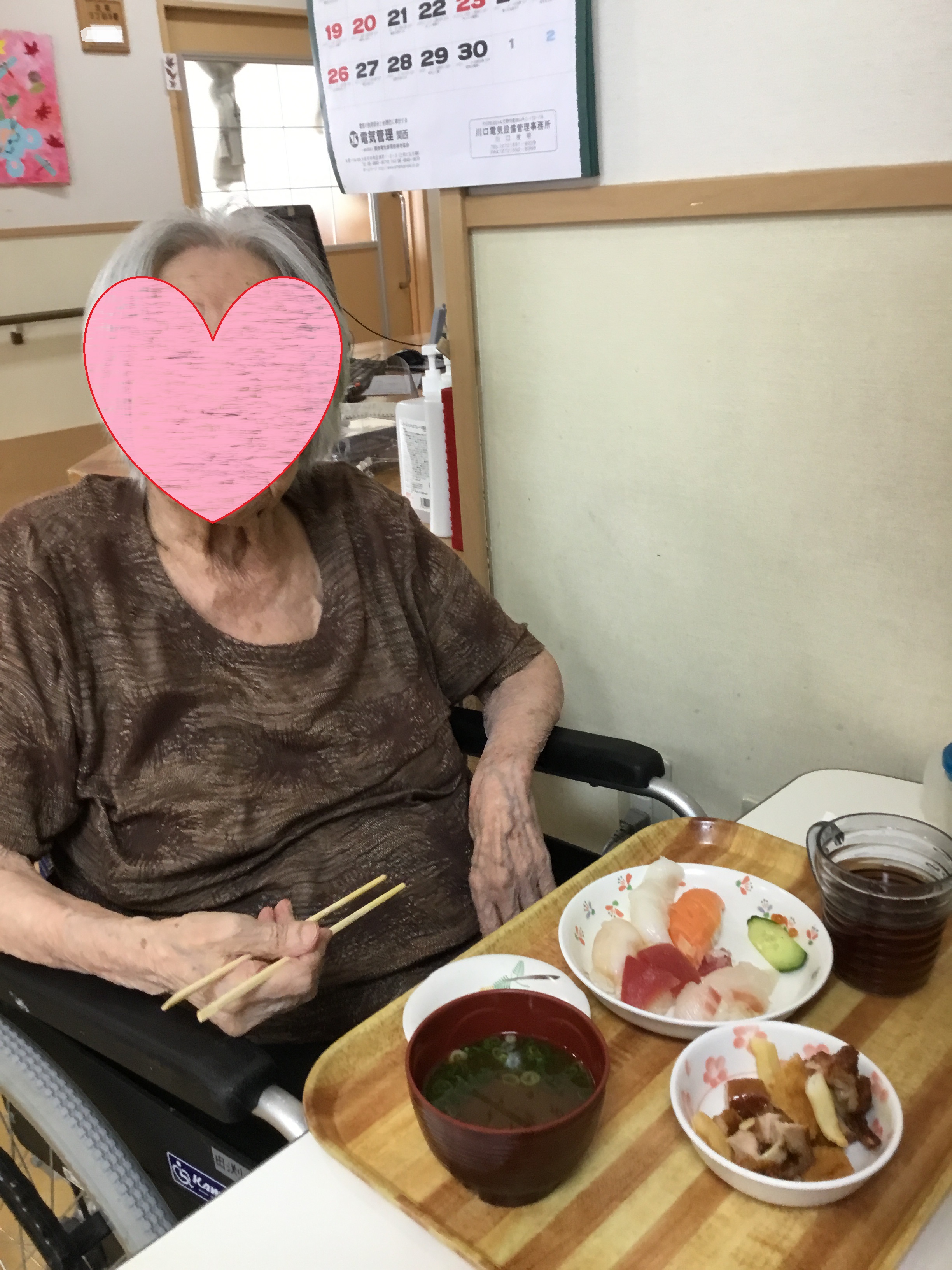 皆様こんにちは! 今回は先日紹介させて頂いた2階敬老会のご様子に続き、3階敬老会のご様子を紹介致します! ----------------------------- 3階の敬老会も2階同様、お寿司とオードブルを用意し、 ご利用者様それぞれがお好きなものを選んで食べて頂けるように☆ ----------------------------- 美味しそうなお料理を前に、皆様の食欲がいつも以上に開花していました! 敬老会?.JPG ご自身が食べたいものを自由に選ぶことができ、とても満足して頂けました♪ 敬老会?.JPG お皿いっぱいにお寿司をとり、写真を撮り終えるとあっという間に完食されていました(^_^) 敬老会?.JPG 今回は以上となります! 敬老の日というご利用者様にとって特別な日に、素敵なおもてなしができて本当に良かったです。 来年の敬老会も、ご利用者様に喜んで頂けるような企画が実現できるように精進致します! ---------------------------- これからも様々な行事のご様子を紹介致しますので、ぜひご覧ください☆