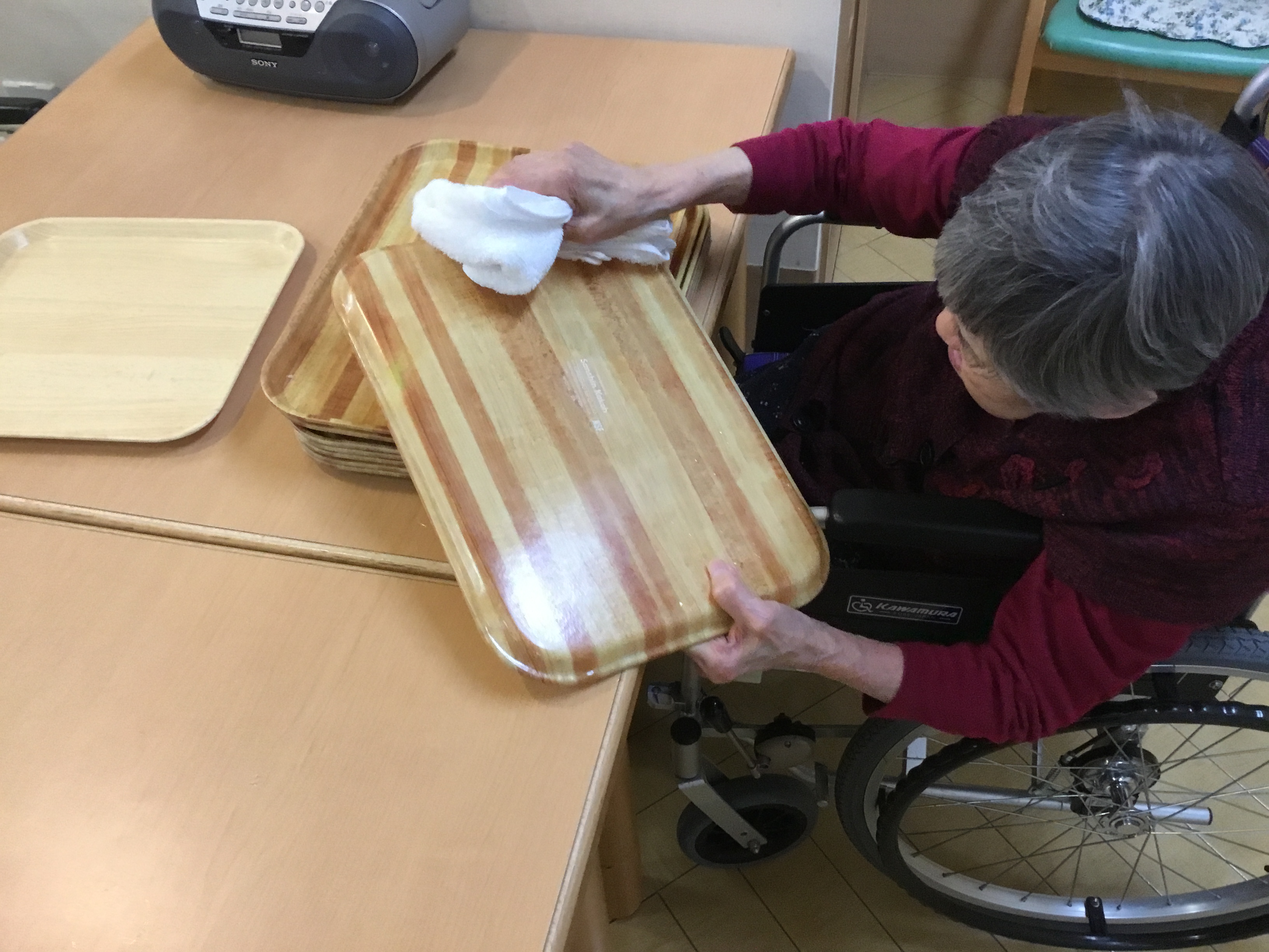 食器洗いやお盆拭き、洗濯物たたみ等さまざまなことをしている様子を撮影させていただきました。