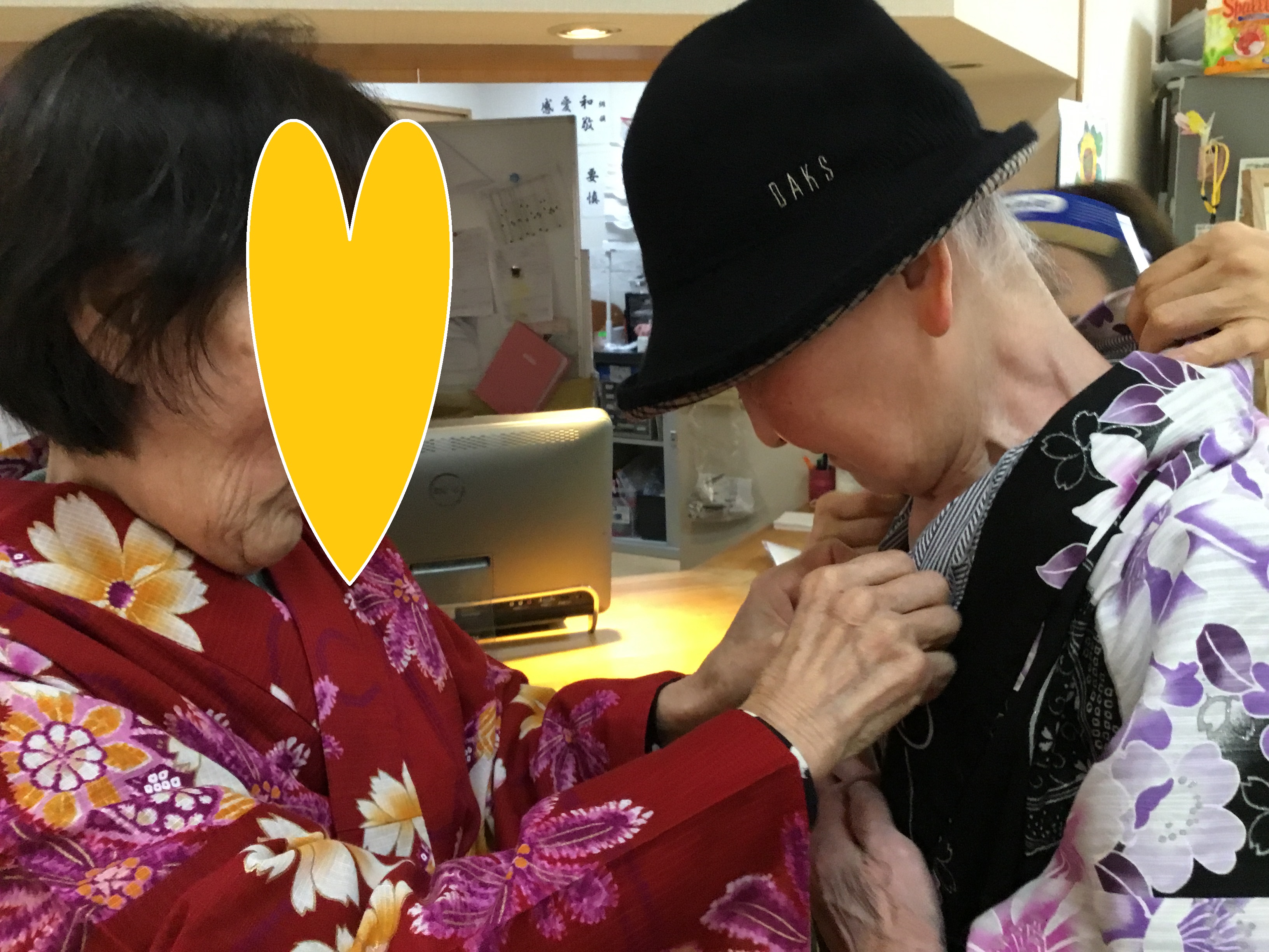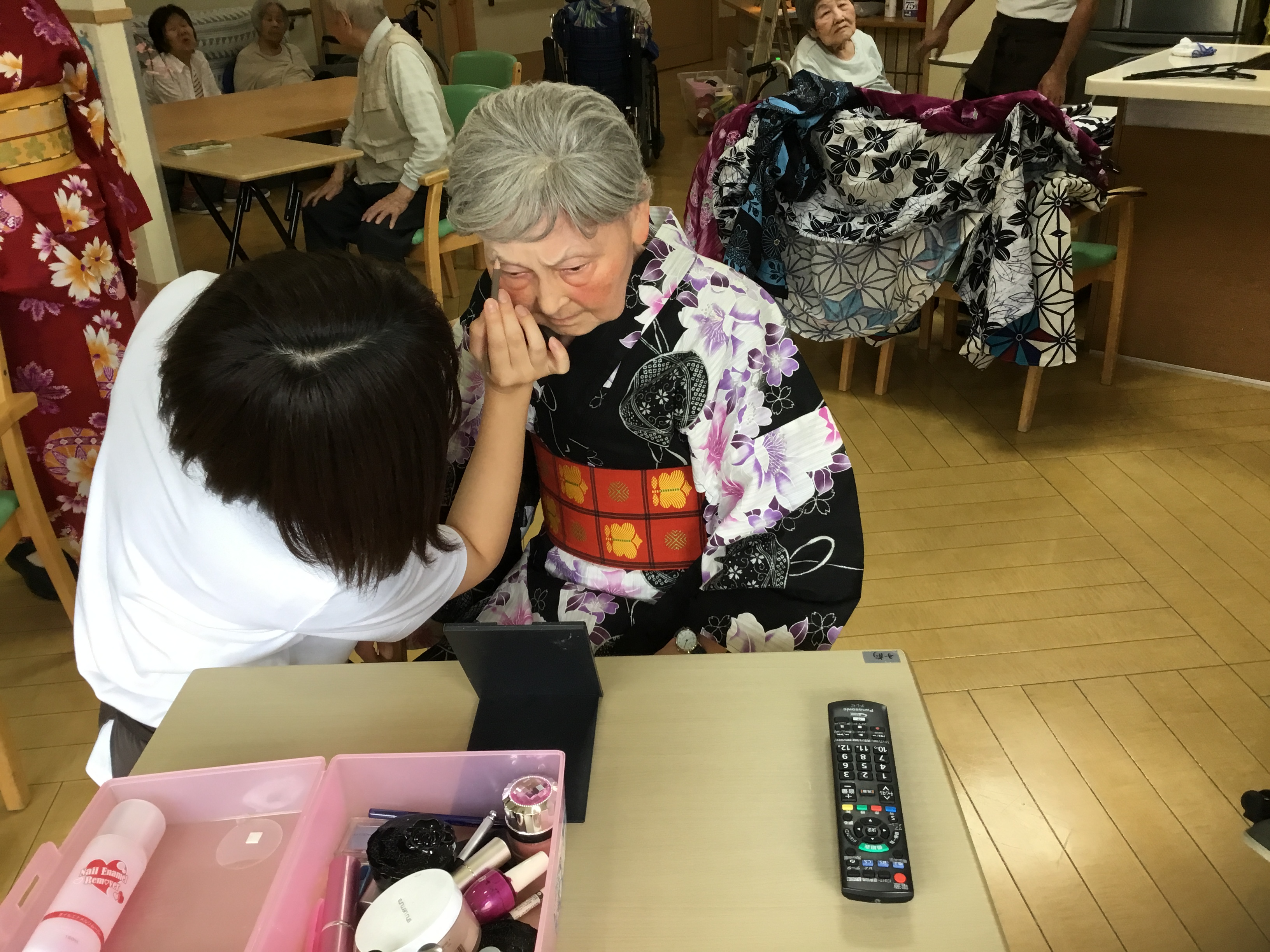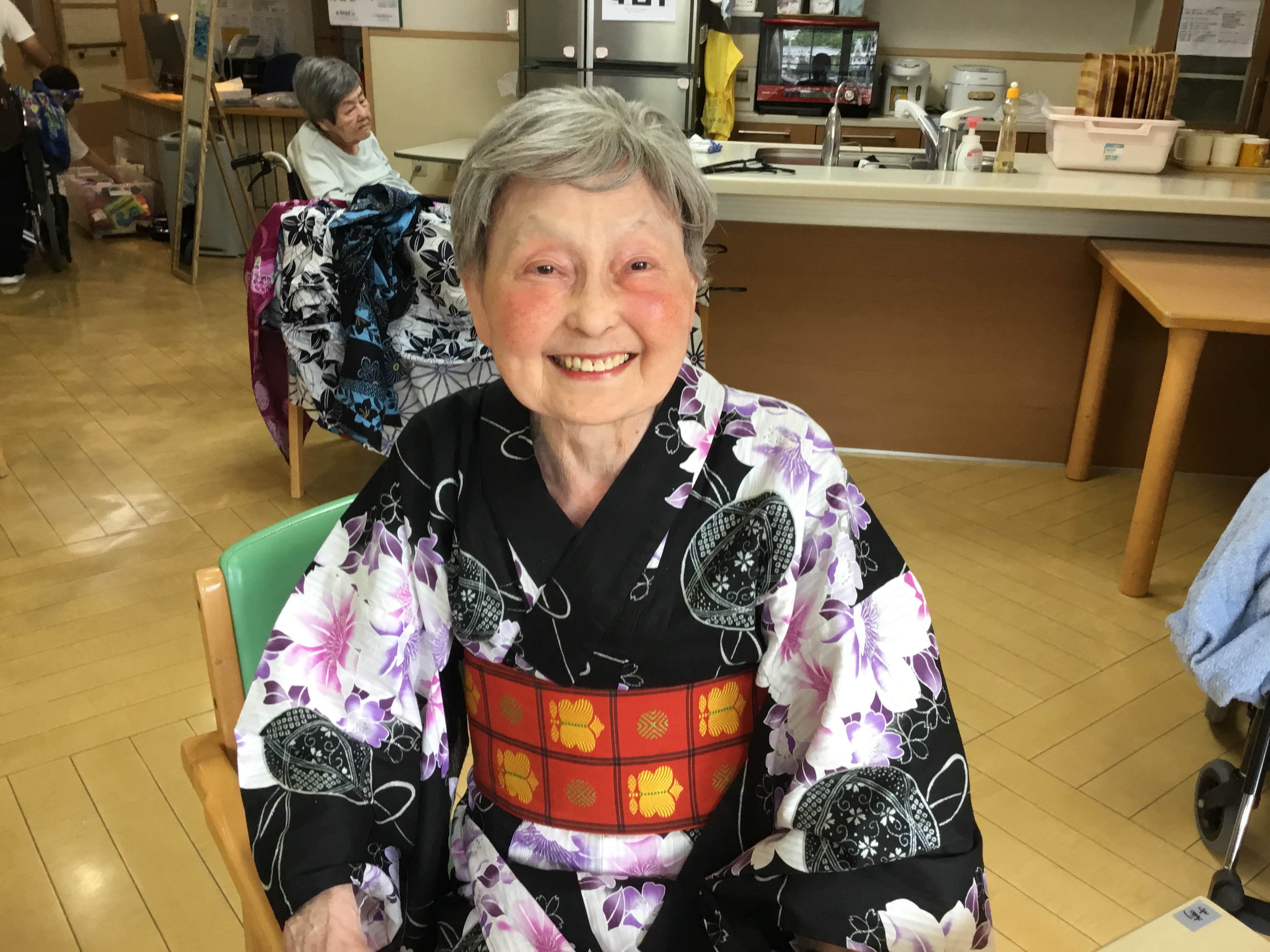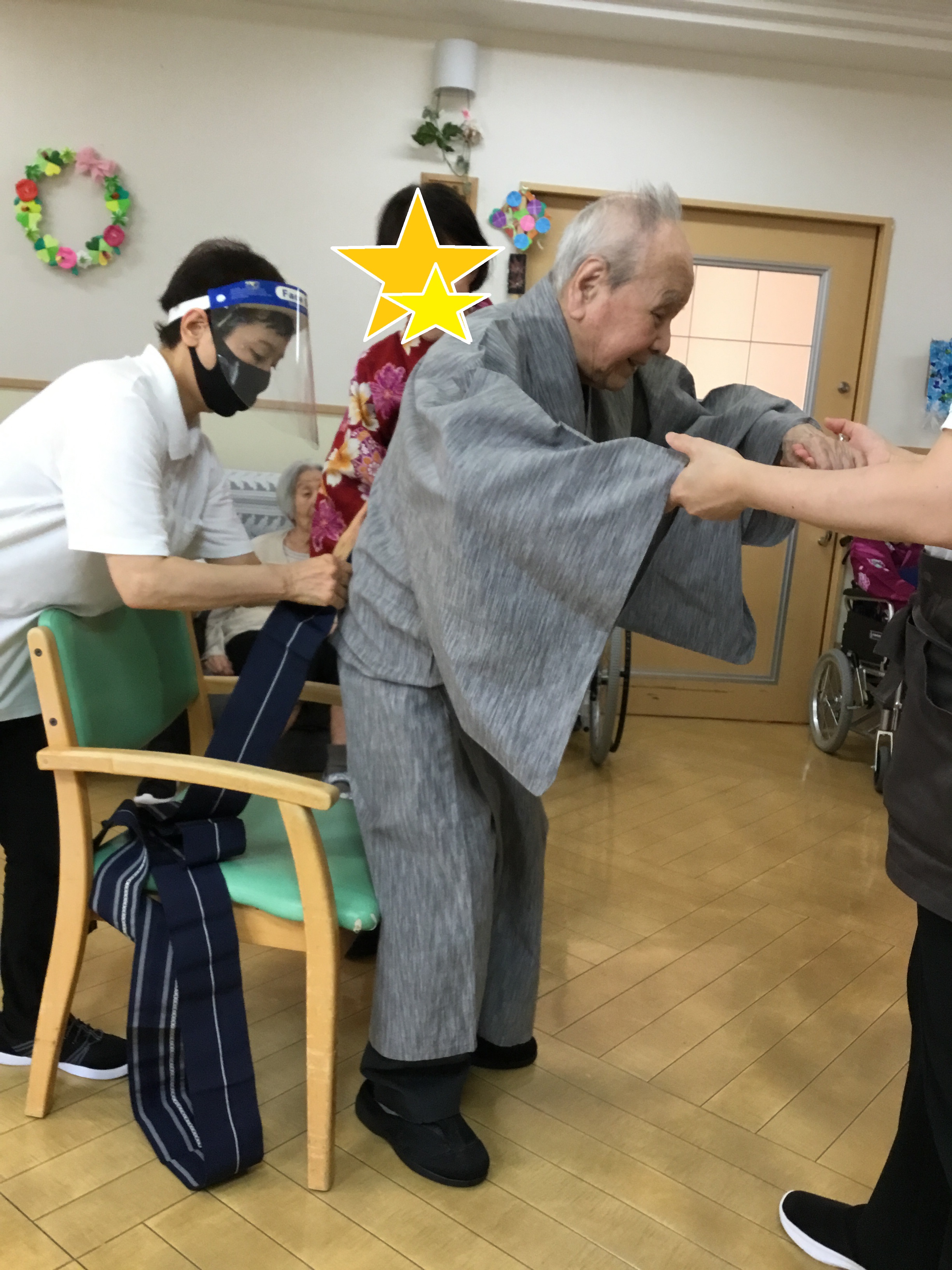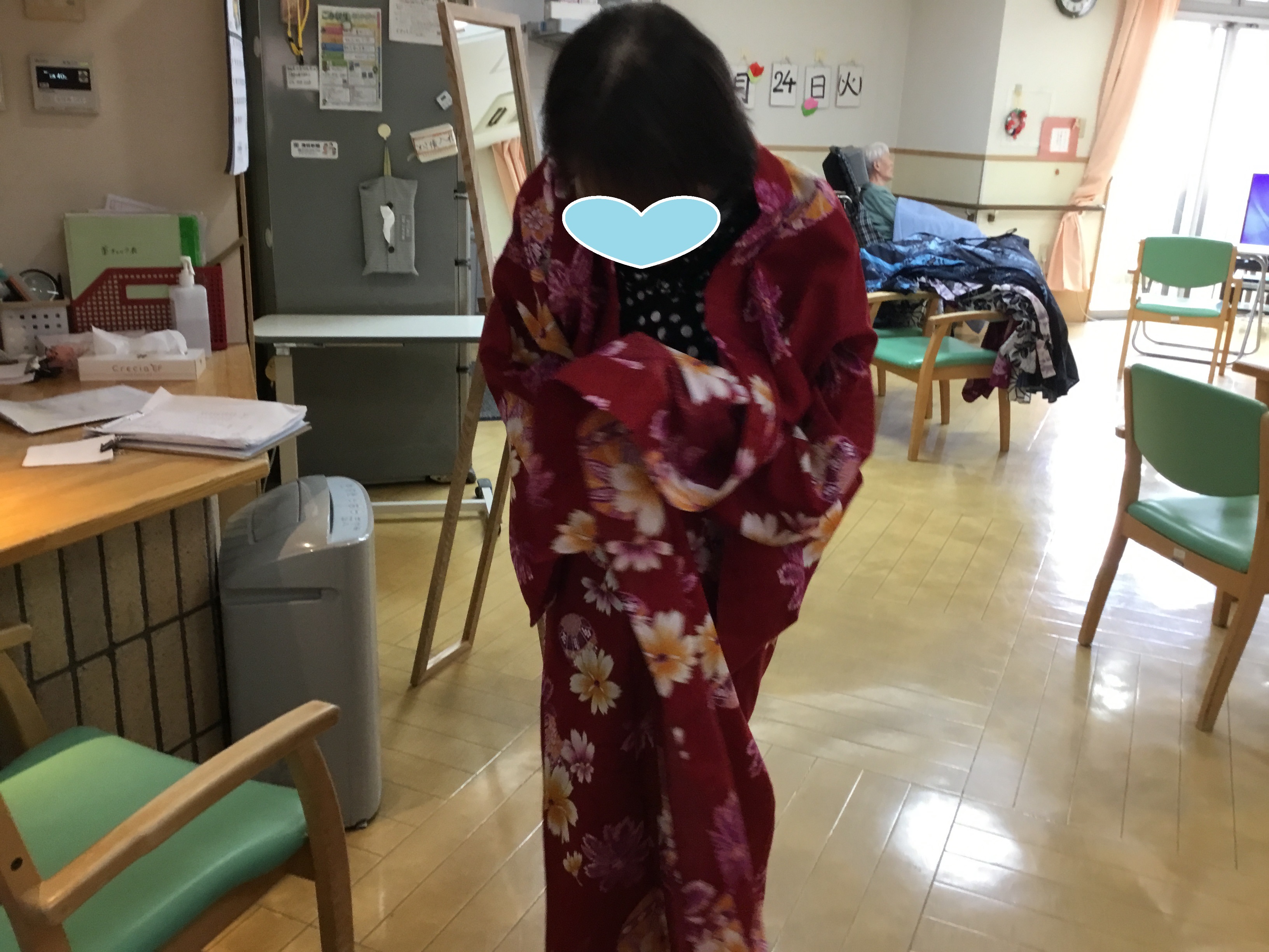 皆さま こんにちは◎ お待たせいたしました! 今回は、3Fでの着付けレクの様子について お伝えさせて頂きます♪ ---------------------------------------------------------------------- まずはお化粧から☆ お化粧道具をお渡しすると 慣れた手つきでササッとお化粧◎ IMG_6793.JPG 慣れた手つきでお化粧されていました♪ 何気ないことですが、 毎日きちっとお化粧されていた方だったんだなぁと 新しい発見ができ、とても嬉しかったです。 ご自分でのお化粧が難しい方には 職員がお化粧させて頂きました★ IMG_6832.JPG お化粧が終わり、浴衣を選んで... と、お声掛けする前に「私これがいいわ!」と 職員が言い終わる前に選ばれていました(笑) IMG_6805.JPG IMG_6816.JPG 浴衣を見ているお顔は 本当にキラキラしていて楽しそうでした☆ ご利用者様同士で 「ここ、襟はこうした方がええよ。」と 直されていたり、帯締めをお手伝いして下さったり! IMG_6823.JPG IMG_6900.JPG 最初はお化粧を拒まれていた方も、 いざ浴衣を着ると「やっぱり私もして!」と 話して下さり... IMG_6844.JPG IMG_6848.JPG 満足して頂けました(*^o^*) IMG_6904.JPG 車椅子の方にも着て頂き、 ほんのり笑顔を見せて下さり 喜んで頂けました♪ 「私は見てる方がいい!」と 全ご利用者様、着て頂くことは出来ませんでしたが、 皆様のお姿を見て「綺麗なあ!」と 楽しんで頂くことはできました★ IMG_6931.JPG 職員も着付けしてもらい記念撮影◎ 良くお似合いです* 皆様とってもキラキラされていて、 嬉しく楽しい気持ちになりました!! 以上、3Fでの着付けレクの様子でした♪