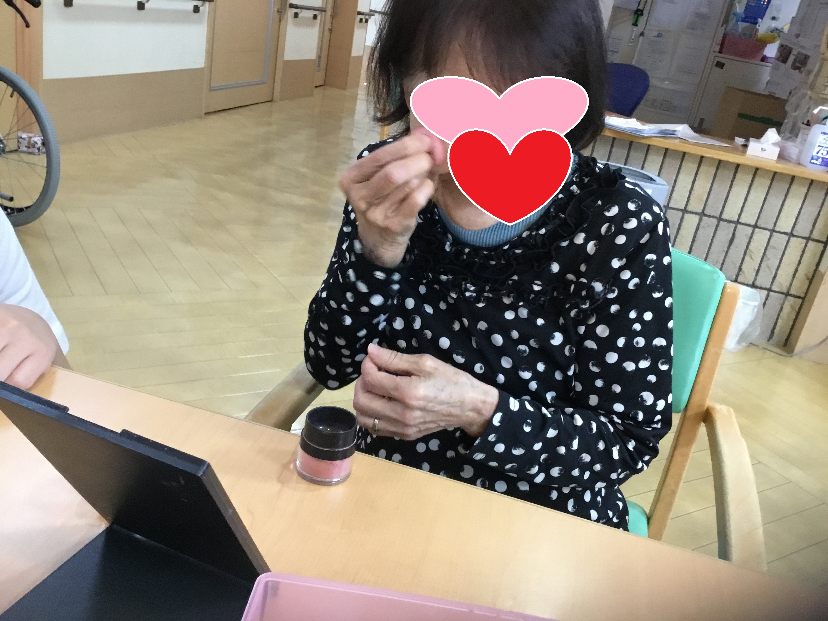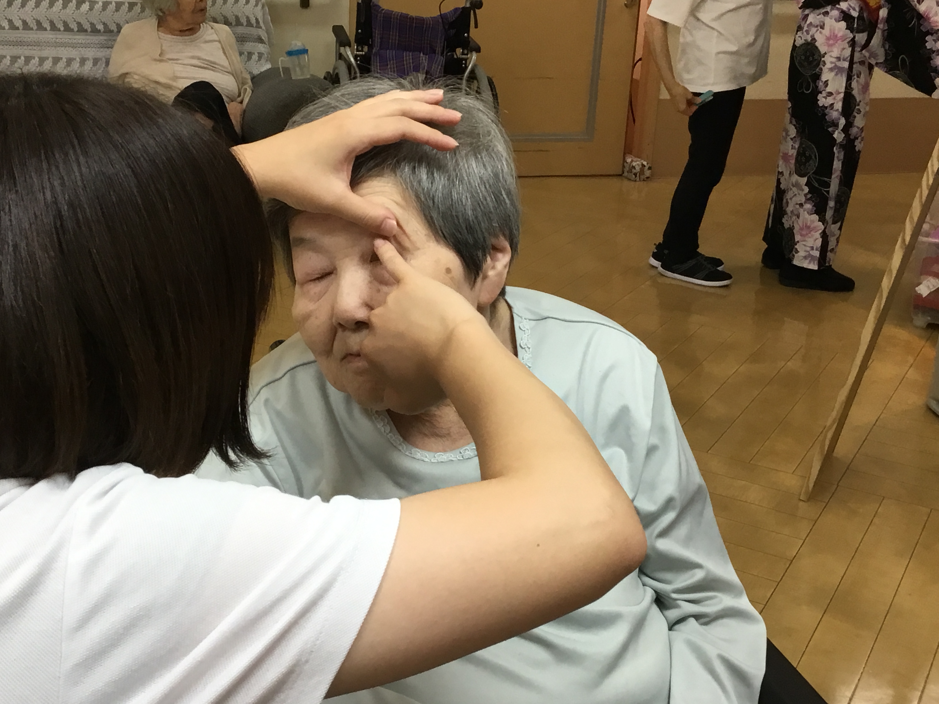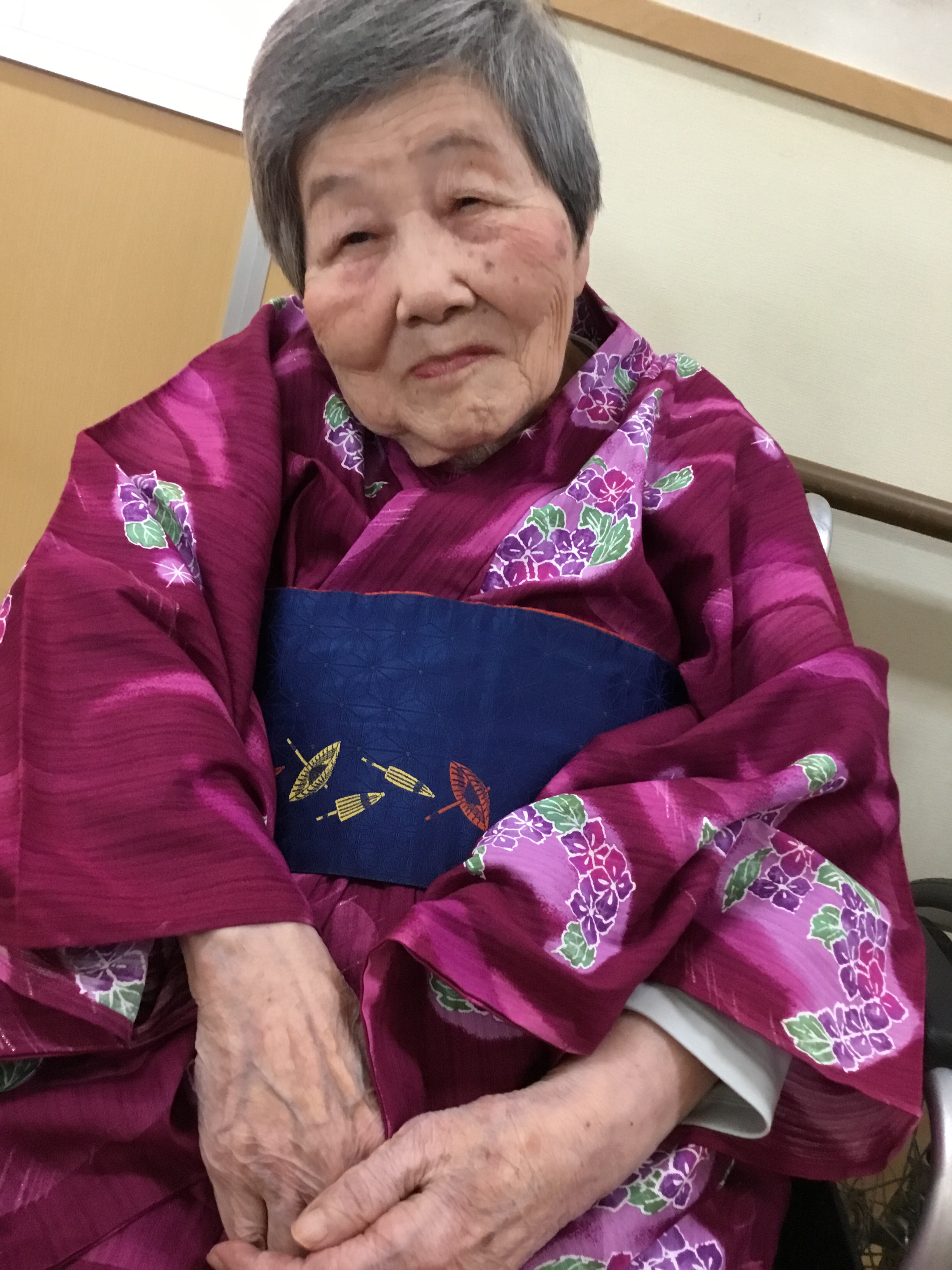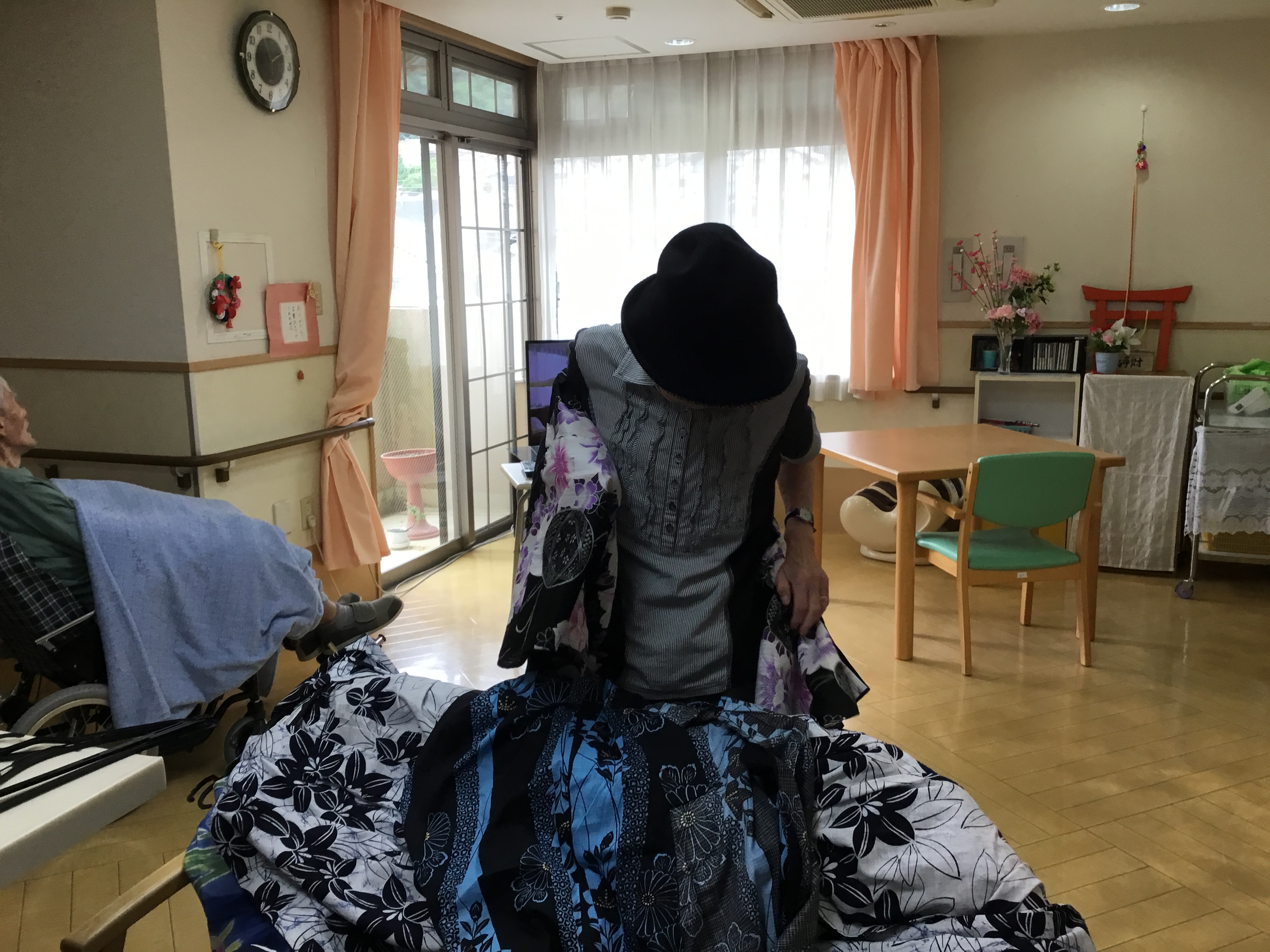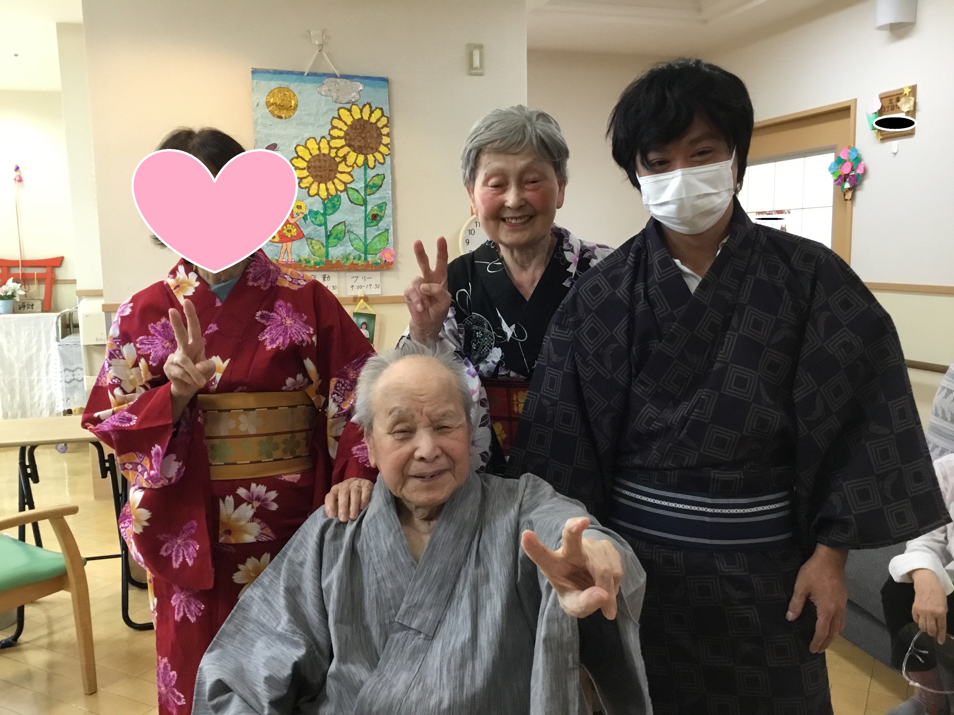 皆さま こんにちは◎ お待たせいたしました! 今回は、3Fでの着付けレクの様子について お伝えさせて頂きます♪ ---------------------------------------------------------------------- まずはお化粧から☆ お化粧道具をお渡しすると 慣れた手つきでササッとお化粧◎ IMG_6793.JPG 慣れた手つきでお化粧されていました♪ 何気ないことですが、 毎日きちっとお化粧されていた方だったんだなぁと 新しい発見ができ、とても嬉しかったです。 ご自分でのお化粧が難しい方には 職員がお化粧させて頂きました★ IMG_6832.JPG お化粧が終わり、浴衣を選んで... と、お声掛けする前に「私これがいいわ!」と 職員が言い終わる前に選ばれていました(笑) IMG_6805.JPG IMG_6816.JPG 浴衣を見ているお顔は 本当にキラキラしていて楽しそうでした☆ ご利用者様同士で 「ここ、襟はこうした方がええよ。」と 直されていたり、帯締めをお手伝いして下さったり! IMG_6823.JPG IMG_6900.JPG 最初はお化粧を拒まれていた方も、 いざ浴衣を着ると「やっぱり私もして!」と 話して下さり... IMG_6844.JPG IMG_6848.JPG 満足して頂けました(*^o^*) IMG_6904.JPG 車椅子の方にも着て頂き、 ほんのり笑顔を見せて下さり 喜んで頂けました♪ 「私は見てる方がいい!」と 全ご利用者様、着て頂くことは出来ませんでしたが、 皆様のお姿を見て「綺麗なあ!」と 楽しんで頂くことはできました★ IMG_6931.JPG 職員も着付けしてもらい記念撮影◎ 良くお似合いです* 皆様とってもキラキラされていて、 嬉しく楽しい気持ちになりました!! 以上、3Fでの着付けレクの様子でした♪