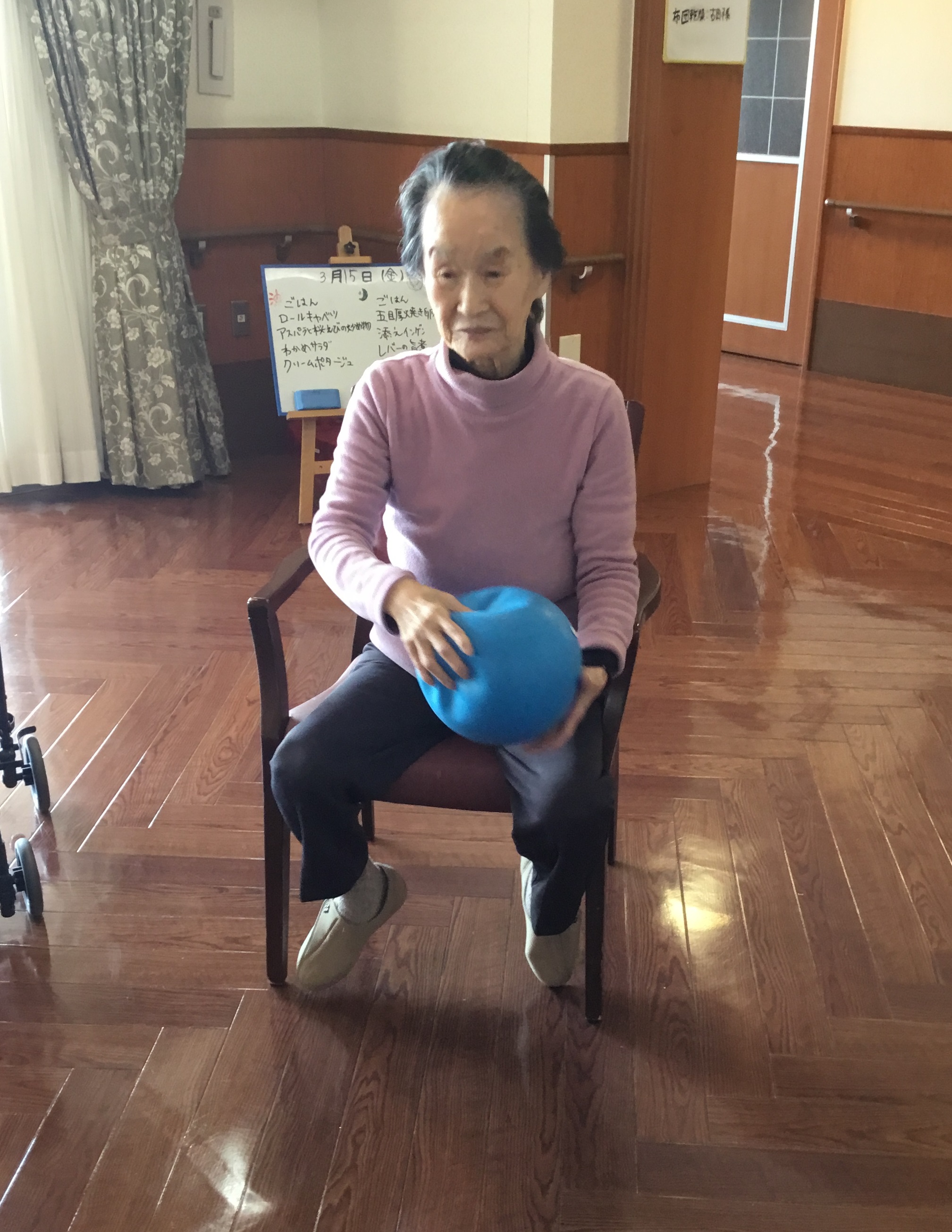 こんにちは(^^) だんだんと暖かくなってきましたね!! 桜が少しずつ開花している地域もあるそうです! お花見をしながら、飲むお酒 夜桜をみながら、飲むお酒 最高ですね☆☆ あぁ、飲むことしか考えてない・・・(^_^;)(笑) 桜がメインなのに・・・(笑) 毎年、お花見のタイミングを逃して しまっているので、今年こそ行きたいと思います♪ 前置きが長くなってしまい、すみませんm(__)m ブログを書いていると楽しくなってきて、ついつい 自分の話しをしてしまいます(笑) では、本題へ! 最近の日常の様子をお伝えします! 行事であったり、レクリエーション、個別リハビリも 日常的に行っていますが体操もしています(^^) 体操をしてから、ボールを使った運動もしました!