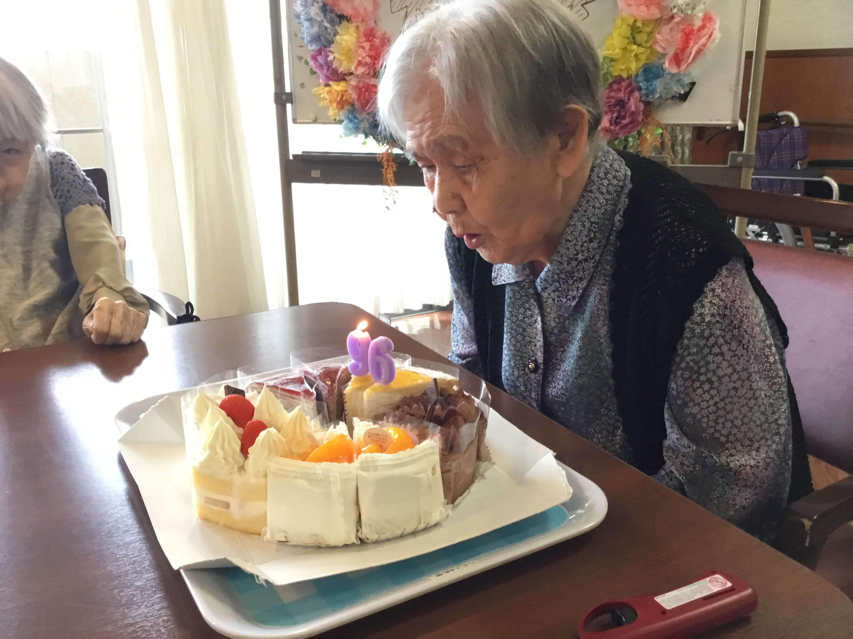 ロウソクの火が消えたと同時に皆さんからの温かい拍手と お祝いの言葉に包まれました(^^)/ 職員からの色紙のプレゼントを済ませ お待ちかねの甘ーいケーキを召し上がられました!! いつも素敵な笑顔をありがとうございます!! これから先も元気でお過ごしください(^^)/