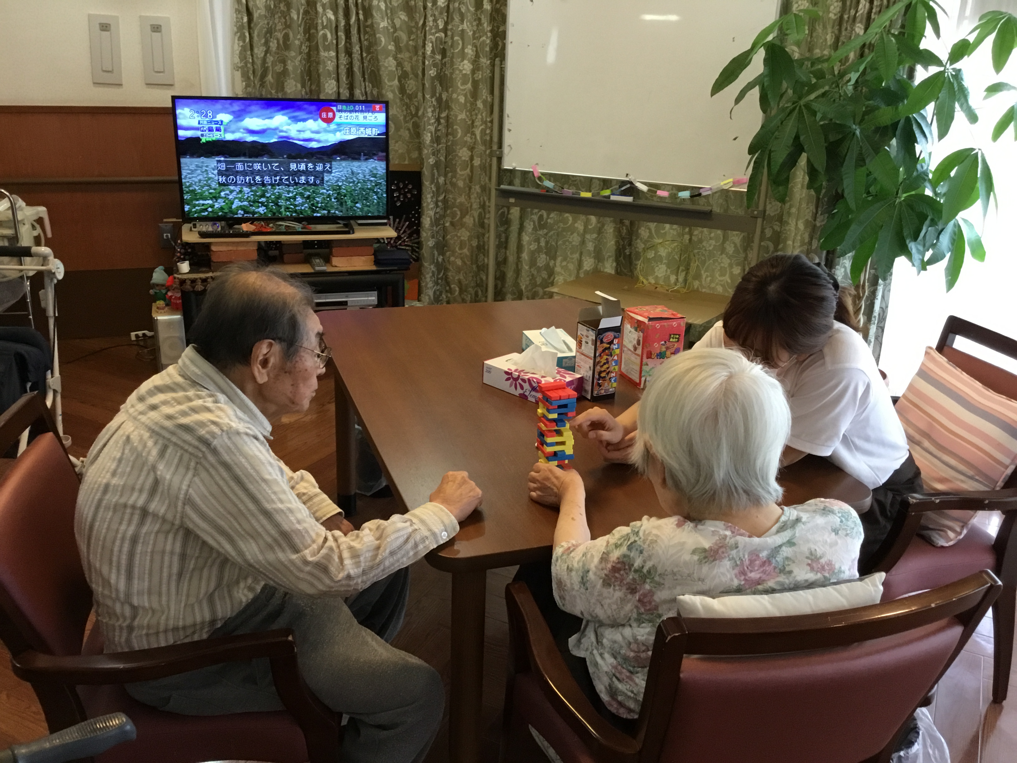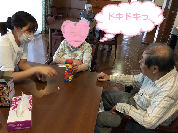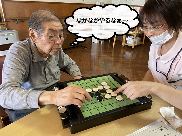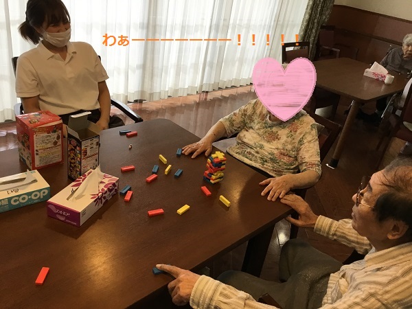 こんにちわ!!シニアホーム飯盛ブログ担当です! 段々と気温も下がってきて過ごしやすい季節になってきました!! ...気づいたらすごく寒くなってしまうんでしょうね(T_T) 季節の変わり目...体調に気を付けて過ごしていかなければなりませんね!! 本日のブログ内容はある日のシニアホーム飯盛の日常を覗いてみます!! まずは? IMG_5745 - コピー.JPG 職員と一緒にジェンガを楽しんでいます(^^) IMG_5746 - コピー.JPG 倒さないように慎重に...ドキドキ ガシャーーーーーーん!!!!!! IMG_5747 - コピー.JPG 残念!豪快に倒してしまいましたね!笑 心臓が飛び跳ねました!! 続いてはオセロ!! 職員と真剣勝負です?(^o^)/ IMG_6089 - コピー.JPG 白熱しています!!! IMG_6087 - コピー.JPG 勝負の結果は職員が惨敗しました... 参りましたm(_ _)m このご時世でなかなかお出かけなどの楽しいイベントはなくなってしまっていますが 皆さんの笑顔が見れて私達は幸せです(^^) 皆さんの笑顔を家族様にも届けていけるよう職員一同、精進してまいります!! 本日はここまでで失礼します(*^^*)