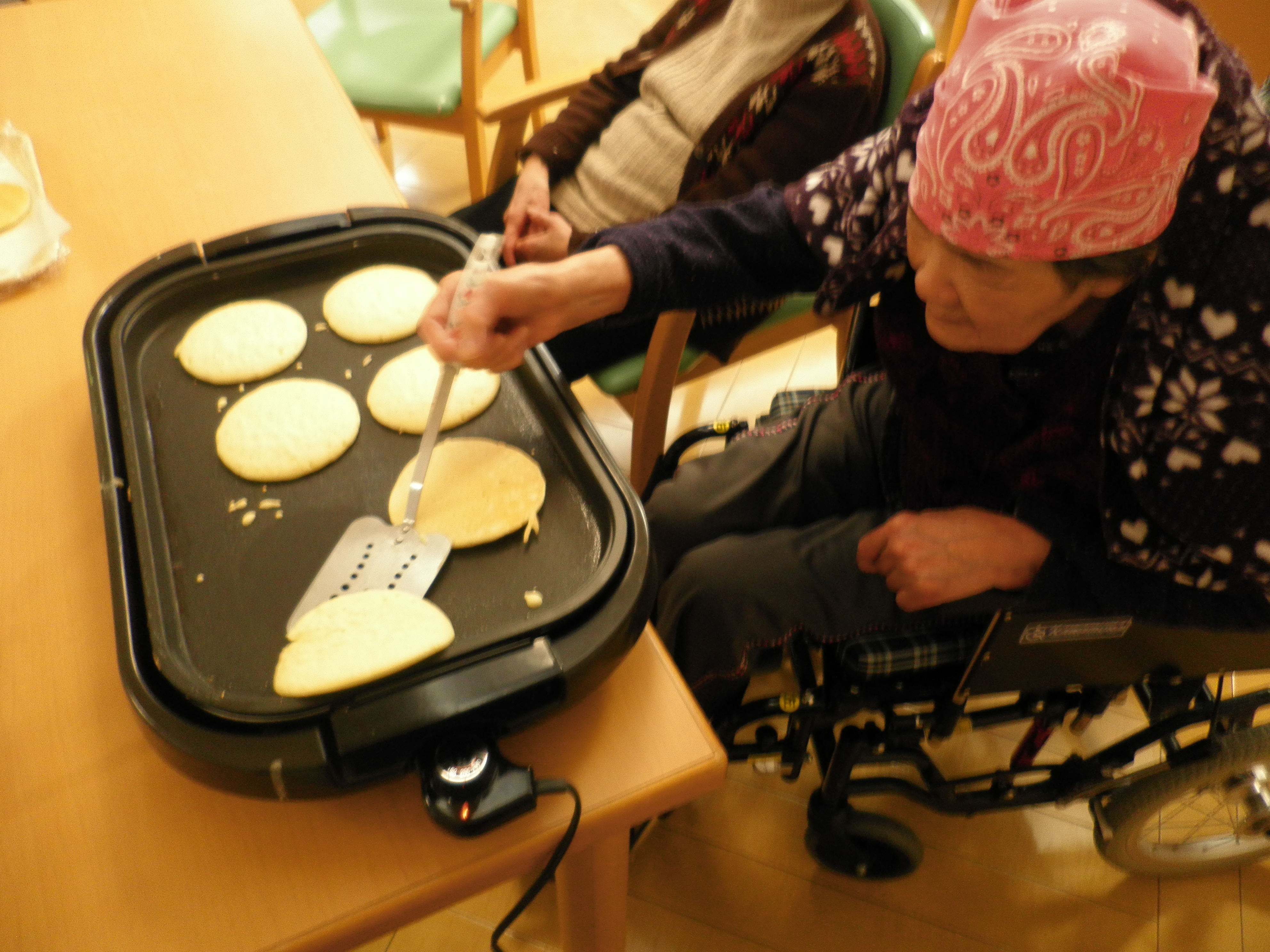 昔、お好み焼き屋で働いておられたと言うご利用者様が、器用に生地をひっくり返して下さいました!