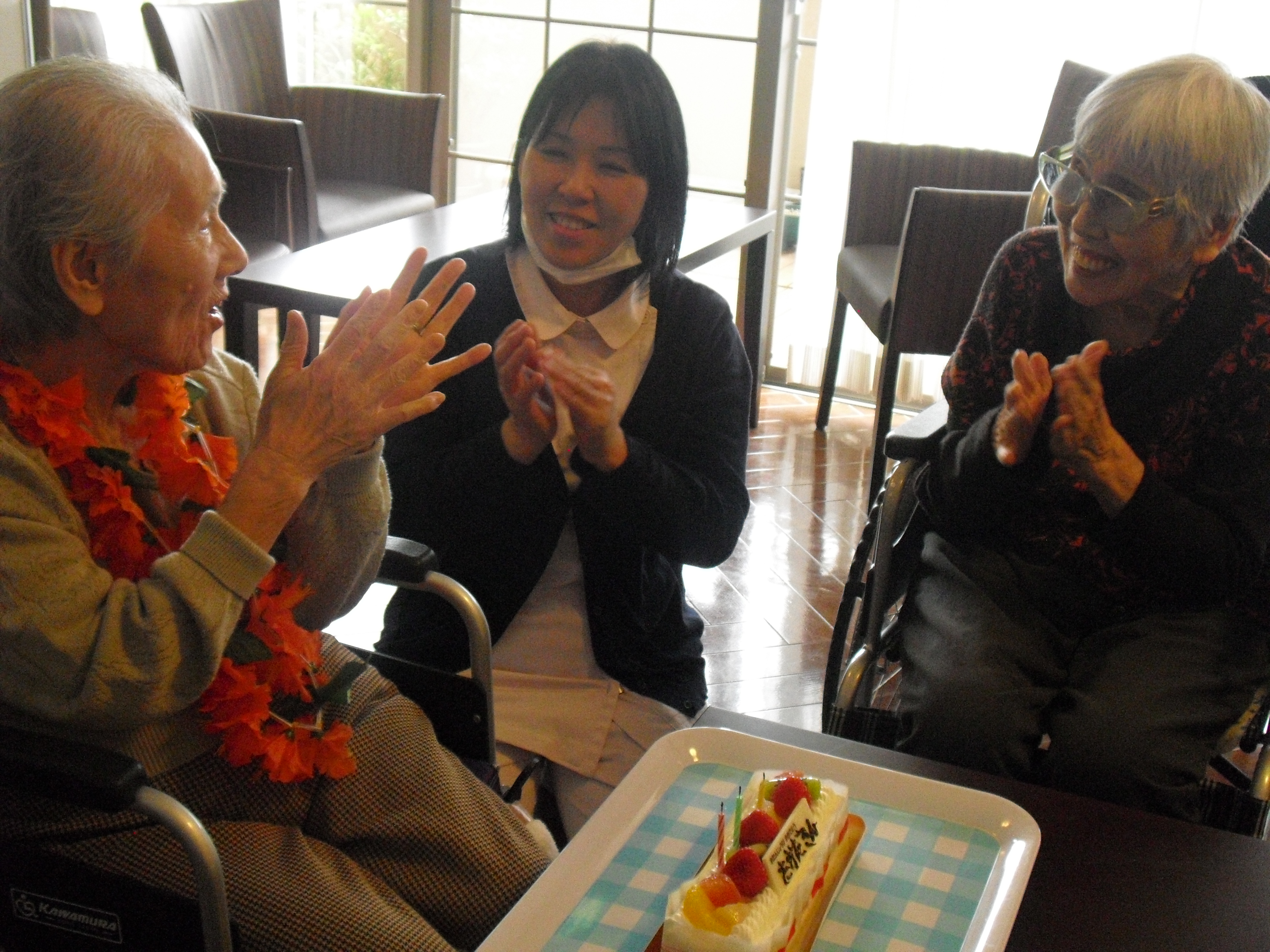 四月のお誕生日☆ 2015 4/11 スタッフブログ シニアホーム飯盛 2015年4月11日こんにちは!今月からブログ担当をさせて頂くことになった北口です☆今月、誕生日を迎えられる方を紹介させて頂きたいと思います。いつも笑顔で車椅子も器用に自走される利用者様(^o^)/スタッフ皆いつも元気を頂いてます♪お誕生日おめでとうございます!皆でお祝いさせて頂きました!(^^)! これからもたくさんの笑顔をみせて下さい☆ スタッフブログ シニアホーム飯盛