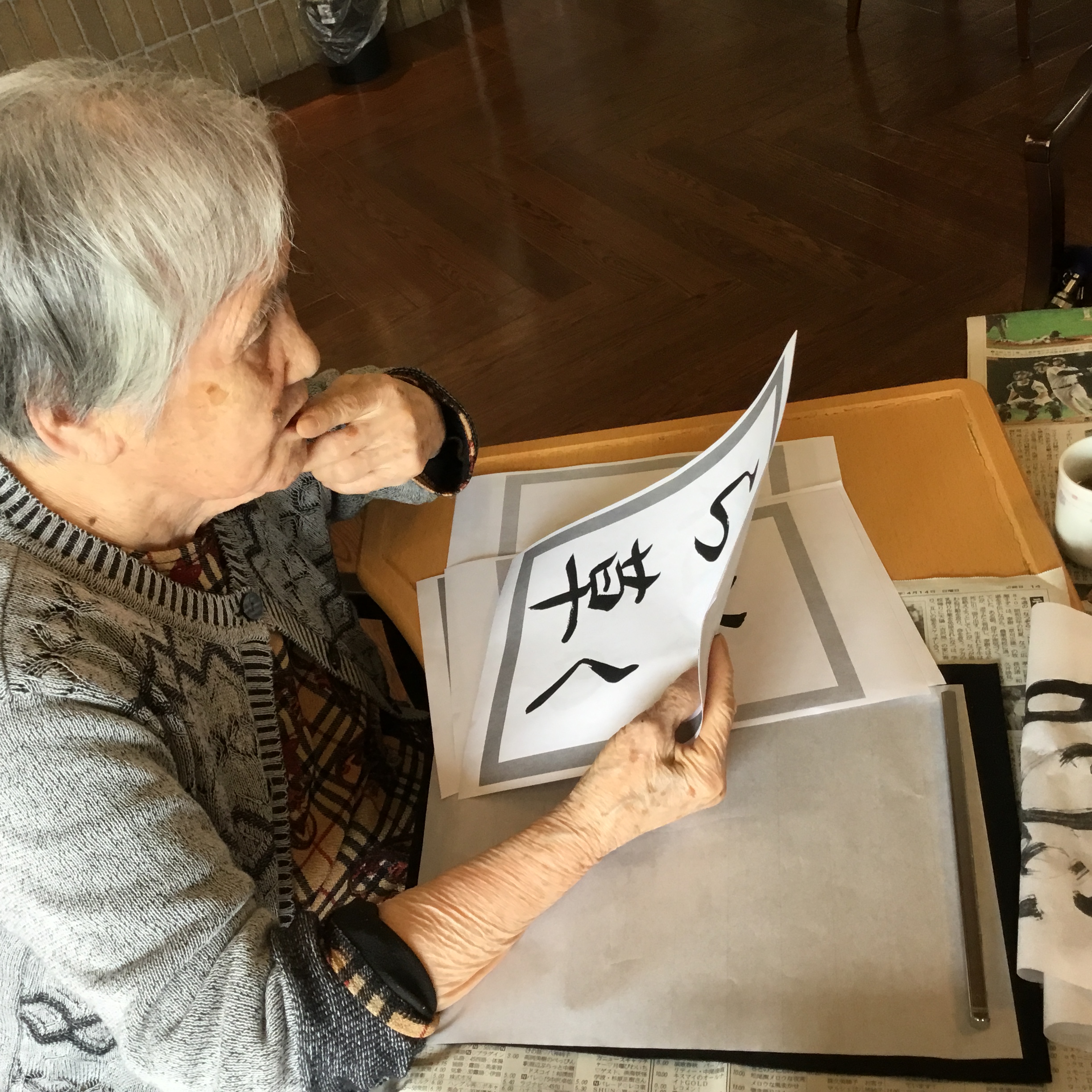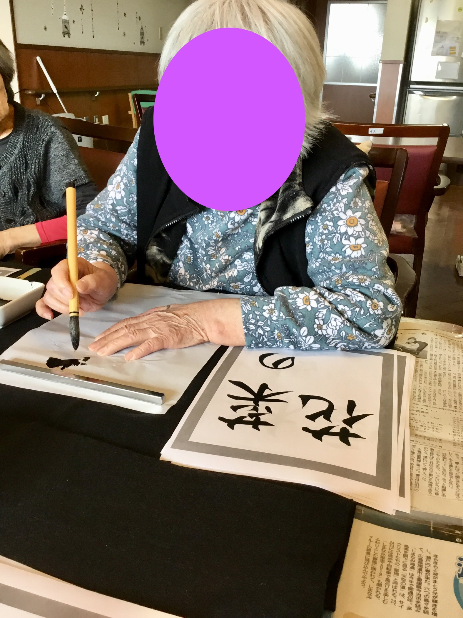 書道レク 2020 4/21 スタッフブログ シニアホーム飯盛 2020年4月21日 こんにちは!シニアホーム飯盛ブログ担当です(^^♪今回は、先日行いました書道レクの様子をお伝えします(*`・ω・)ゞお手本をみて熱心に取り組まれていますo(^▽^)oでき上がった作品は、裏打ちして掲示させて頂きました!コロナウイルスが落ち着きましたら、観に来て頂けますと幸いです(^^♪ スタッフブログ シニアホーム飯盛