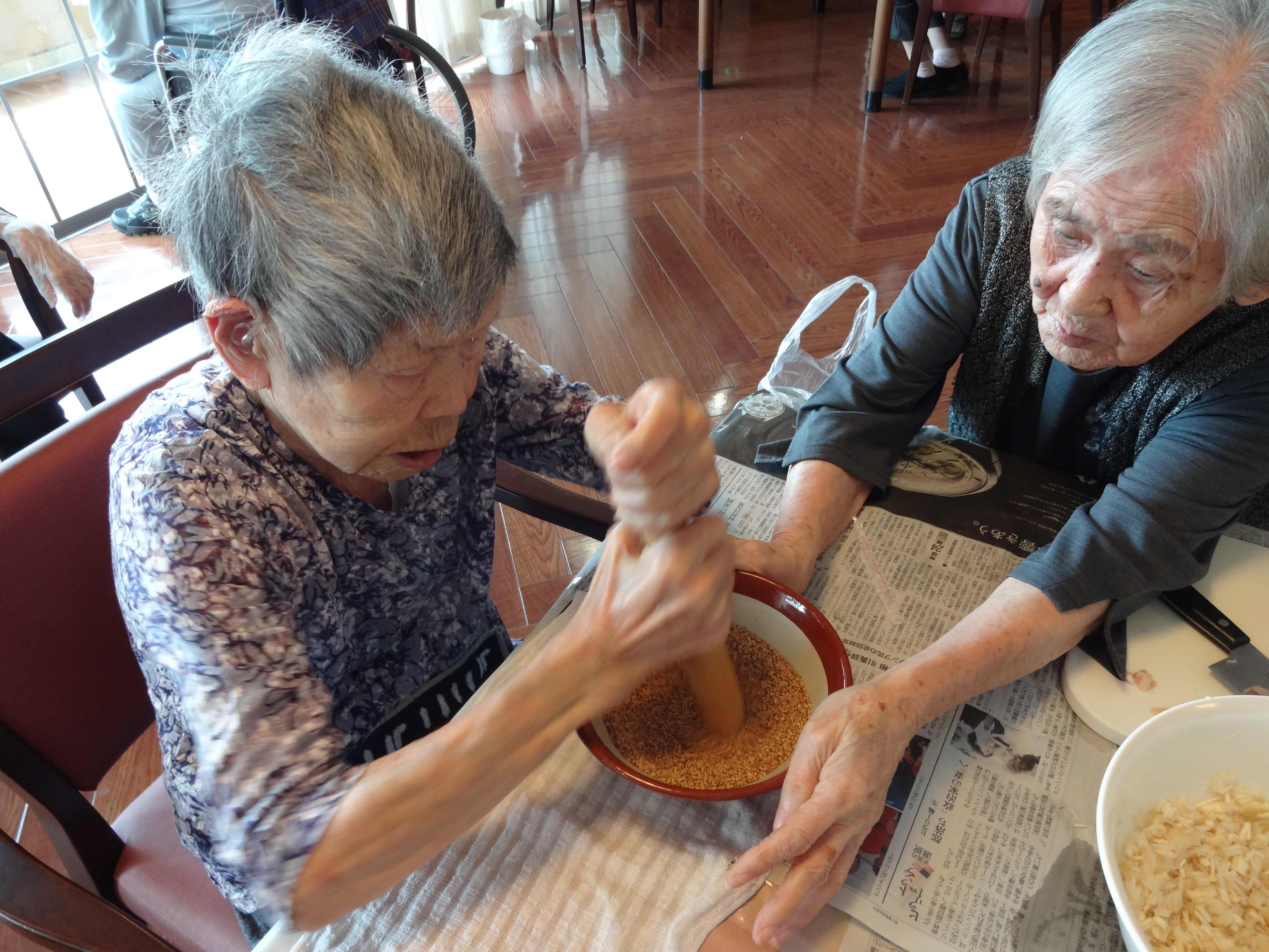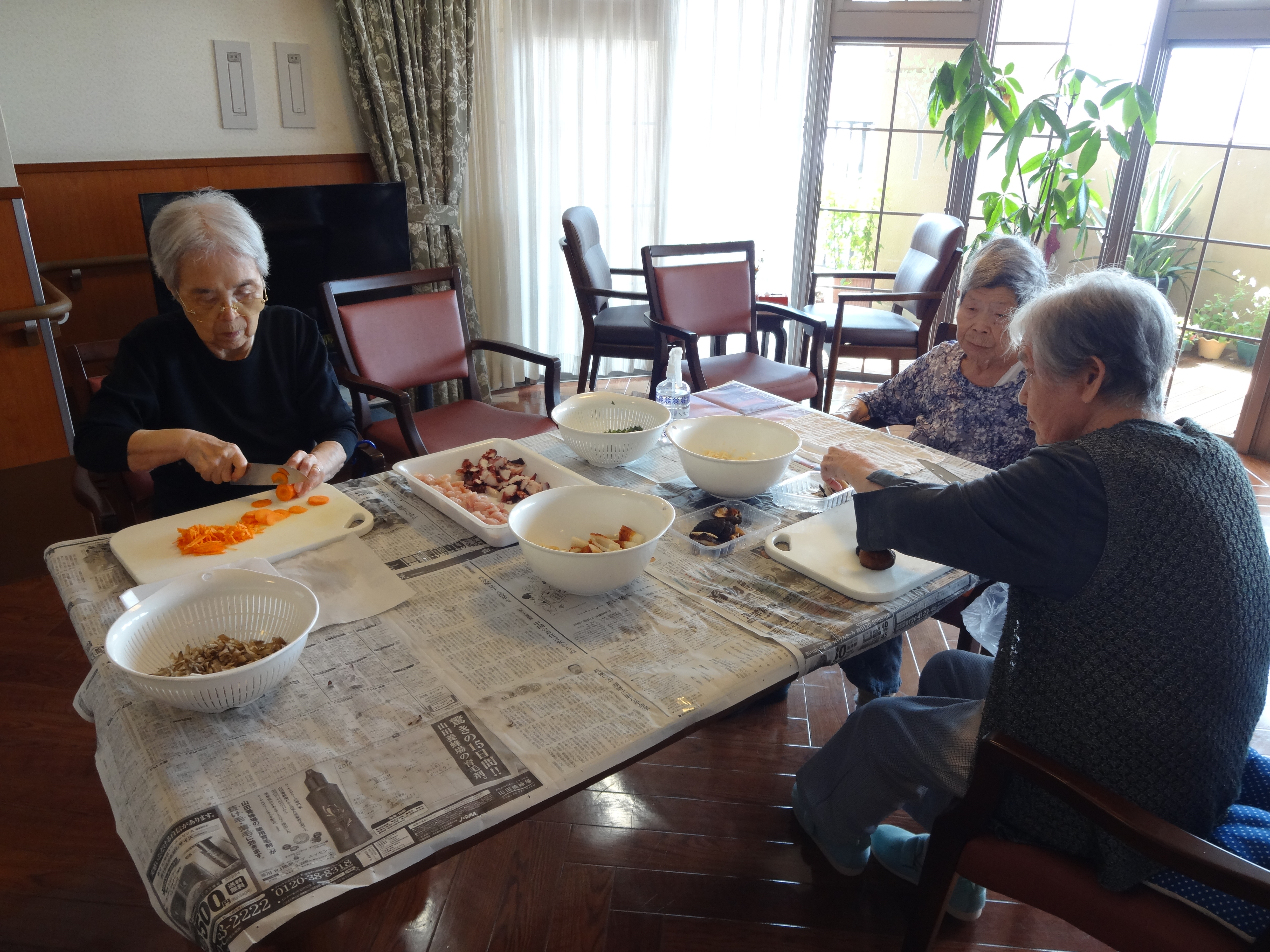 シニアホームでは秋の食材を取り入れ、皆様との交流もかねて一緒にご飯を作りました!!