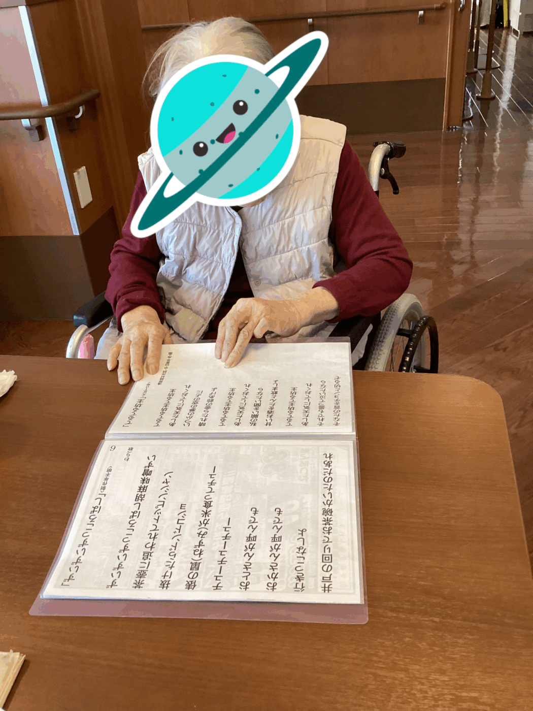 余暇時間は、童謡や演歌などの歌詞が書かれた本を見ながら