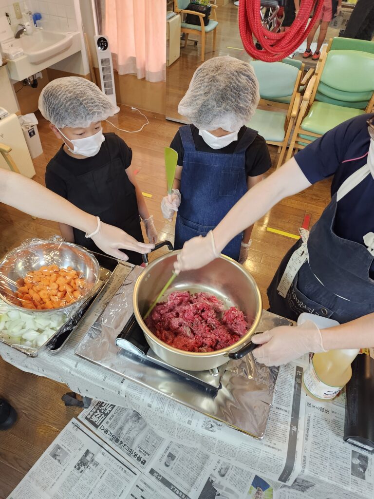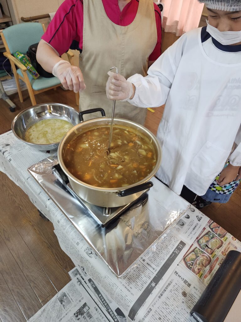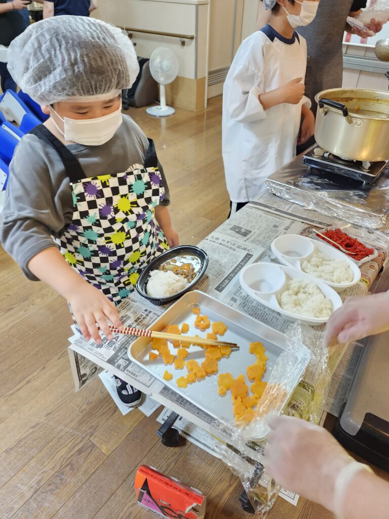 にんじんの型抜きやお米研ぎの他に、お肉や野菜を炒めたり、ルーが焦げないようにかき混ぜていただきました。