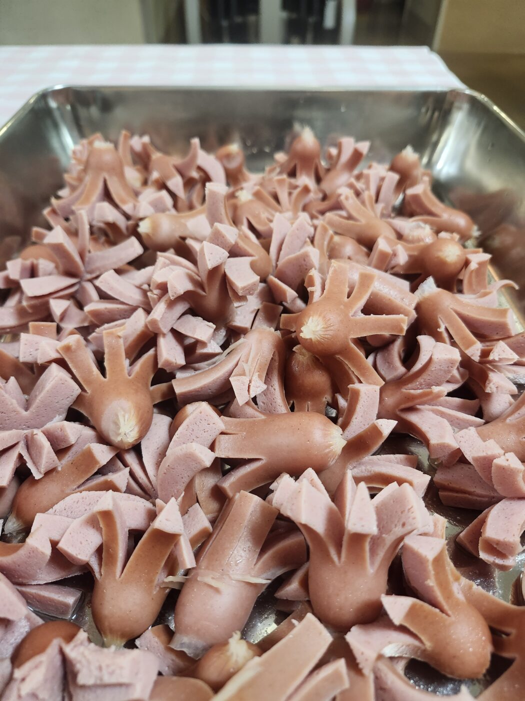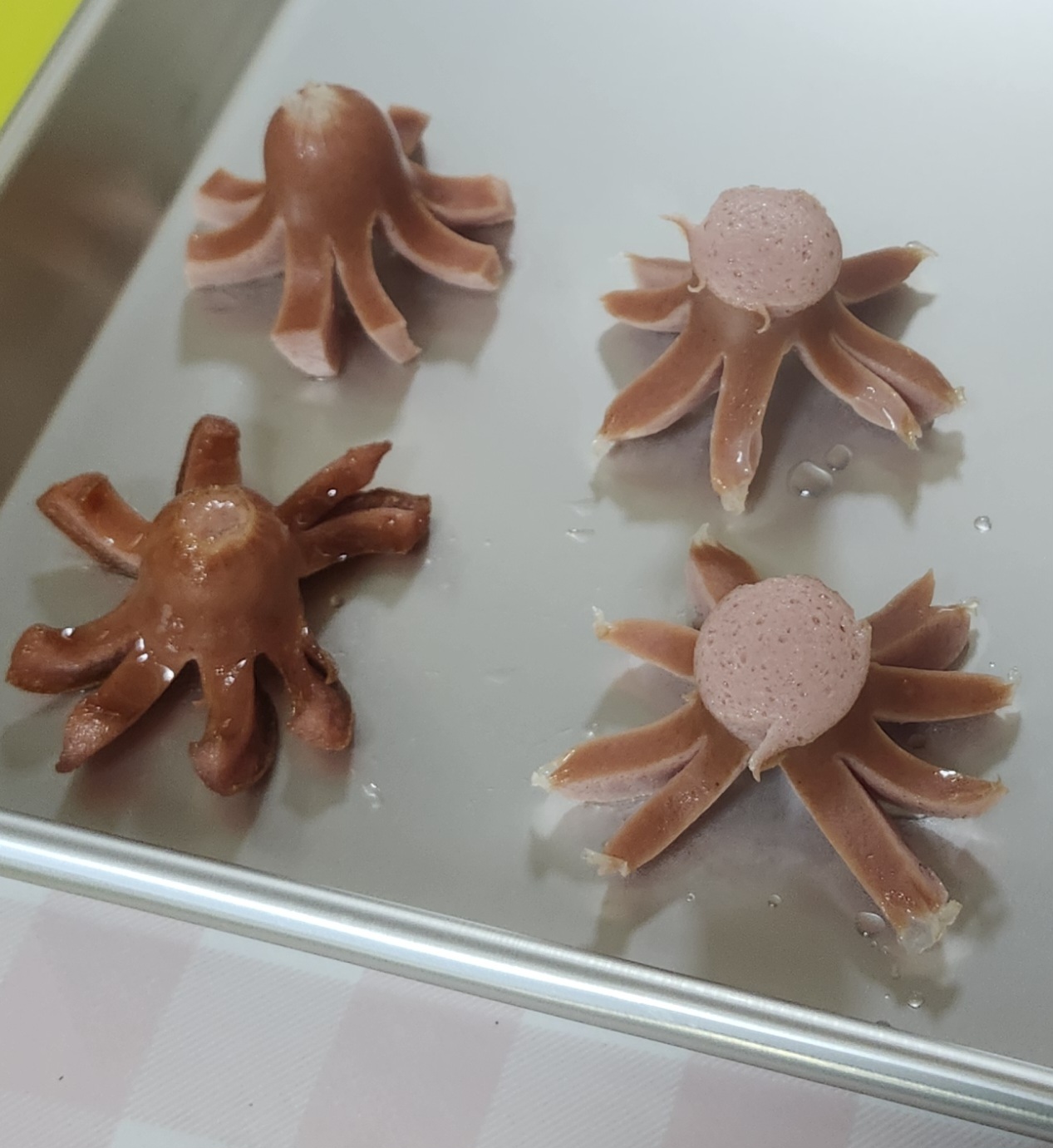 ウインナーをタコに整えて茹でたり焼いたりしていきます。中にはカニ型やヒトデ型にしたのもあったとかなんとか(*´艸`)