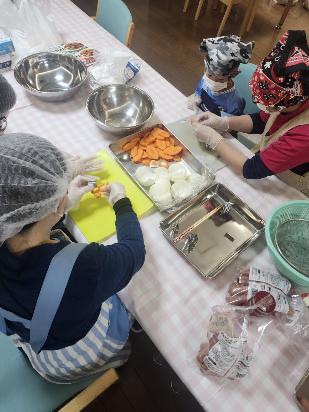 参加してくれた子達と野菜の型抜きやお米研ぎ、ウインナーの顔作りを一緒に行いました。