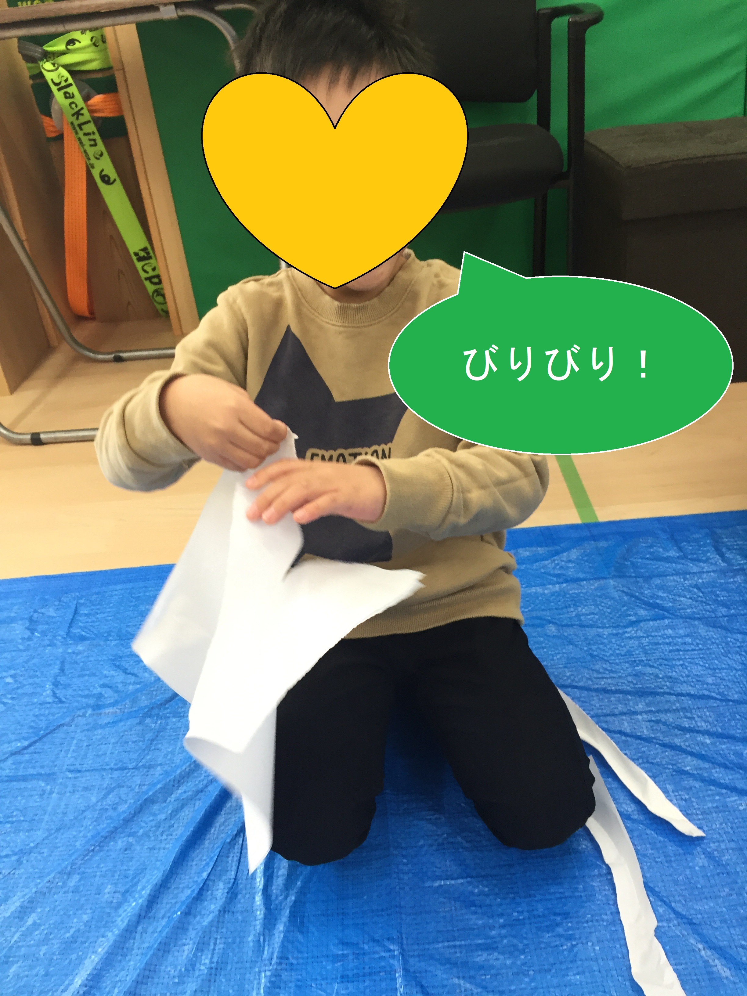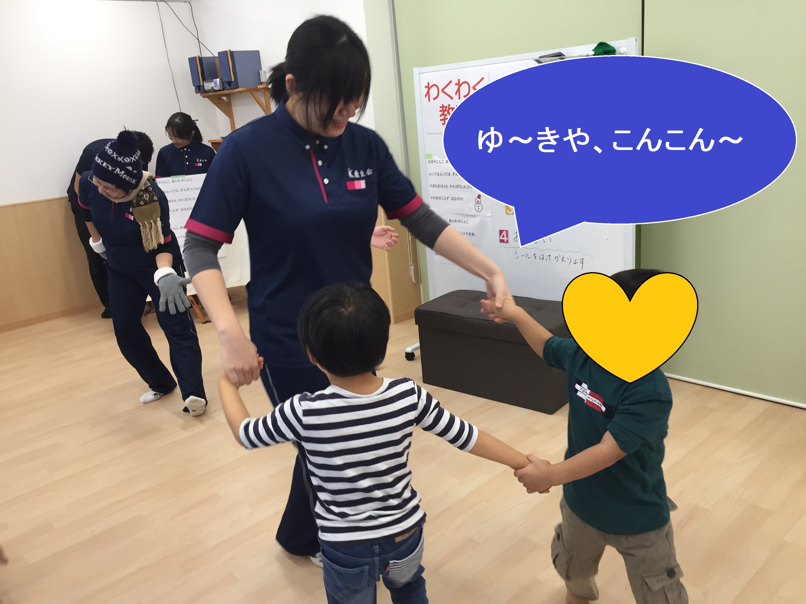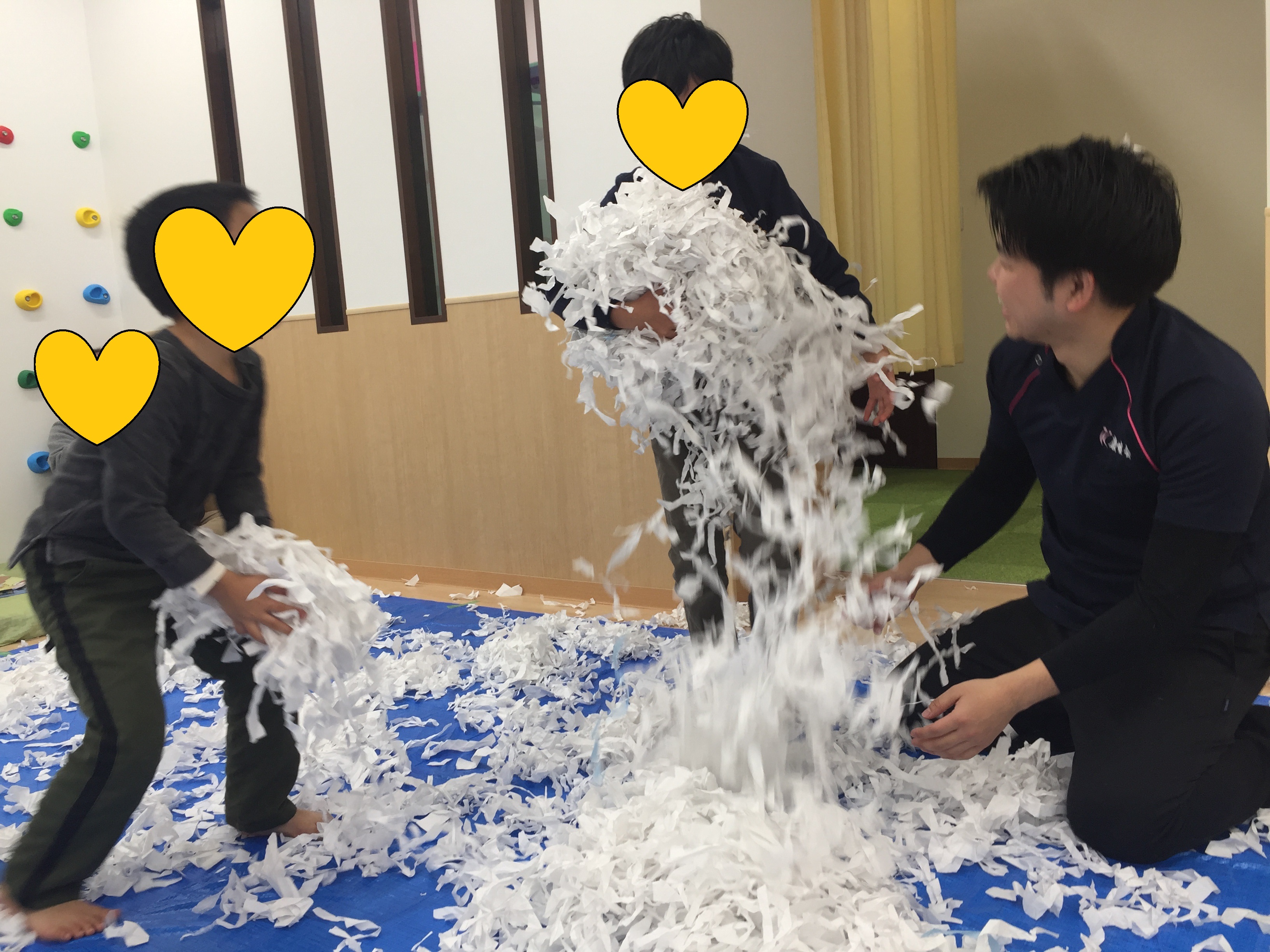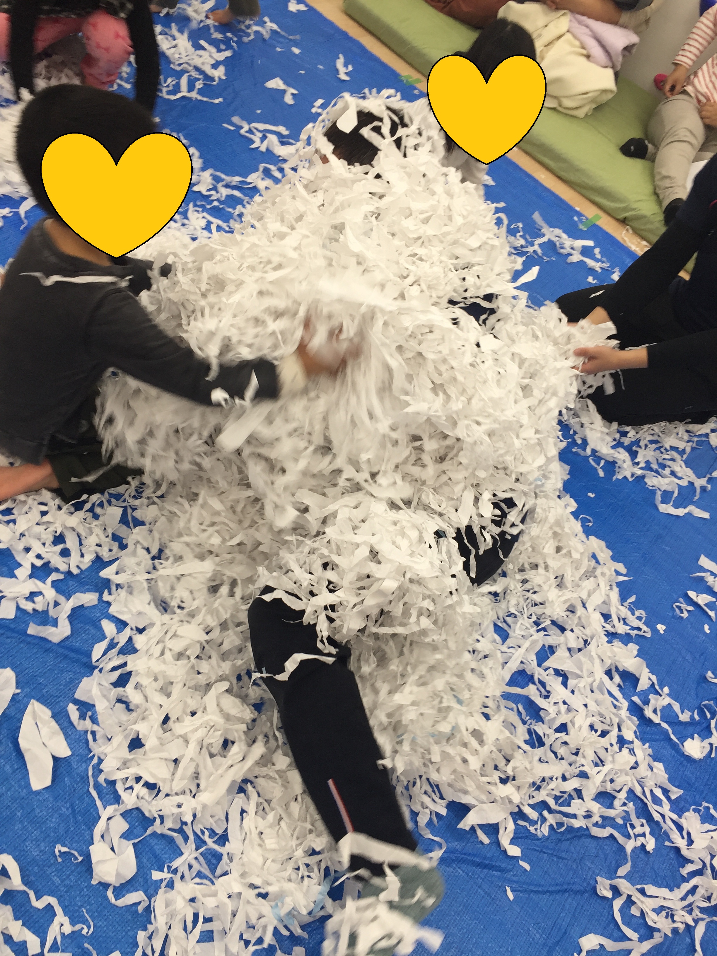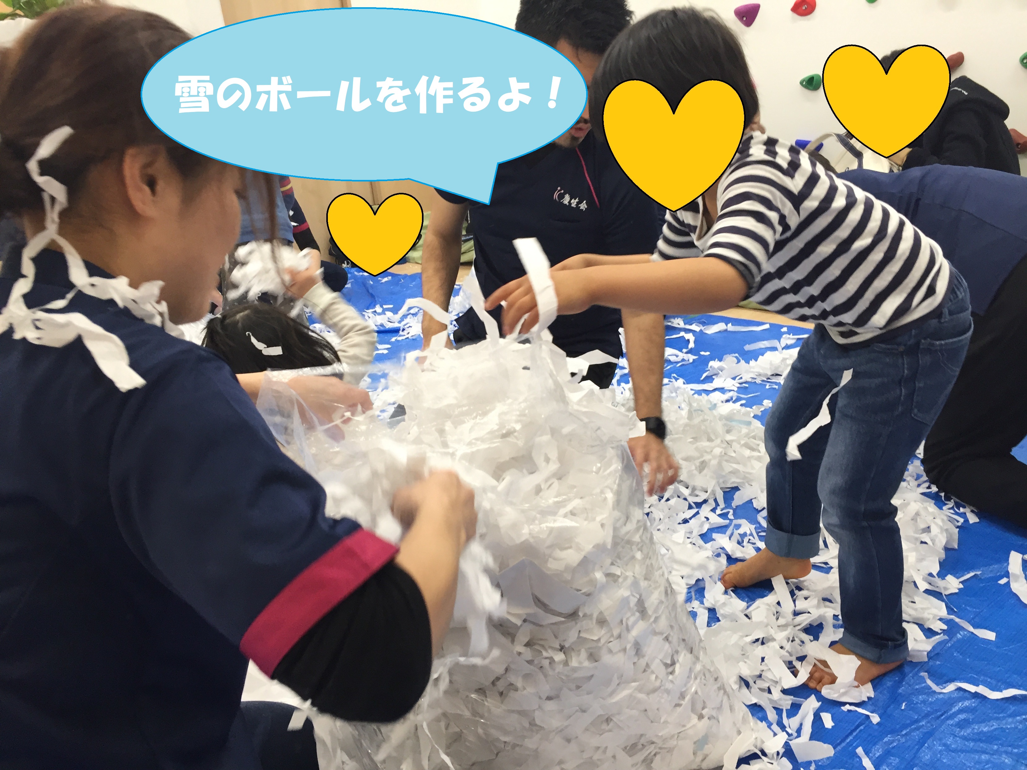 新年明けて最初のわくわく教室が1月25日にKIDSステージ鴻池で開催されました。今回のテーマは「雪遊び」でした。今年は暖冬で暖かい日が多いですね。大阪もお天気に恵まれる日が多く、雪はなかなか降らないので、本物の雪ではなく、半紙を雪に見立てて遊びます! まず、カエルの体操から始まり、しっかり準備運動をします。体が温まった後は、お待ちかね、雪遊びです。まずは、「雪やこんこ」を歌いながら、踊ります。みんな楽しそうに踊ってくれました。 IMG_1574.JPG IMG_1600.JPG そして、みんなにも雪遊びの準備を手伝ってもらいます。半紙を細く破って雪づくり。紙を破るって、とっても気持ちいいですね。 IMG_1881.JPG 雪が完成したら、先生たちが用意しておいた、たくさんの雪も、どさー!!と降らせます。 「1,2の3ー!!」の掛け声で雪を撒くと、雪が降ってくるみたいで、とってもおもしろくて、大興奮!! 先生やお友達とかけあいっこをしたり、横になっている先生をみんなで協力して埋めたり、丸めてボールにして転がしたり、みんなの豊かな発想でいろんな楽しみ方をしてくれました。 IMG_1959.JPG IMG_1972.JPG 雪遊びの最後は、みんなで協力して雪を袋に集めて、大きな雪のボールが完成!お片付けも楽しみました。 IMG_1785.JPG その後は大型絵本「おめんです」を読みました。お面の下に隠れている動物さんはだれかな?? みんなすぐに正解してくれました。ひょっとこのお面の真似もとっても上手!! 挨拶をしてわくわく教室はおしまい。 IMG_2009.JPG 体調を崩しやすい季節ですので、お外で遊んだ後は 手洗いうがいをして、楽しく冬を過ごしましょう。
