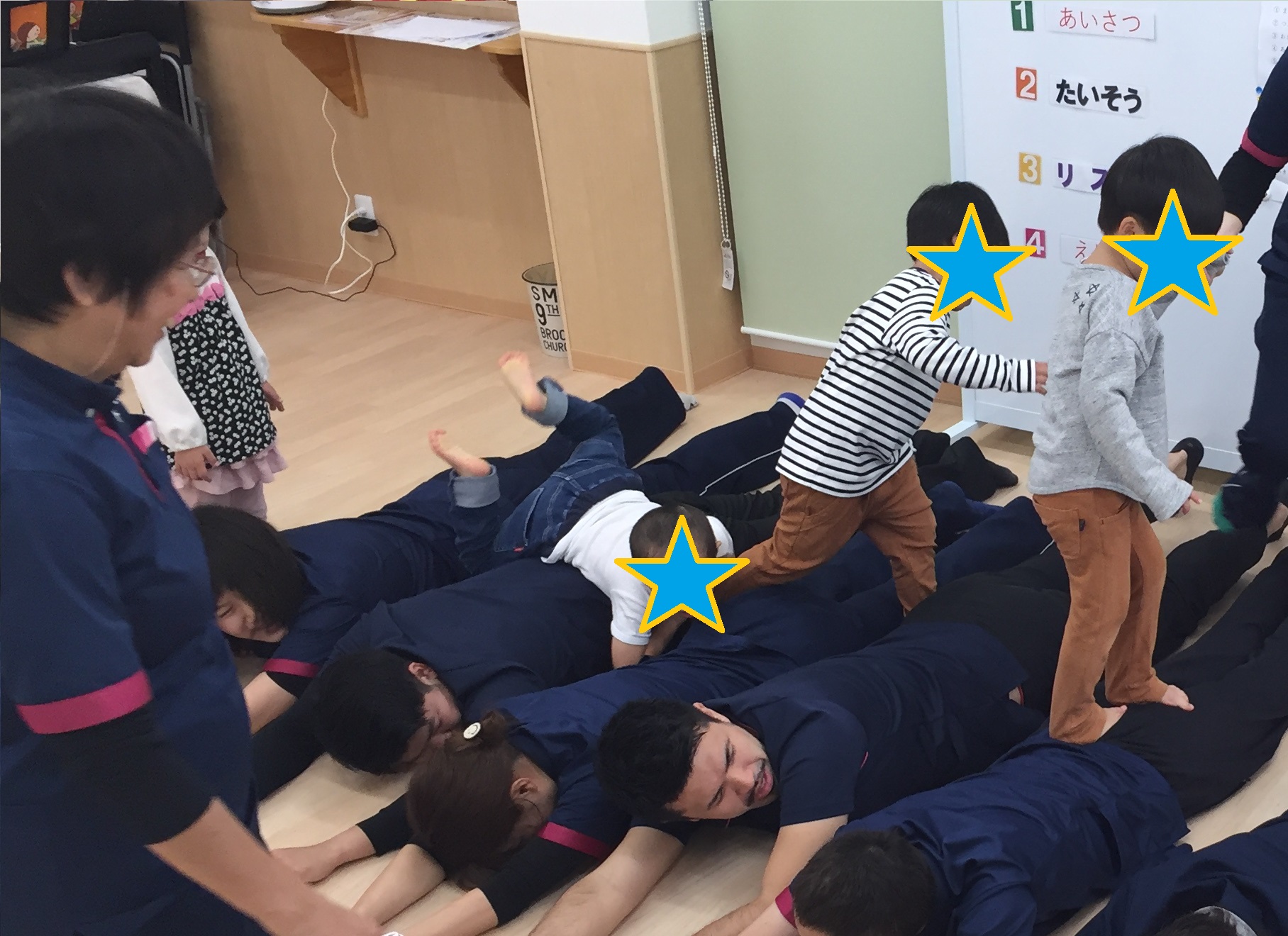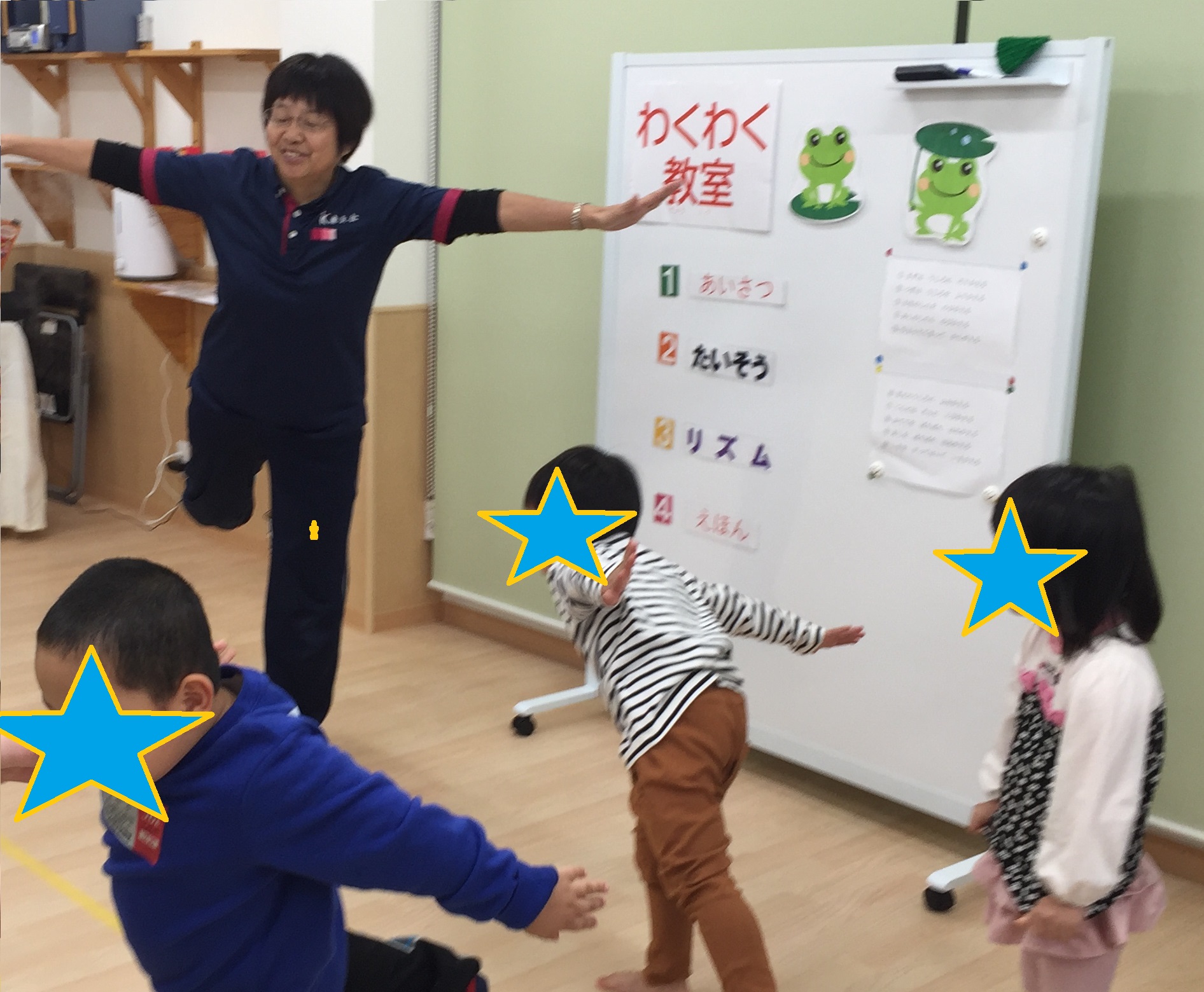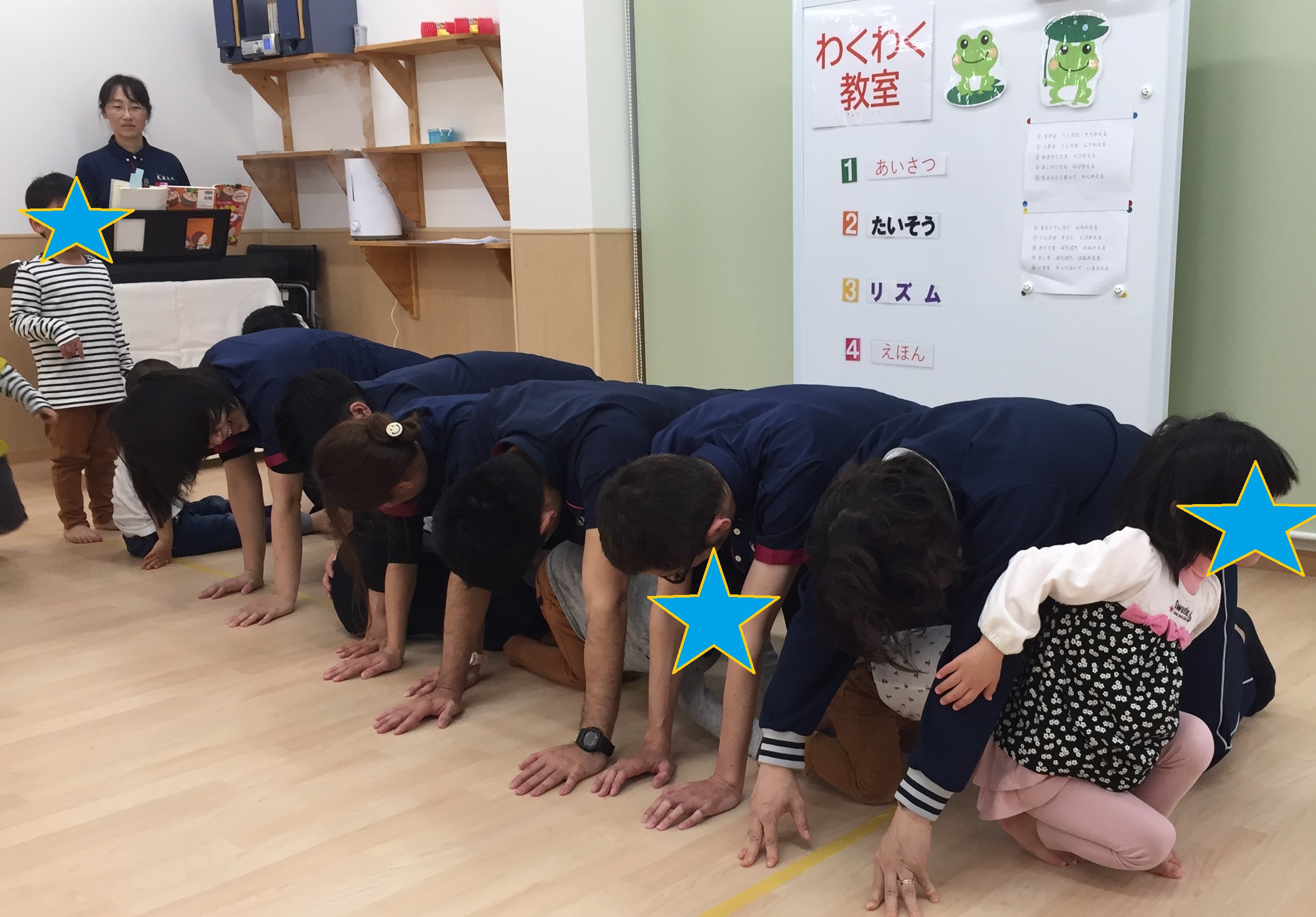 第1回目のKIDSステージ鴻池での「わくわく教室」が、11月23日に開催されました。 鴻池のわくわく教室は、『体を使ってみんなで遊ぼう』ということをテーマに、年間を通して取り組んでいきたいと思っています。音楽に合わせて、踊ったり、リズムに合わせて、歩く、走る、飛ぶなどいろいろな動きをお友達や先生たち、時には保護者の方も交えて、一緒に楽しみたいと思っています。「わくわく教室」のなかで、お友達や先生たちと気持ちを合わせることで、社会性や共感性が育ってくれることを願って取り組んでいきます。 今回はKIDSステージ鴻池の定番「かえるのたいそう」から始まり、みんなの大好きなパプリカも踊りました。 IMG_1047.JPG 体操の後は、それぞれの名前の書いてある場所に着席して、あいさつや、手遊びをしました。 ちょっと静かに座った後は、リズム遊びです。"トトロ"の散歩の曲で、床に貼ったテープの上をみんなで行進します。 途中先生たちが手をつないで作ったトンネルや、橋をくぐったりまたいだり。マットで作った長いトンネルも出現。暗くてちょっぴり長いトンネルなので、はじめはこわごわのお友達もいましたが、四つ這いになってすぐにくぐれるようになりました。 IMG_1141.JPG 『ちょっと不安だなあ』と思っても、みんなが楽しそうにくぐっているから、自分もやってみようかなと、心を動かされる、これは大きな集団の力ですね。 IMG_1230.JPG IMG_1183.JPG "汽車"では、ピアノの速度に合わせて、ゆーっくりからどんどん早く走ります、そして だだーんと鳴るとみんなで床に、こけてしまいます。その一体感がとっても楽しい様子でした。 その後は汽車の線路に、先生たちが四つ這いになった山や、うつぶせに寝転んで作った丘などができると、そこをよじ登ったり、足をうーんと伸ばして先生を踏まないようにまたいだり、でも先生の上を歩いて渡るお友達も...。 IMG_1180.JPG IMG_1189.JPG リズムの最後は"こもりうた"で体も心も静めて、終わりの会へとなりました。   今月の絵本は「まどからのおくりもの」です。少し早いサンタさんの絵本でしたが、窓から見えるおうちの住人の意外さが楽しい絵本でした。絵本を見ながら、「次はだれのおうちかな?」「〇〇のおうちに見えるけどほんまちゃうで」など、絵本の展開を楽しみにしている子どもたちでした。本当のサンタさんの日には、みんなも素敵なプレゼントが窓から届くといいね。 IMG_1326.JPG 12月21日は音楽会です。来年1月からもまた楽しいリズムにのせて、みんなと一杯楽しく体を動かしたいと思っています。 そして、来年わくわく教室は1月25日です。申し込みお待ちしております。