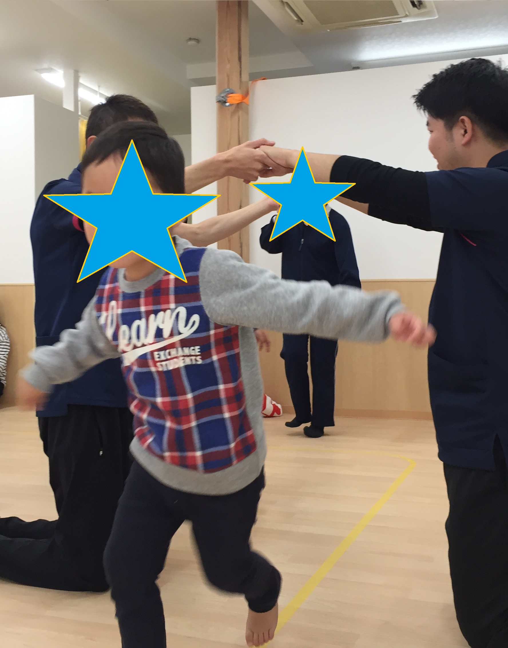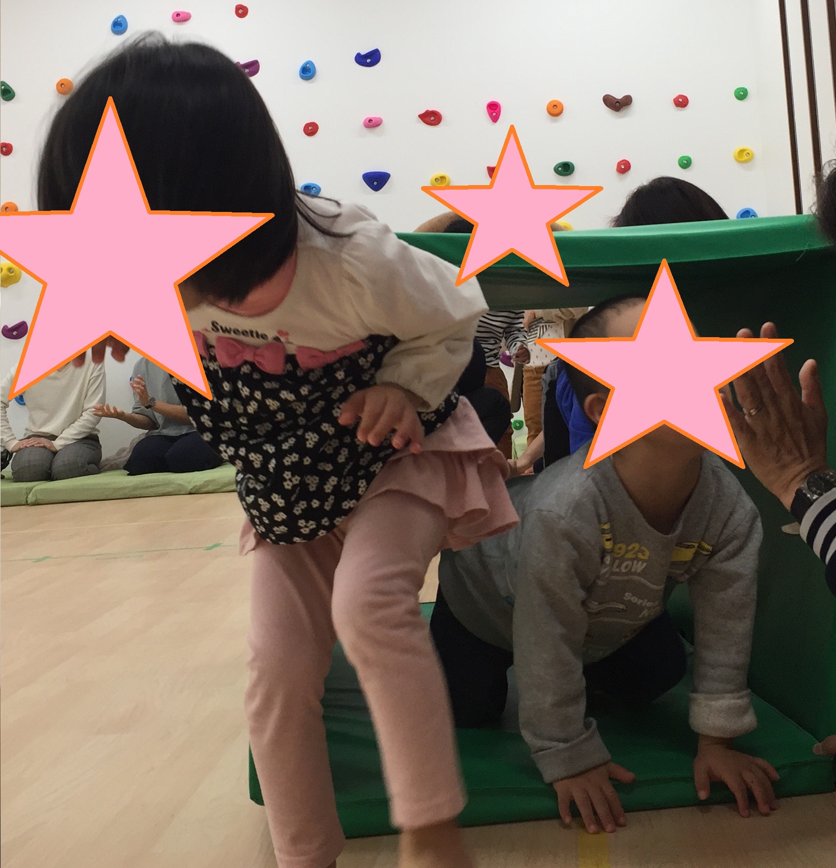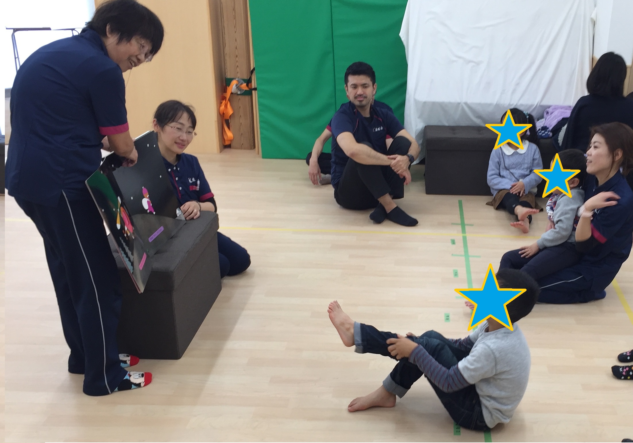 第1回目のKIDSステージ鴻池での「わくわく教室」が、11月23日に開催されました。 鴻池のわくわく教室は、『体を使ってみんなで遊ぼう』ということをテーマに、年間を通して取り組んでいきたいと思っています。音楽に合わせて、踊ったり、リズムに合わせて、歩く、走る、飛ぶなどいろいろな動きをお友達や先生たち、時には保護者の方も交えて、一緒に楽しみたいと思っています。「わくわく教室」のなかで、お友達や先生たちと気持ちを合わせることで、社会性や共感性が育ってくれることを願って取り組んでいきます。 今回はKIDSステージ鴻池の定番「かえるのたいそう」から始まり、みんなの大好きなパプリカも踊りました。 IMG_1047.JPG 体操の後は、それぞれの名前の書いてある場所に着席して、あいさつや、手遊びをしました。 ちょっと静かに座った後は、リズム遊びです。"トトロ"の散歩の曲で、床に貼ったテープの上をみんなで行進します。 途中先生たちが手をつないで作ったトンネルや、橋をくぐったりまたいだり。マットで作った長いトンネルも出現。暗くてちょっぴり長いトンネルなので、はじめはこわごわのお友達もいましたが、四つ這いになってすぐにくぐれるようになりました。 IMG_1141.JPG 『ちょっと不安だなあ』と思っても、みんなが楽しそうにくぐっているから、自分もやってみようかなと、心を動かされる、これは大きな集団の力ですね。 IMG_1230.JPG IMG_1183.JPG "汽車"では、ピアノの速度に合わせて、ゆーっくりからどんどん早く走ります、そして だだーんと鳴るとみんなで床に、こけてしまいます。その一体感がとっても楽しい様子でした。 その後は汽車の線路に、先生たちが四つ這いになった山や、うつぶせに寝転んで作った丘などができると、そこをよじ登ったり、足をうーんと伸ばして先生を踏まないようにまたいだり、でも先生の上を歩いて渡るお友達も...。 IMG_1180.JPG IMG_1189.JPG リズムの最後は"こもりうた"で体も心も静めて、終わりの会へとなりました。   今月の絵本は「まどからのおくりもの」です。少し早いサンタさんの絵本でしたが、窓から見えるおうちの住人の意外さが楽しい絵本でした。絵本を見ながら、「次はだれのおうちかな?」「〇〇のおうちに見えるけどほんまちゃうで」など、絵本の展開を楽しみにしている子どもたちでした。本当のサンタさんの日には、みんなも素敵なプレゼントが窓から届くといいね。 IMG_1326.JPG 12月21日は音楽会です。来年1月からもまた楽しいリズムにのせて、みんなと一杯楽しく体を動かしたいと思っています。 そして、来年わくわく教室は1月25日です。申し込みお待ちしております。
