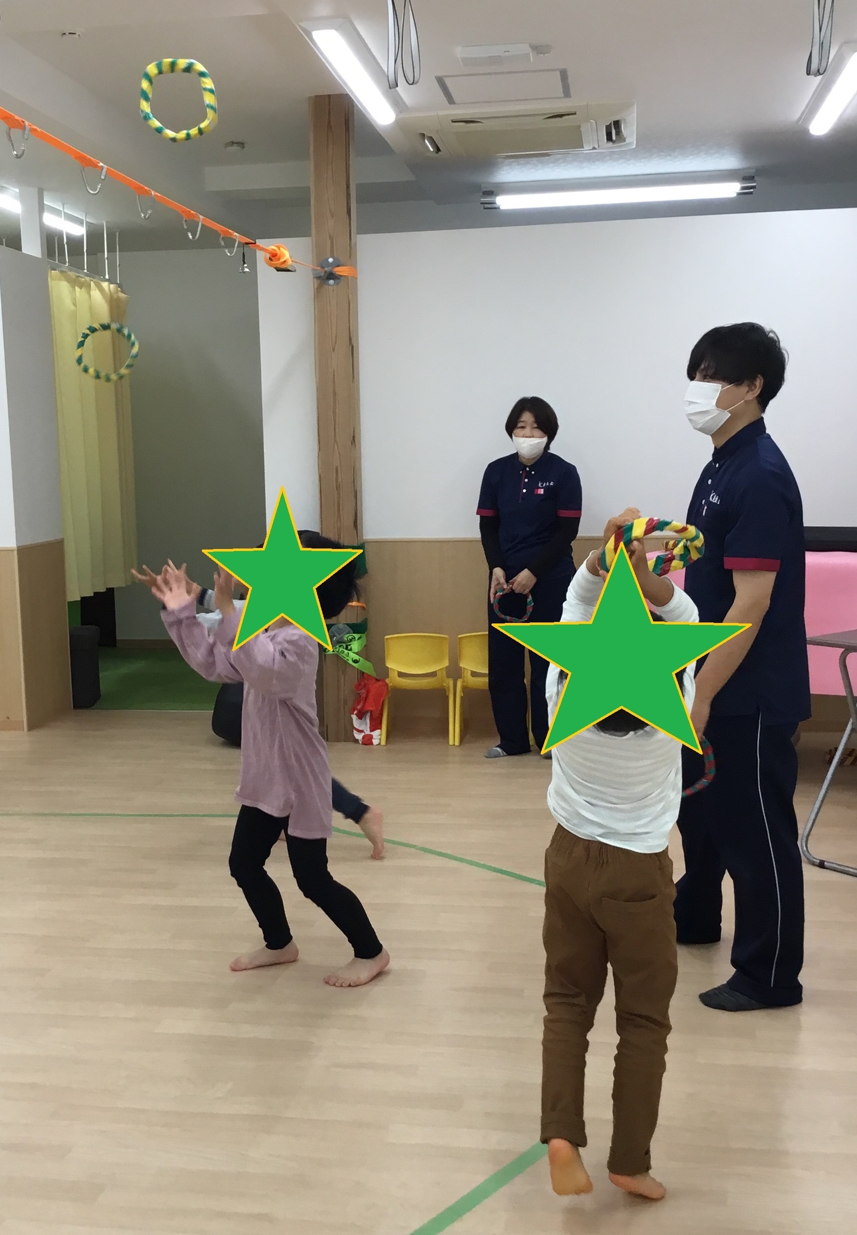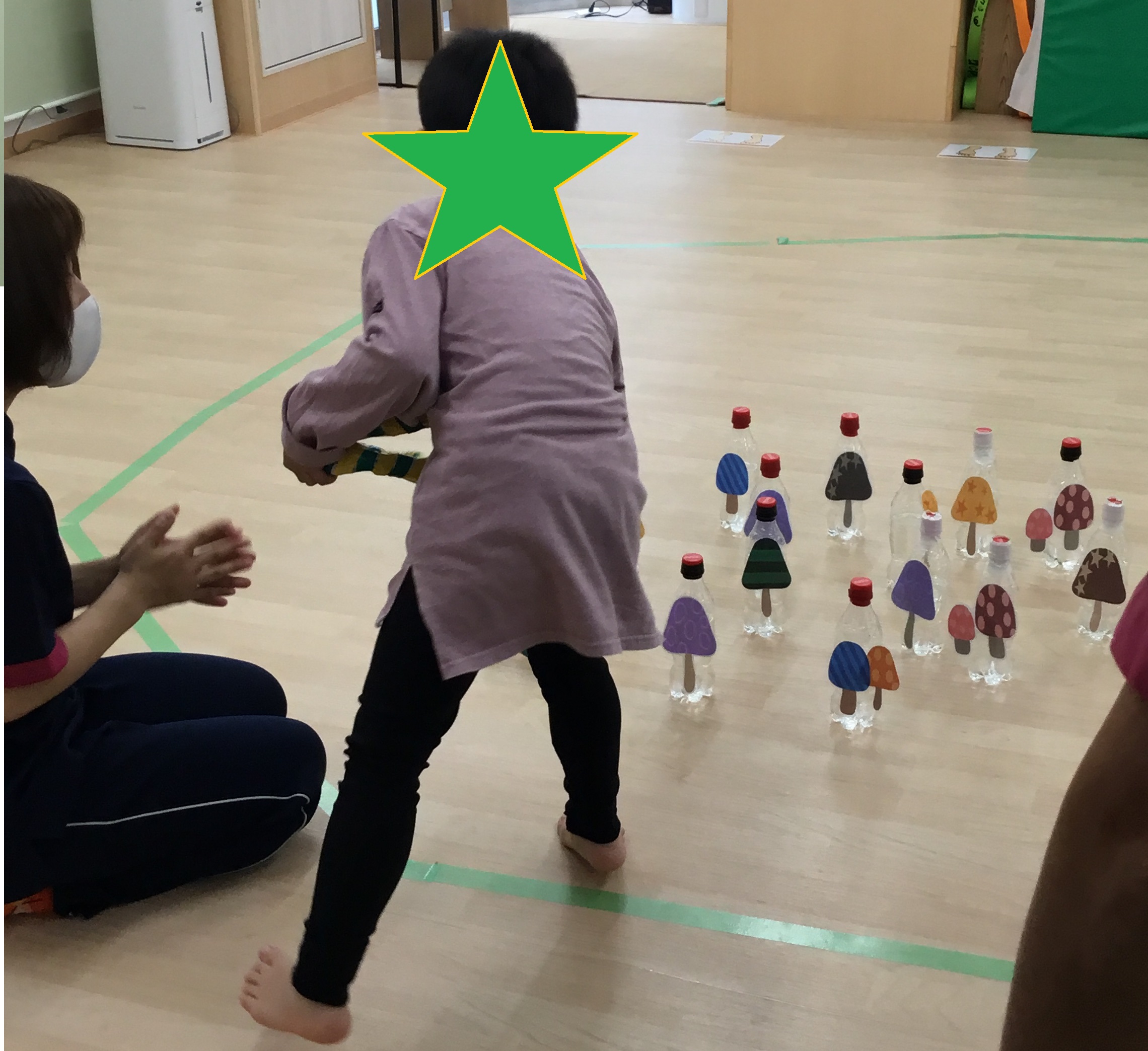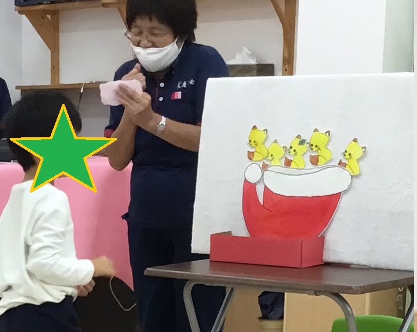 11月わくわく教室が11月21日(土)に 慶生会KIDSステージ鴻池にて行われました。 11月のテーマは『わっかで遊ぼう!!』です。 新聞紙で作ったわっかを使って様々な動きを取り入れた 遊びを少人数で楽しみました。 今回もいつものように『かえるの体操』からのスタートです。 高―くジャンプで、準備体操を済ませ、はじまりのごあいさつ。 最初は手遊びの『やきいもグーチーパー』をしました。 IMG_0358 (1).JPG IMG_0421 (1).JPG 次はいよいよ"KIDSわっかあそび"の時間です。 一番最初にわっかはバスの運転ハンドルに変身です。 『バスに乗って揺られてる♪』の曲に合わせて、右に曲がったり、 左に曲がったりとリズミカルに運転を楽しみました。 つづいて『さんぽ』や『世界中の子どもたちが』の曲に合わせて、 わっかを頭にのせて歩いたり、天井に向かって投げては 落ちてくるのを受け止めたり、腕に通してくるくるまわしたり、 わっかを使ったいろんな動きを楽しみました。 IMG_0436 (1).JPG IMG_0451 (1).JPG いったん座って休憩していると、『ドコノコキノコ』の曲に合わせて、 たくさんのキノコがにょきにょきと現れました。さあ、ペットボトル きのこの輪投げ大会の始まり始まり?。一つのキノコに、たくさんの わっかを入れたり、逆にひとつのわに沢山のキノコを入れたり、 遠くから狙いを定めてなげてみたり、とにかく、キノコに 輪を入れたくて真上からおとしてみたり、子どもたちは思い思いにゆっくり、じっくりきのこの輪投げ大会を楽しんでいました。 IMG_0470.JPG 第1グループは、パラバルーンもしました。しばらくは持って歩いたり、 下にもぐったりとよくあるパラバルーンの光景でしたが、 だんだんとバルーンの上にのってパタパタと生地を揺らしてもらい、 子どもたちは飛んでるような、泳いでるようなポーズをしながら、 とてもうれしそうにしていました。 第2・第3グループでは、つながり遊びの『メリーゴーランド』と、 パネルシアター『サンタさんの帽子』をやってみました。 『メリーゴーランド』は隣の人とわっかを使ってつながり、みんなで一つの 大きな輪をつくり、ギャロップをしながら、メリーゴーランドのように くるくるまわる、みんなですると楽しい動きですが、 ちょっぴりハードだったかな?       『サンタさんの帽子』は、去年のクリスマスにサンタさんが忘れていった 帽子に、小さな動物たちがやってきて次々と入るお話。 実際に子どもたちに1種類ずつの動物を担当してもらい、 帽子に入れていってもらいました。どの動物も全部で5匹。 全員入ると、ギューギュー!!でした。 IMG_0491 (1).JPG KIDSのわくわく教室は、当日のメンバーや参加した子どもたちの 様子をみながら、子どもたちと一緒に作り上げていく教室です。 だからこそ、時間ごとに少しづつ内容が違いますが、その時、その瞬間の 子どもたちにとって最適な題材を取り入れて、一人一人が主人公と なれるよう、また、満足 感や達成感をたっぷり味わえる時間と なるように考えています。 これからも、わくわく教室を楽しみにしていてくださいね。 参加をお待ちしています。