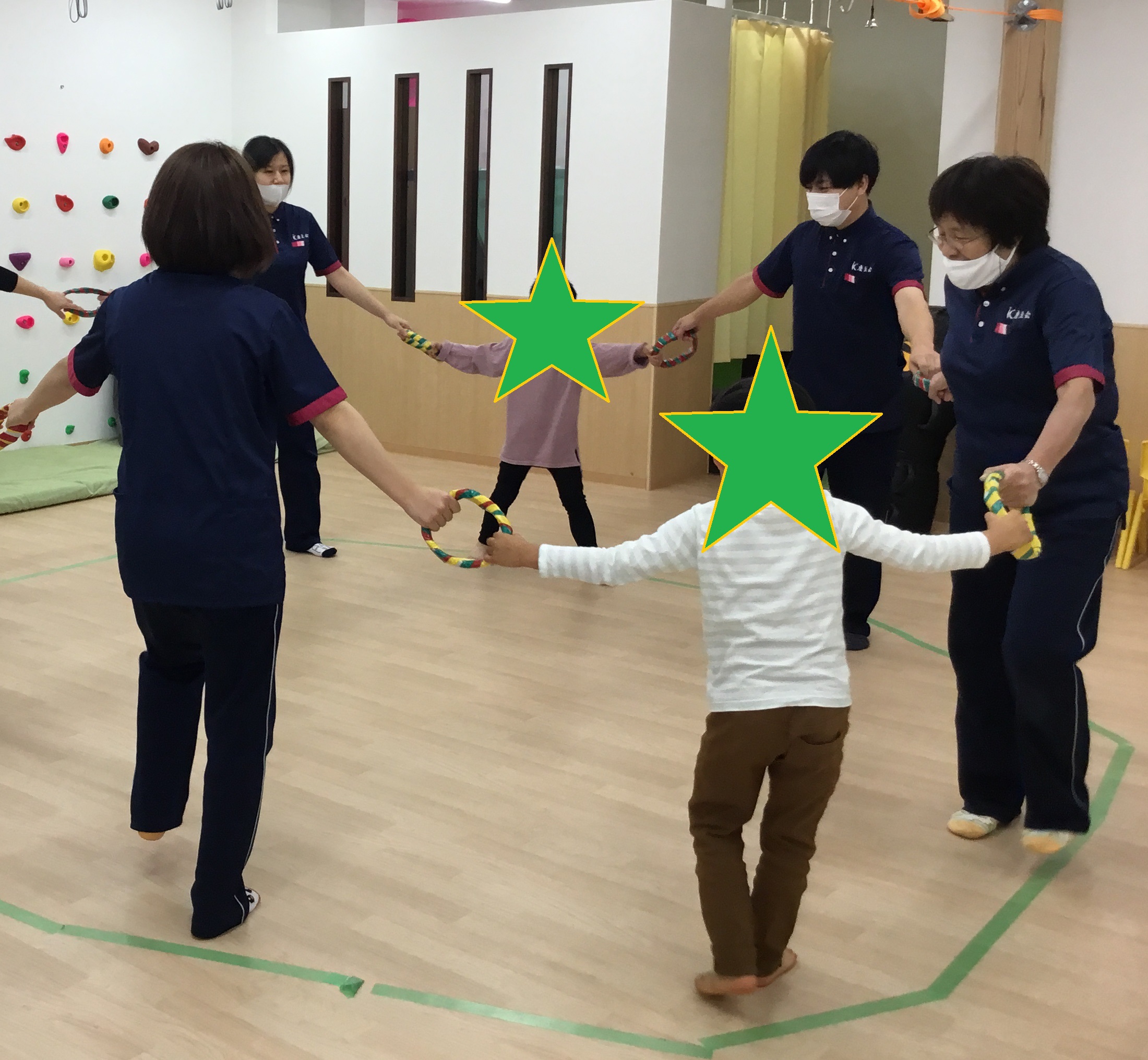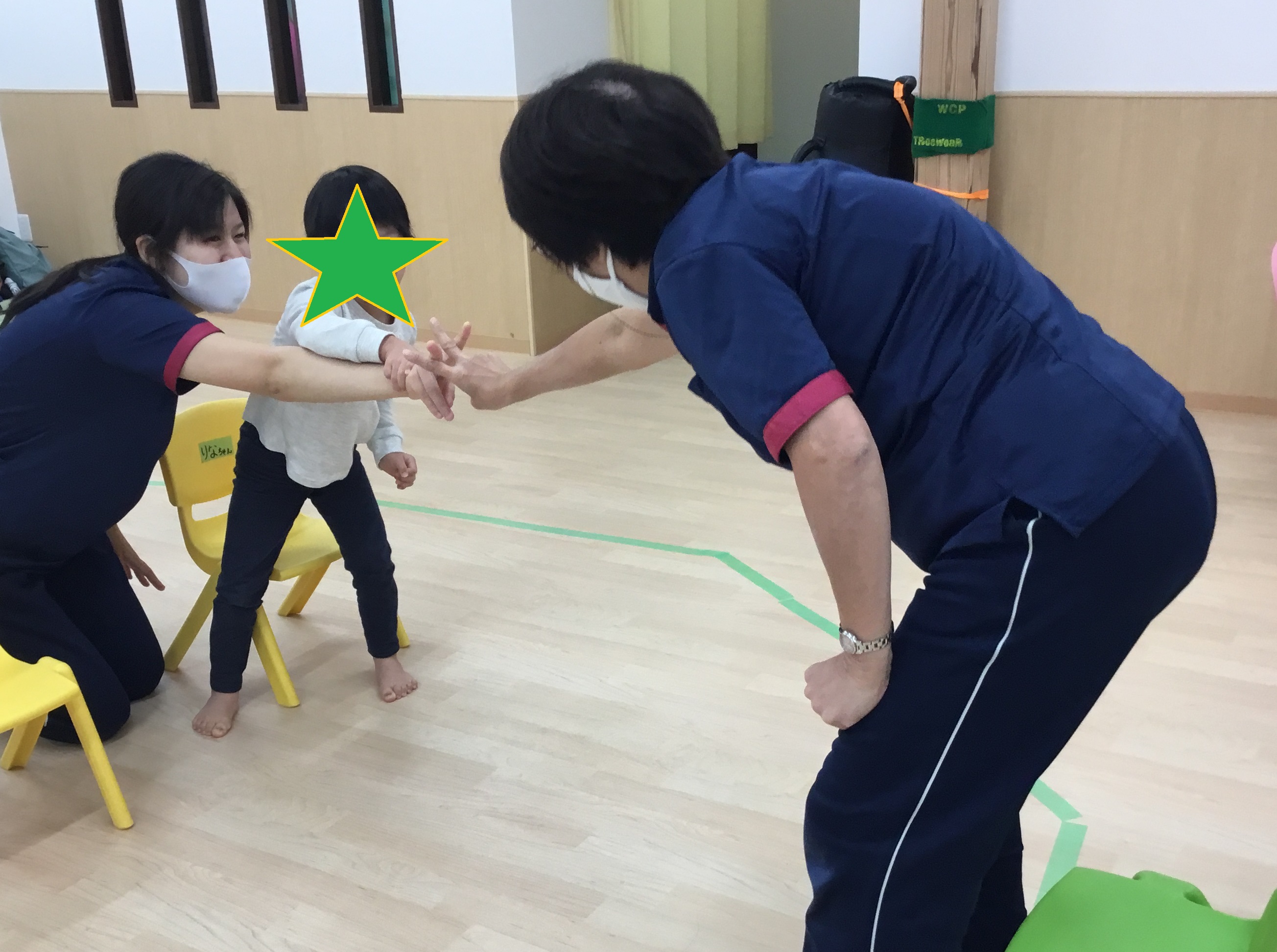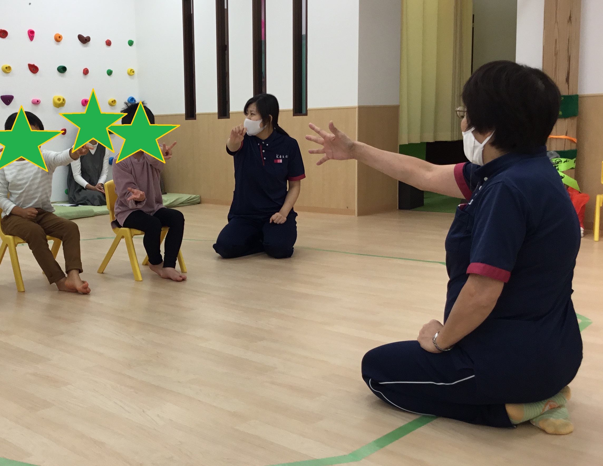 11月わくわく教室が11月21日(土)に 慶生会KIDSステージ鴻池にて行われました。 11月のテーマは『わっかで遊ぼう!!』です。 新聞紙で作ったわっかを使って様々な動きを取り入れた 遊びを少人数で楽しみました。 今回もいつものように『かえるの体操』からのスタートです。 高―くジャンプで、準備体操を済ませ、はじまりのごあいさつ。 最初は手遊びの『やきいもグーチーパー』をしました。 IMG_0358 (1).JPG IMG_0421 (1).JPG 次はいよいよ"KIDSわっかあそび"の時間です。 一番最初にわっかはバスの運転ハンドルに変身です。 『バスに乗って揺られてる♪』の曲に合わせて、右に曲がったり、 左に曲がったりとリズミカルに運転を楽しみました。 つづいて『さんぽ』や『世界中の子どもたちが』の曲に合わせて、 わっかを頭にのせて歩いたり、天井に向かって投げては 落ちてくるのを受け止めたり、腕に通してくるくるまわしたり、 わっかを使ったいろんな動きを楽しみました。 IMG_0436 (1).JPG IMG_0451 (1).JPG いったん座って休憩していると、『ドコノコキノコ』の曲に合わせて、 たくさんのキノコがにょきにょきと現れました。さあ、ペットボトル きのこの輪投げ大会の始まり始まり?。一つのキノコに、たくさんの わっかを入れたり、逆にひとつのわに沢山のキノコを入れたり、 遠くから狙いを定めてなげてみたり、とにかく、キノコに 輪を入れたくて真上からおとしてみたり、子どもたちは思い思いにゆっくり、じっくりきのこの輪投げ大会を楽しんでいました。 IMG_0470.JPG 第1グループは、パラバルーンもしました。しばらくは持って歩いたり、 下にもぐったりとよくあるパラバルーンの光景でしたが、 だんだんとバルーンの上にのってパタパタと生地を揺らしてもらい、 子どもたちは飛んでるような、泳いでるようなポーズをしながら、 とてもうれしそうにしていました。 第2・第3グループでは、つながり遊びの『メリーゴーランド』と、 パネルシアター『サンタさんの帽子』をやってみました。 『メリーゴーランド』は隣の人とわっかを使ってつながり、みんなで一つの 大きな輪をつくり、ギャロップをしながら、メリーゴーランドのように くるくるまわる、みんなですると楽しい動きですが、 ちょっぴりハードだったかな?       『サンタさんの帽子』は、去年のクリスマスにサンタさんが忘れていった 帽子に、小さな動物たちがやってきて次々と入るお話。 実際に子どもたちに1種類ずつの動物を担当してもらい、 帽子に入れていってもらいました。どの動物も全部で5匹。 全員入ると、ギューギュー!!でした。 IMG_0491 (1).JPG KIDSのわくわく教室は、当日のメンバーや参加した子どもたちの 様子をみながら、子どもたちと一緒に作り上げていく教室です。 だからこそ、時間ごとに少しづつ内容が違いますが、その時、その瞬間の 子どもたちにとって最適な題材を取り入れて、一人一人が主人公と なれるよう、また、満足 感や達成感をたっぷり味わえる時間と なるように考えています。 これからも、わくわく教室を楽しみにしていてくださいね。 参加をお待ちしています。