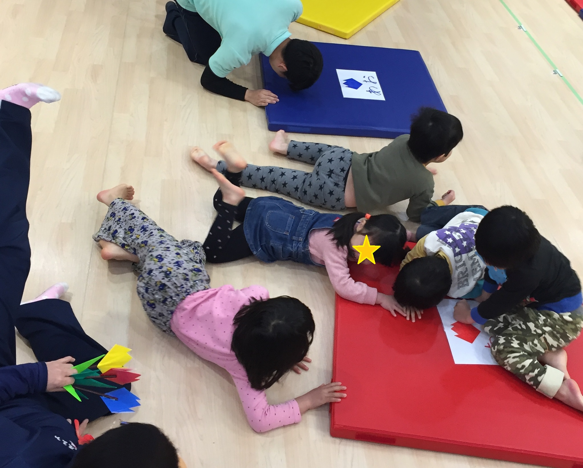 そしてリーダーの先生が「赤いお花」と言うと、赤いマットの上にみんなで乗ると言うルールです。
