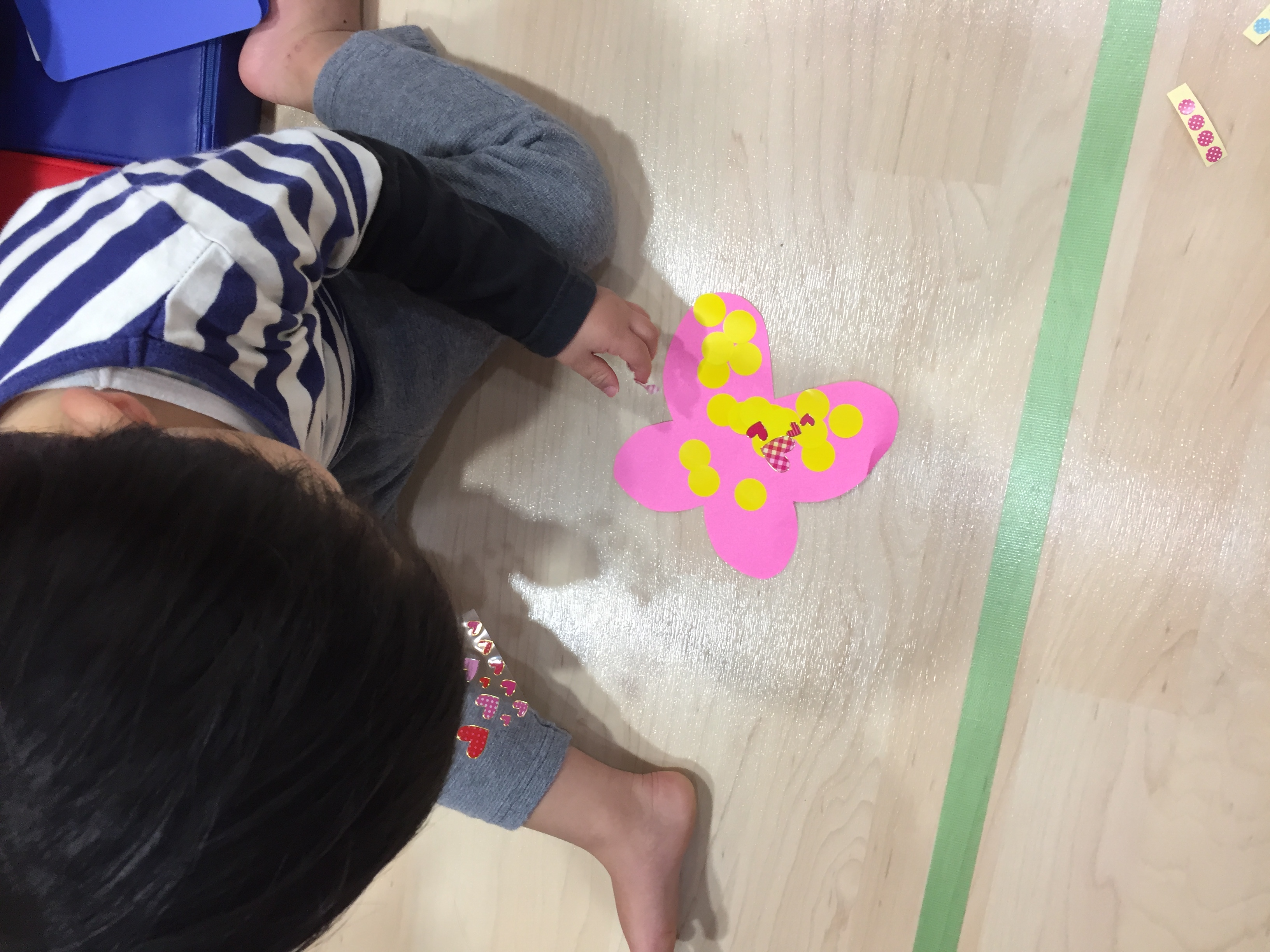 次はちょうちょの形に切った折り紙に、好きなシールを貼って模様を作りました。