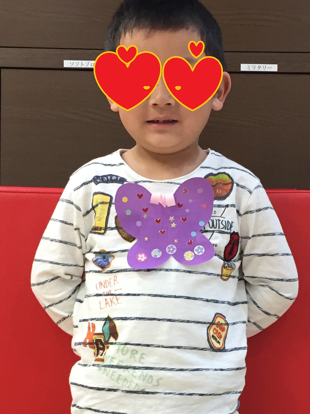 出来上がったちょうちょを胸に付けて、ちょうちょになってリズム遊びもしました。