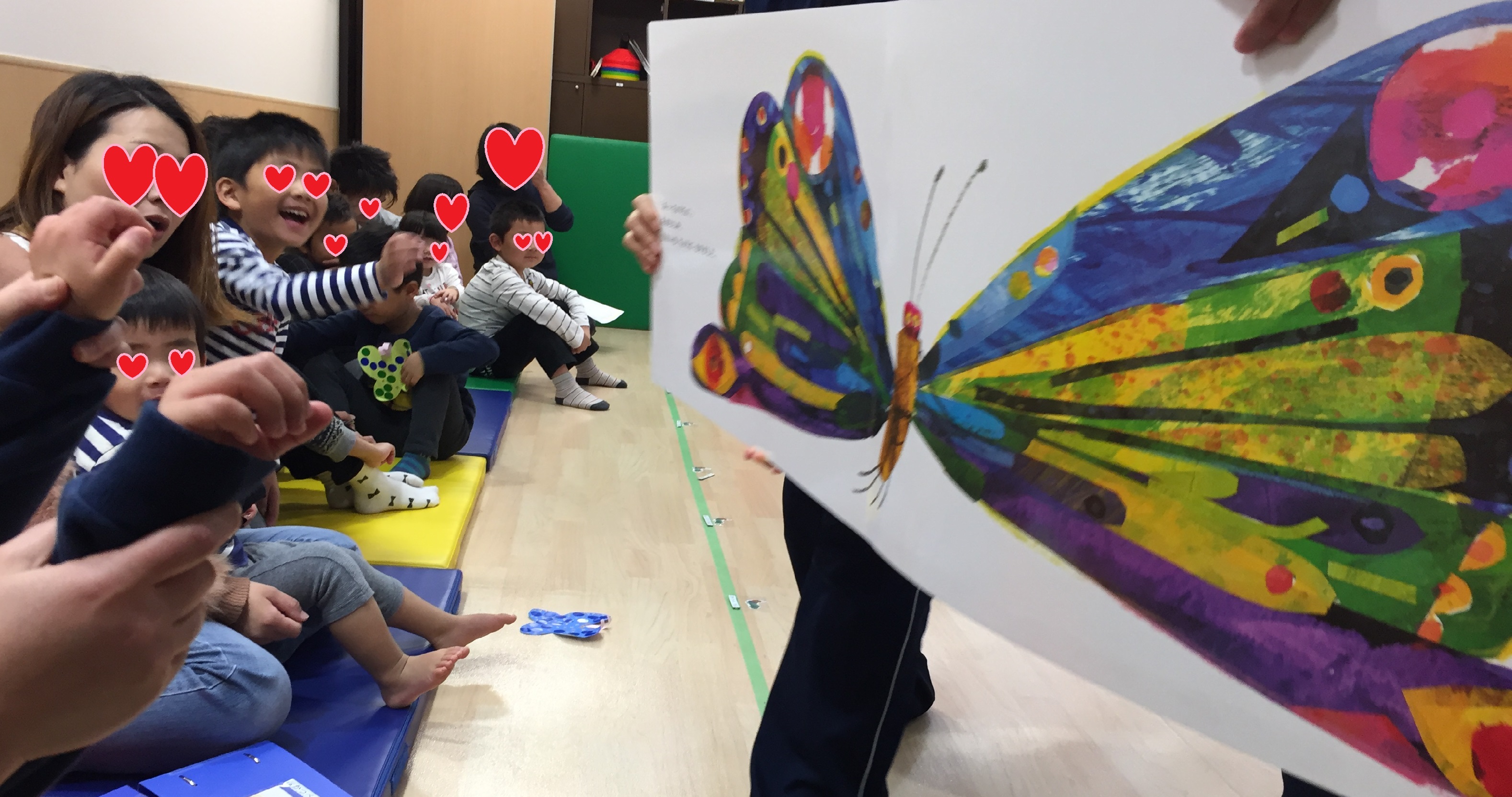最後は「はらぺこあおむし」の絵本を読み、きれいなちょうちょの出現に歓声を上げた子どもたちでした。