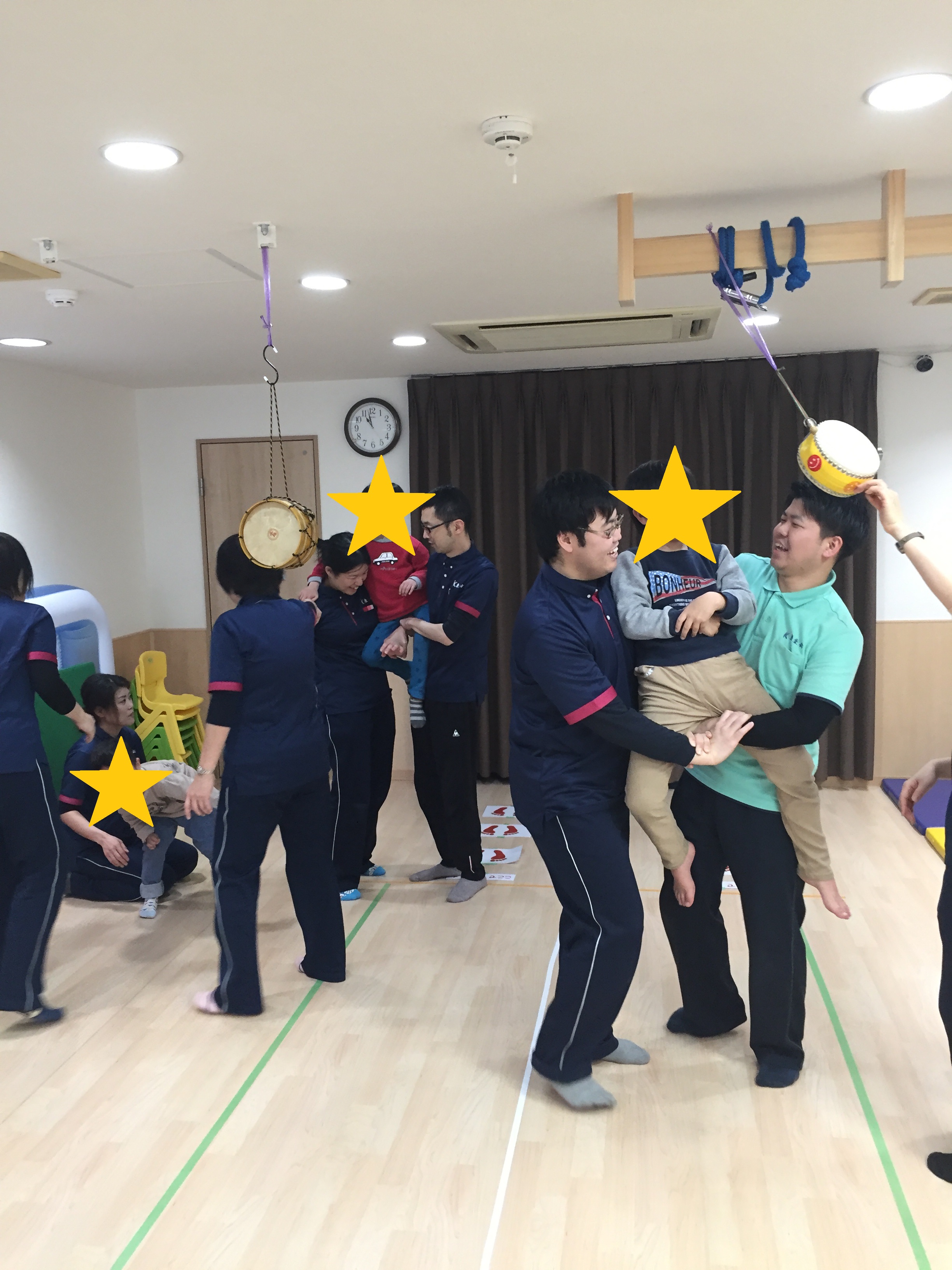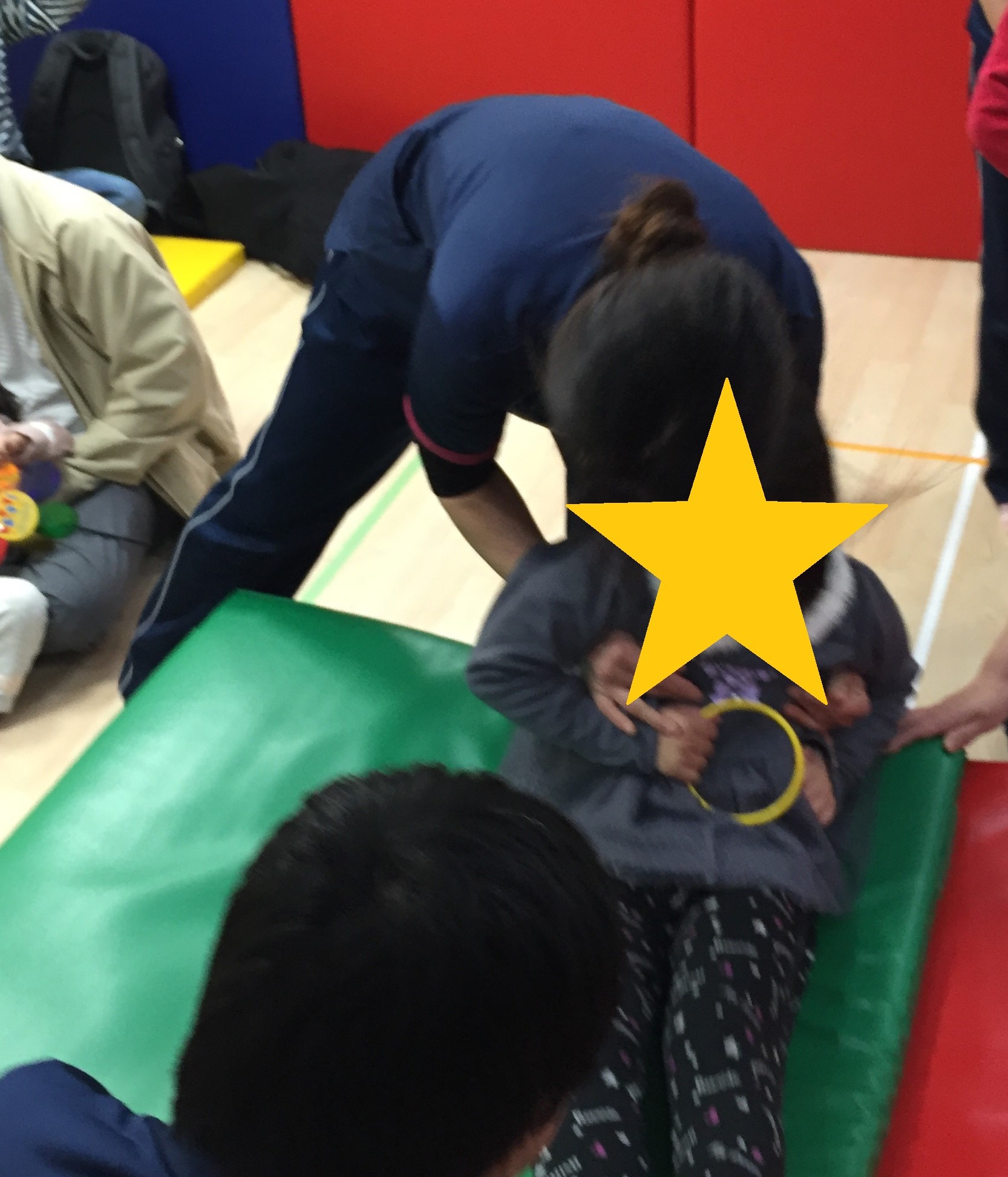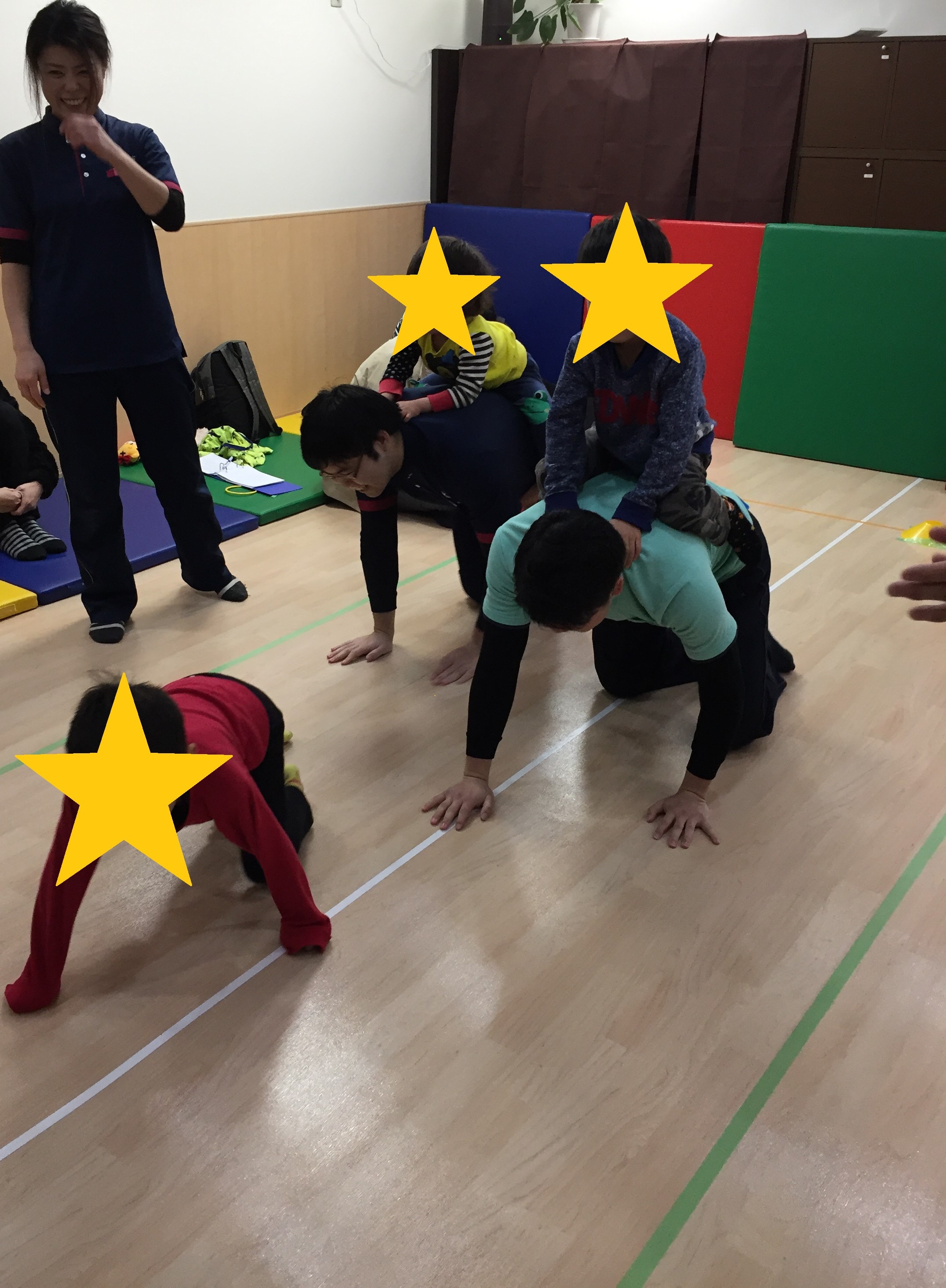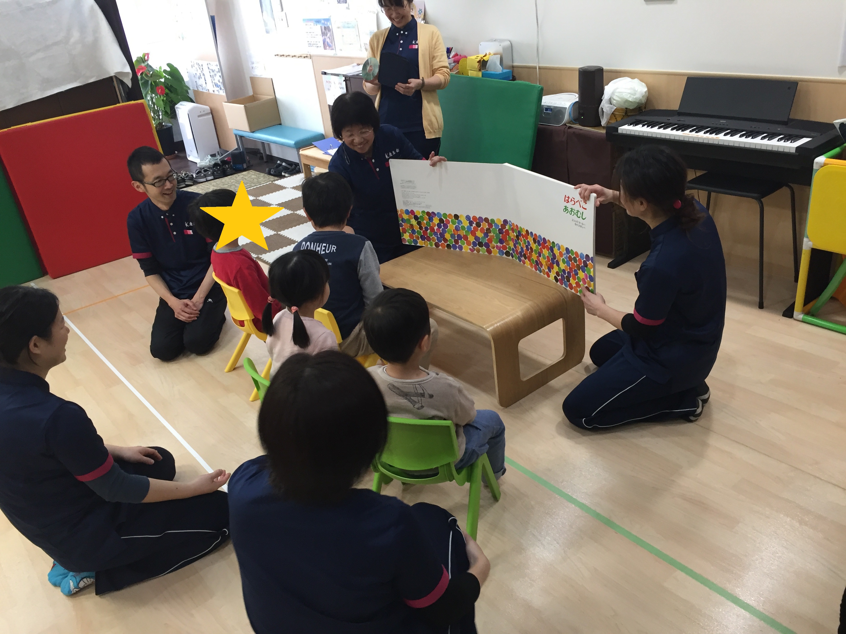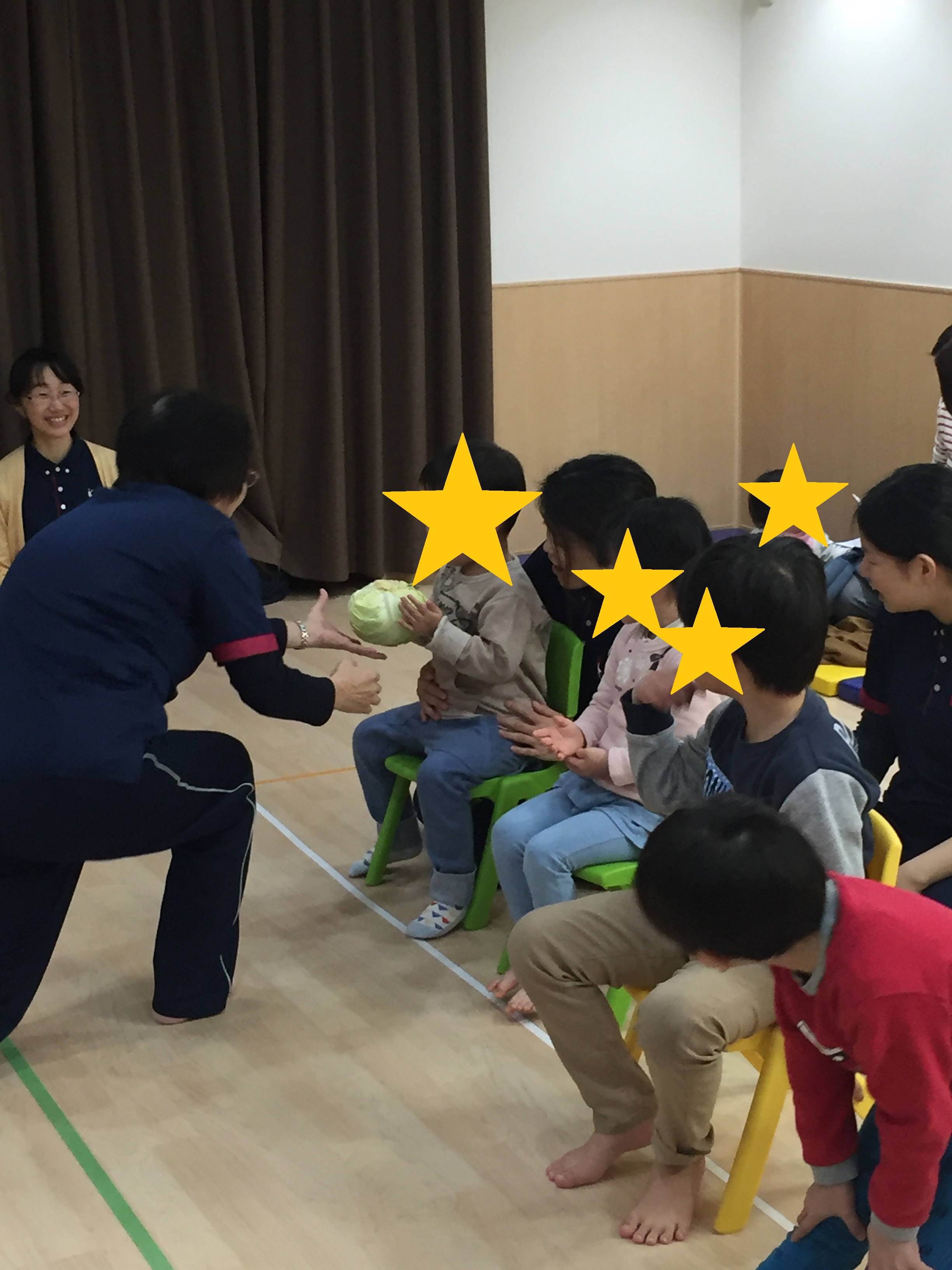 3月16日に第21回のわくわく教室を行いました。 今回のテーマは、"リズム・体遊び"でした。始まりは『キャベツの中から』の手遊びをしました。本物のキャベツも登場してみんなびっくり!持ってもらうと「おもーい!」と感想を伝えてくれました。言葉で説明を聞くだけでなく、実際に感触や重さ、においなどを感じてもらいました。本物に触れることも知識の幅が広がり、とても大切なことですね。この手遊びは、指を1本1本立てていくところと、片方の手はパー、もう片方はグーで、交互に変えていくというところに難しさがあります。特に中指、薬指となると、もう一方の手の助けを借りて、何とかその指だけ立てようと頑張る子どもたちでした。 IMG_8369.JPG その後、『できるかな?』でリズム体操をしました。猫になって四つん這いになり、背中を伸ばしたり、ロバになって足を後ろに蹴り上げたり、ゴリラになって胸をどんどん!と叩いたり、様々な動物に変身しながら体を使って遊びました。 IMG_8421.JPG 次は、先生と一緒に体遊びをしました。まず、『お馬さん』です。お馬になった先生の背中にまたがって前に進みます。子どものバランス感覚を育てる楽しい遊びでもあり、先生たちの運動不足を解消する(ダイエット効果も?!)遊びでもあります。(笑)自分の体を支えながら、みんな楽しそうにお馬を乗りこなしてくれ、「おかわり!!」で何回も乗る子どもたちでした。 IMG_8236.JPG その後、揺さぶり遊びで『ことりことり』をしました。2人のスタッフがあおむけやうつぶせになった子どもたちを抱えて「こーとりーことりーあの山めがけて飛んでいけー」と歌いながら左右に揺らします。降りた後の子どもたちはみんな笑顔でした。この感覚に少しびっくりしても、お母さんやお父さんに駆け寄って、充電が完了すると「もういっかい!」とスタッフのところにやってきました。最初はやろうとしなかった子どもたちもお友達の楽しそうな姿を見て、やってみたいと来てくれました。 IMG_8285.JPG 最後は、『おみこし』です。スタッフが作った足場にまたがり、みんなで「わっしょい!わっしょい!」とかけ声でスタート!!揺れるおみこしの上でバランスをとりながら、"どんどん"と太鼓をたたいてくれました。人とのスキンシップを通して、他者と関わる面白さ・楽しさを共有できた時間でした。 IMG_8544.JPG 今回のお話の時間は、『はらぺこあおむし』の歌絵本でした。はらぺこあおむしが様々な食べ物を食べて、大きくなり、蝶へと育つシンプルなお話です。ページに穴がある仕掛けやカラフルな絵と音楽を通して、数・曜日・朝夜といった一日の時間などを楽しく学ぶことができる内容でした。大きなあおむしや蝶に子どもたちも夢中になってみてくれました。蝶になったあおむしのページになるとお友達が手でお花を作ってくれたので蝶がそこにとまりに来てくれました。楽しかったですね! IMG_8596.JPG