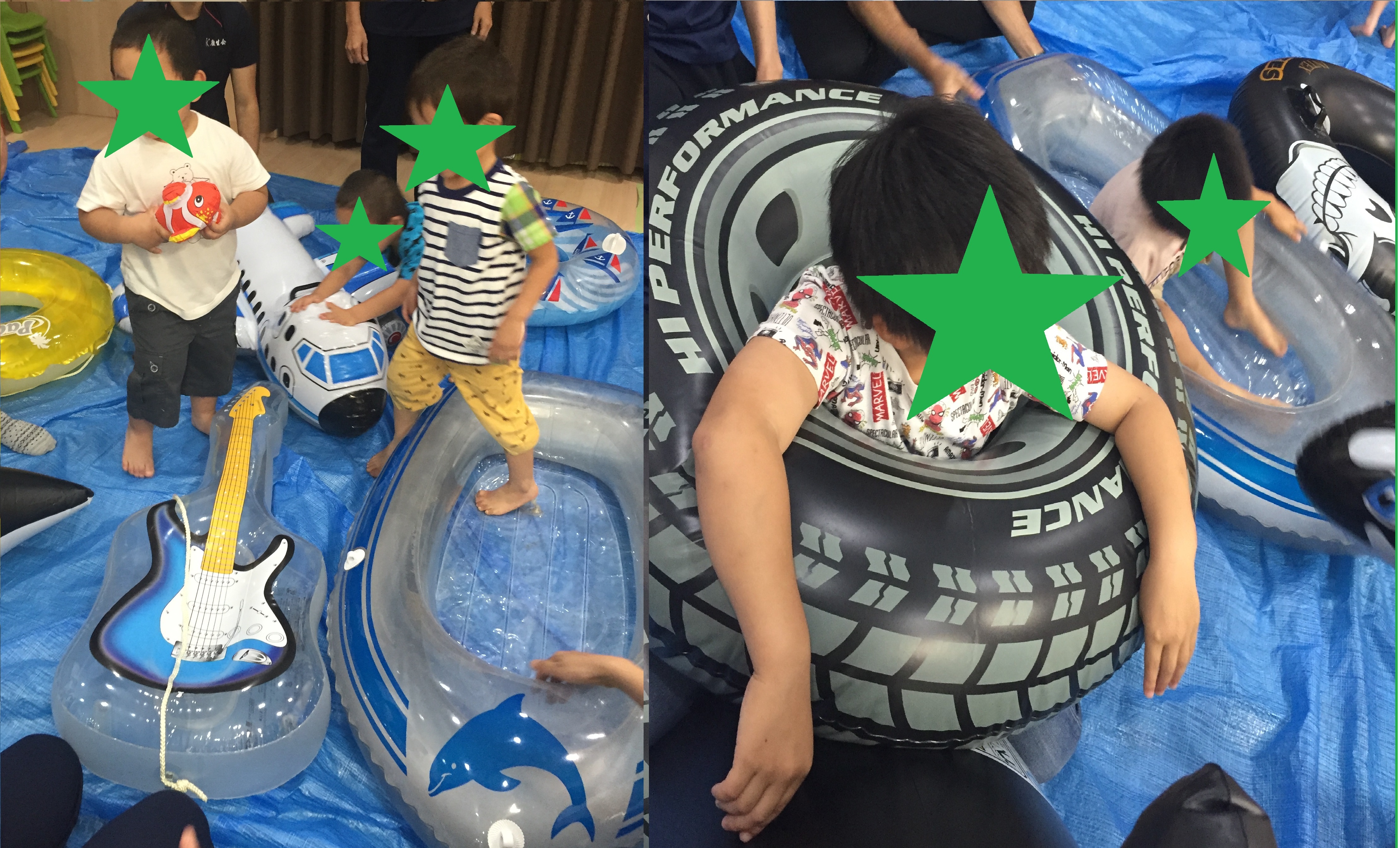 徐々に迫ってくる波にドキドキしながら待っているとみんなに大きな波がジャバーンと被さりました。ちょっぴりこわい大きな波もみんながいるから大丈夫!「もう1回!」と何度も楽しむことができ、そうしているとKIDSのカーテンががさがさと大揺れに。何と大きなシャチが飛び込んできました。でも平気、みんなで捕まえて、お友達と交代しながら、シャチに乗って、海の冒険を楽しめました。