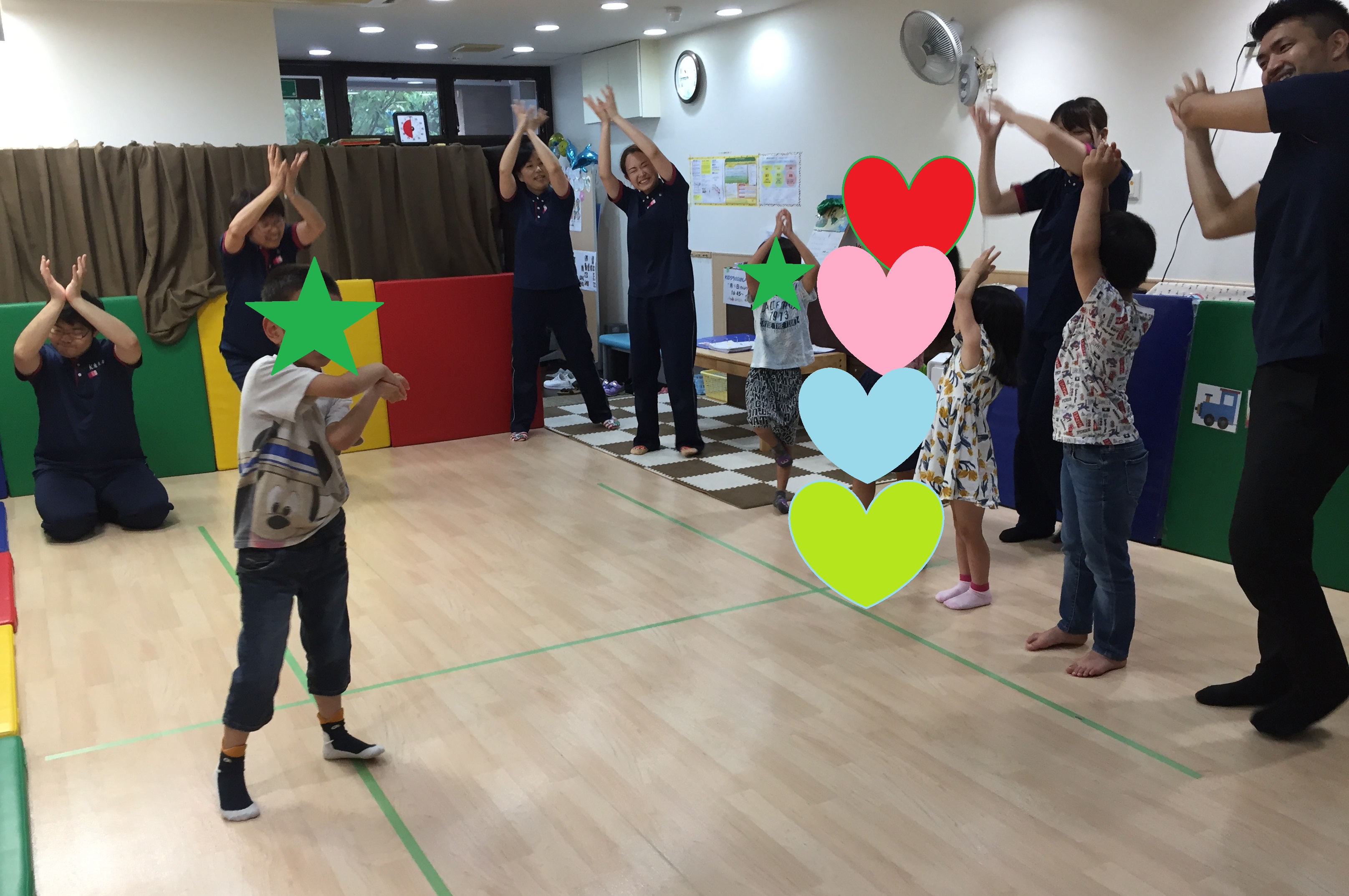 7月27日(土)にわくわく教室を行いました。テーマは『海』でした。海で遊ぶ前にみんなで準備体操をしました。曲は「パプリカ」。運動会などで踊ったことも ある様で、子どもたちの方がよく知っていて、準備体操は万全でした。