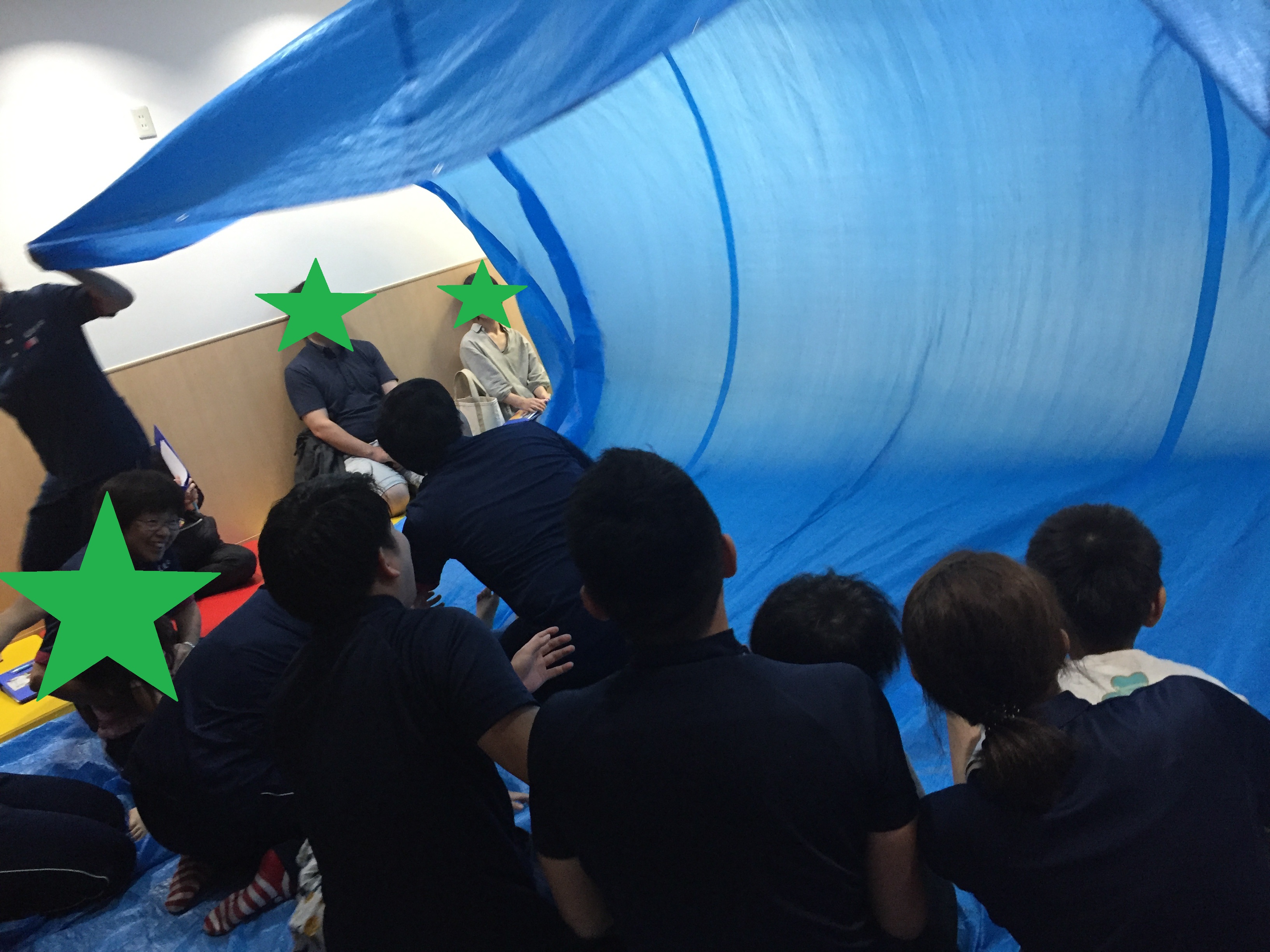 小さな波がおさまると今度は大きな波も来ました。みんなプールや海をイメージして、シートの上を泳いだり自由に好きな動きを楽しむことができていました。みんなで波の合い間を走ったりもしました。シートの下に入ると海の中に潜った様で、頭の上で青いシートがゆらゆら揺れて綺麗でしたね。シートの上に戻ると、大波がやってきました。