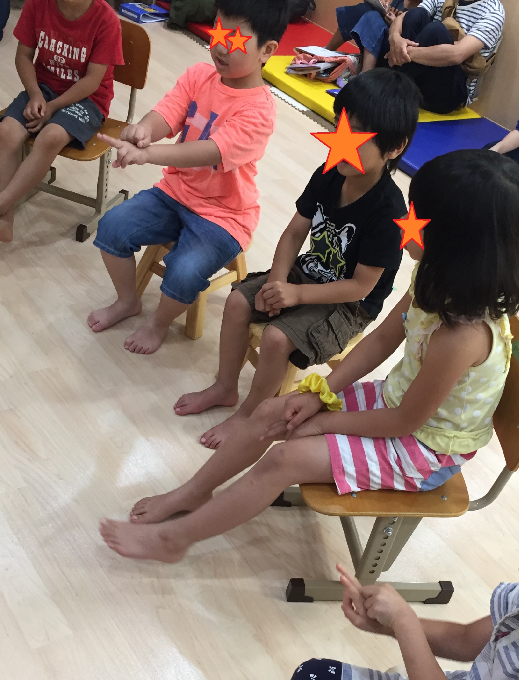 チョキの上にグーが乗ってしまう子(先生?!)もいたり、グーとグーになる子もいたりしましたが、歌に合わせて一生懸命揺らしながらリズムを楽しんでいました。