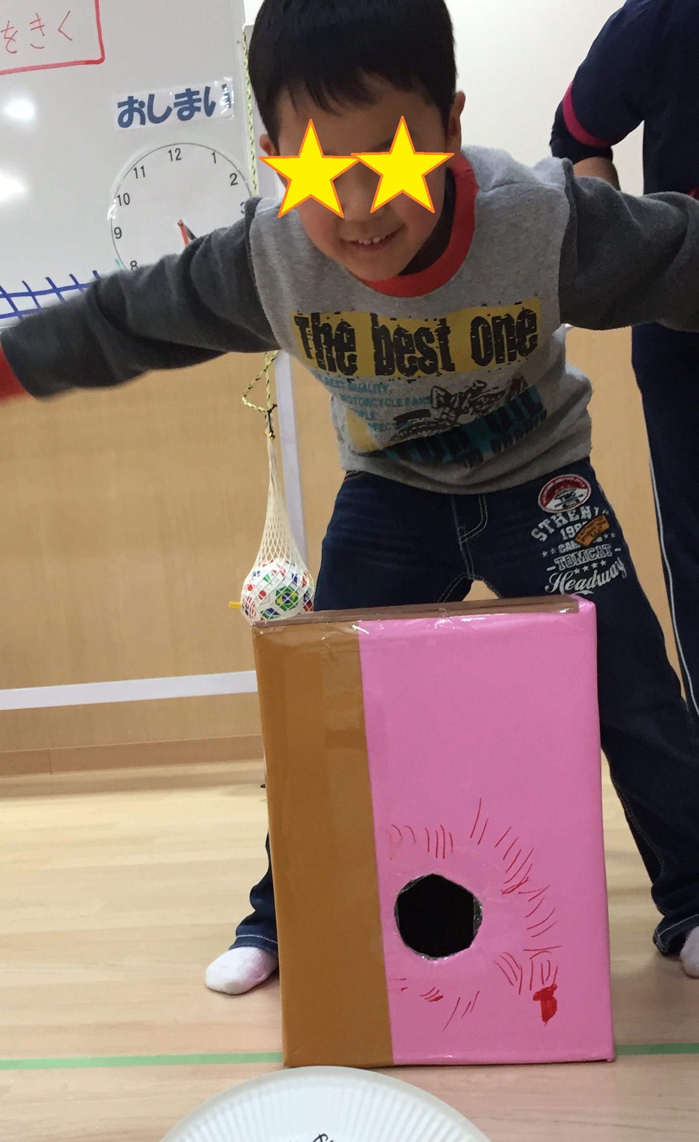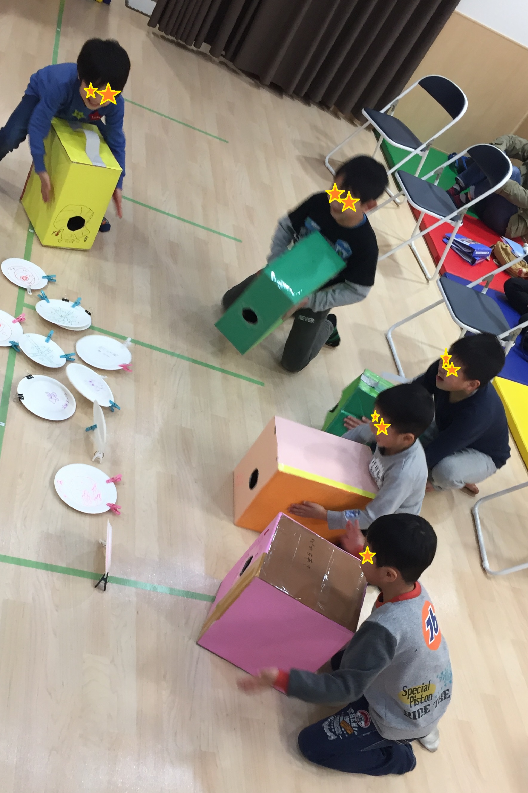 紙皿と洗濯ばさみを使って的を作ると、それぞれ自分のレーンで空気砲を撃って楽しみました。