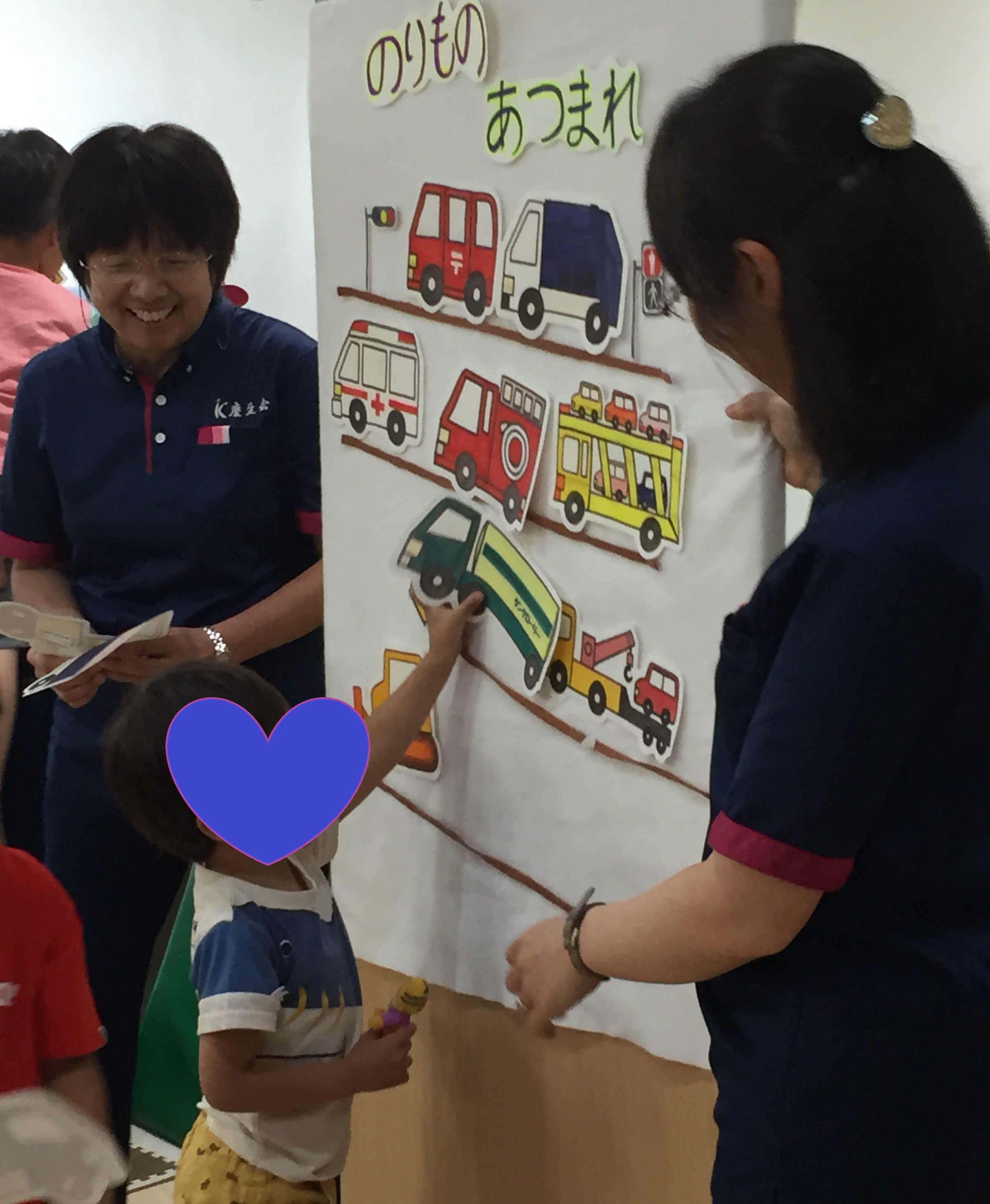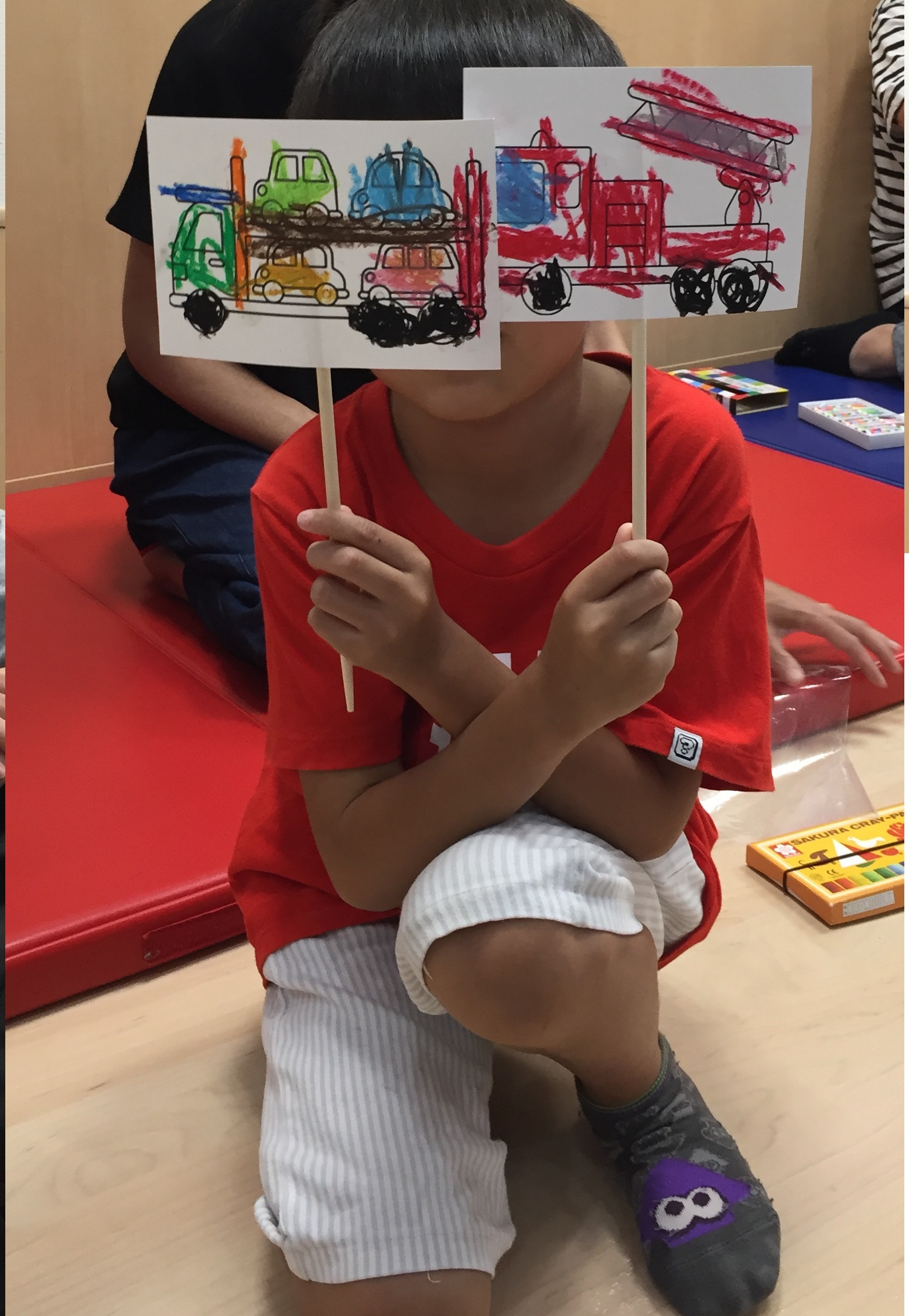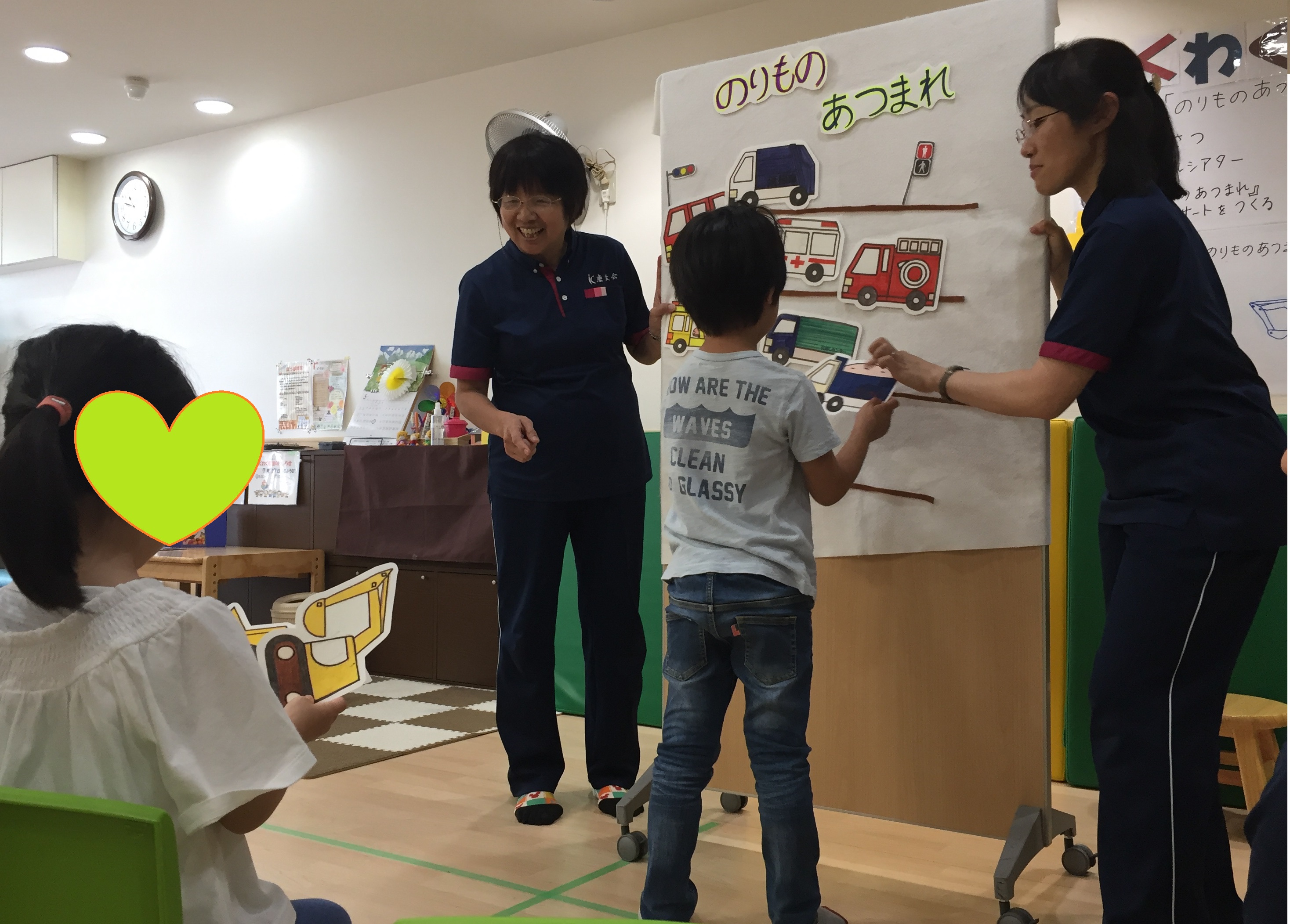 6月22日(土)にわくわく教室を行いました。 テーマは『のりものあつまれ』でした。みんな大好きなはたらくくるまがたくさん出てきたので、長い時間集中して取り組むことができていました。まず初めにパネルシアターをしました。パネルシアターは、布を貼ったボードの中でお話しが展開します。 IMG_9481.JPG 音楽が始まると、曲に合わせて色んなはたらく車が登場しました。みんな目をキラキラさせて「しょうぼうしゃ!」、「カーキャリア!」など車の名前を大人も一緒になって大きな声で呼んでくれました。みんなで声を合わせて言うのって楽しいですね。 2回目は子どもたちに自分が好きな車を選んでもらい音楽スタート!曲に合わせて自分の選んだ車をパネルに貼ってくれました。ちょっと自慢げなお友達、前に出るの恥ずかしいけれど車と一緒なら出来たお友達、それぞれの思いを乗せたはたらく車でした。 IMG_9410.JPG パネルにはたくさんの車が集まりました! 次は、好きな車をきれいにぬりえはたらく車に子どもたちがそれぞれ好きな色を選び、ぬりえタイムの始まりです♪ たくさんの色を使ってカラフルに仕上げたり、線からはみ出さないように慎重に塗るお友達もいました。持ち手を付けたらとっても素敵なはたらく車の完成です!  IMG_9426.JPG IMG_9499.JPG 最後は、自分で作った好きな車を2つ選んで曲に合わせて、披露してもらいました。 IMG_9429.JPG 最後は絵本の時間です。今回の絵本は「でんしゃにのって」でした。 うららちゃんががたごと、がたごと電車に乗ります。駅では色々な動物たちが乗ってきました。次の駅で待っいるのは何か想像したり、考え、それぞれに答えることができていました。繰り返しの言葉と車内の様子が楽しくて、自分が思った通りの展開に大喜びの子どもたちでした。 IMG_9537.JPG   大好きなのりものがたくさん出てきてみんなとても楽しそうでした♪