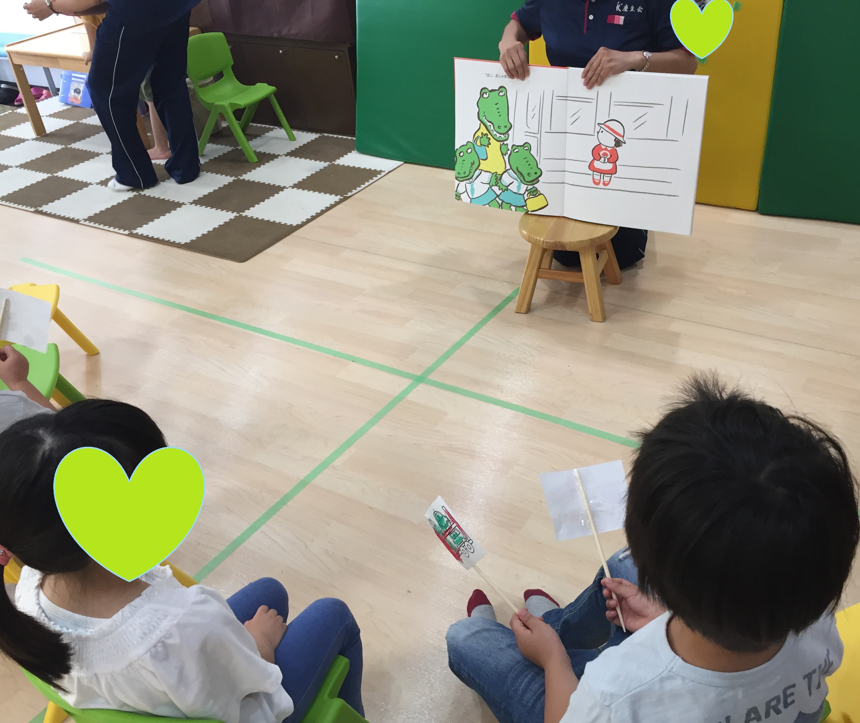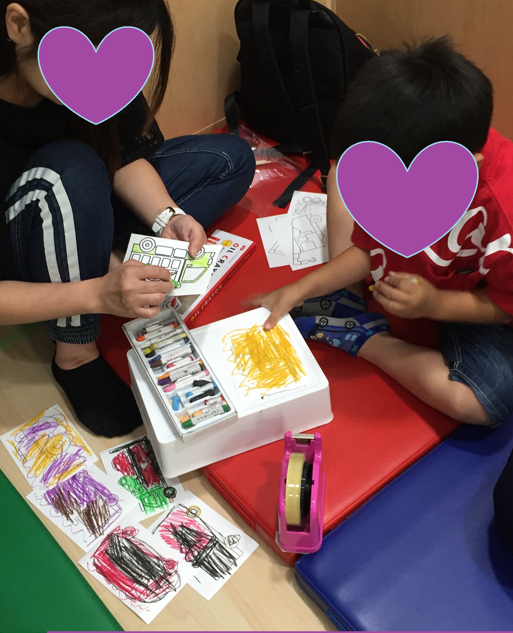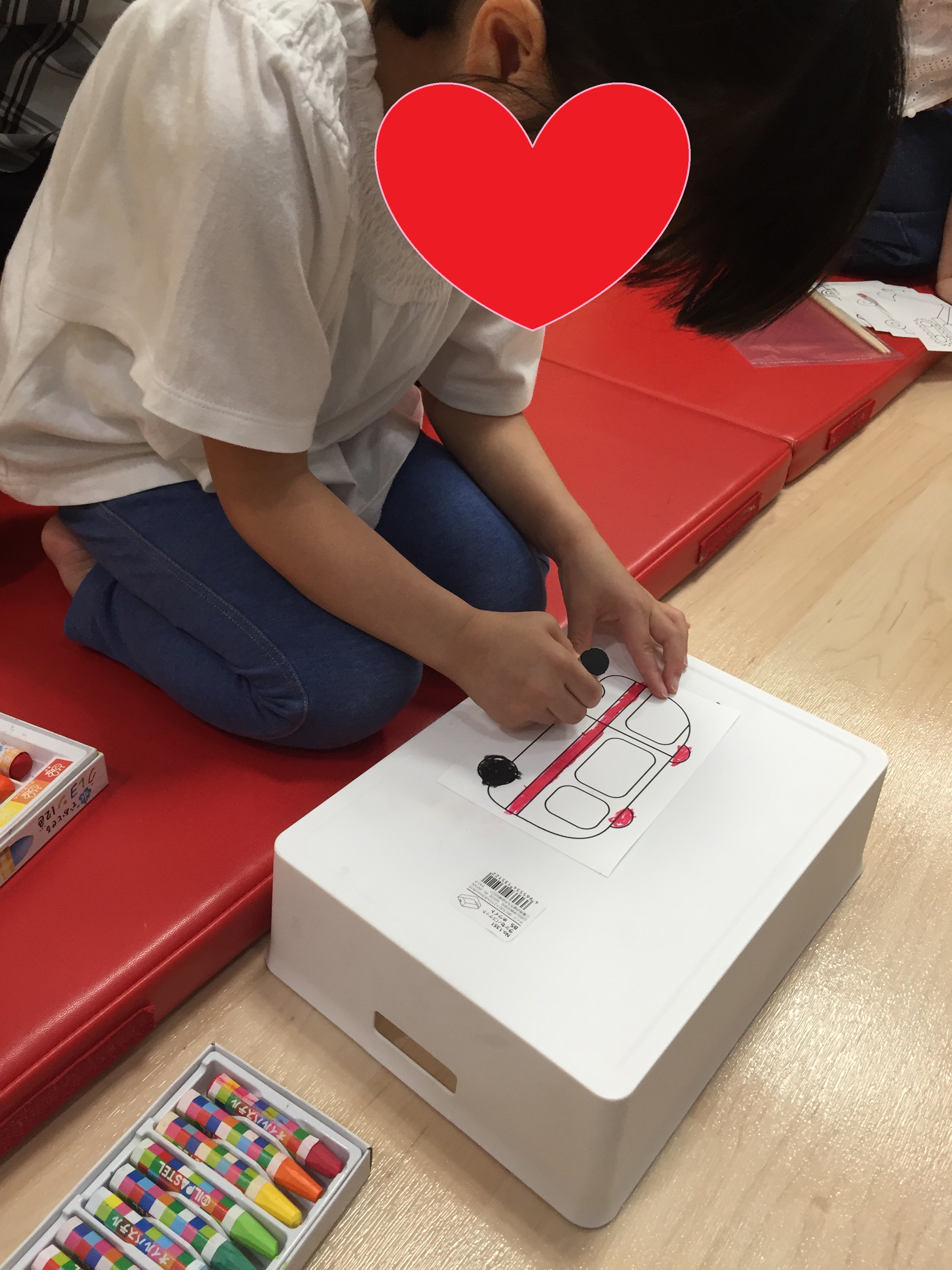 6月22日(土)にわくわく教室を行いました。 テーマは『のりものあつまれ』でした。みんな大好きなはたらくくるまがたくさん出てきたので、長い時間集中して取り組むことができていました。まず初めにパネルシアターをしました。パネルシアターは、布を貼ったボードの中でお話しが展開します。 IMG_9481.JPG 音楽が始まると、曲に合わせて色んなはたらく車が登場しました。みんな目をキラキラさせて「しょうぼうしゃ!」、「カーキャリア!」など車の名前を大人も一緒になって大きな声で呼んでくれました。みんなで声を合わせて言うのって楽しいですね。 2回目は子どもたちに自分が好きな車を選んでもらい音楽スタート!曲に合わせて自分の選んだ車をパネルに貼ってくれました。ちょっと自慢げなお友達、前に出るの恥ずかしいけれど車と一緒なら出来たお友達、それぞれの思いを乗せたはたらく車でした。 IMG_9410.JPG パネルにはたくさんの車が集まりました! 次は、好きな車をきれいにぬりえはたらく車に子どもたちがそれぞれ好きな色を選び、ぬりえタイムの始まりです♪ たくさんの色を使ってカラフルに仕上げたり、線からはみ出さないように慎重に塗るお友達もいました。持ち手を付けたらとっても素敵なはたらく車の完成です!  IMG_9426.JPG IMG_9499.JPG 最後は、自分で作った好きな車を2つ選んで曲に合わせて、披露してもらいました。 IMG_9429.JPG 最後は絵本の時間です。今回の絵本は「でんしゃにのって」でした。 うららちゃんががたごと、がたごと電車に乗ります。駅では色々な動物たちが乗ってきました。次の駅で待っいるのは何か想像したり、考え、それぞれに答えることができていました。繰り返しの言葉と車内の様子が楽しくて、自分が思った通りの展開に大喜びの子どもたちでした。 IMG_9537.JPG   大好きなのりものがたくさん出てきてみんなとても楽しそうでした♪