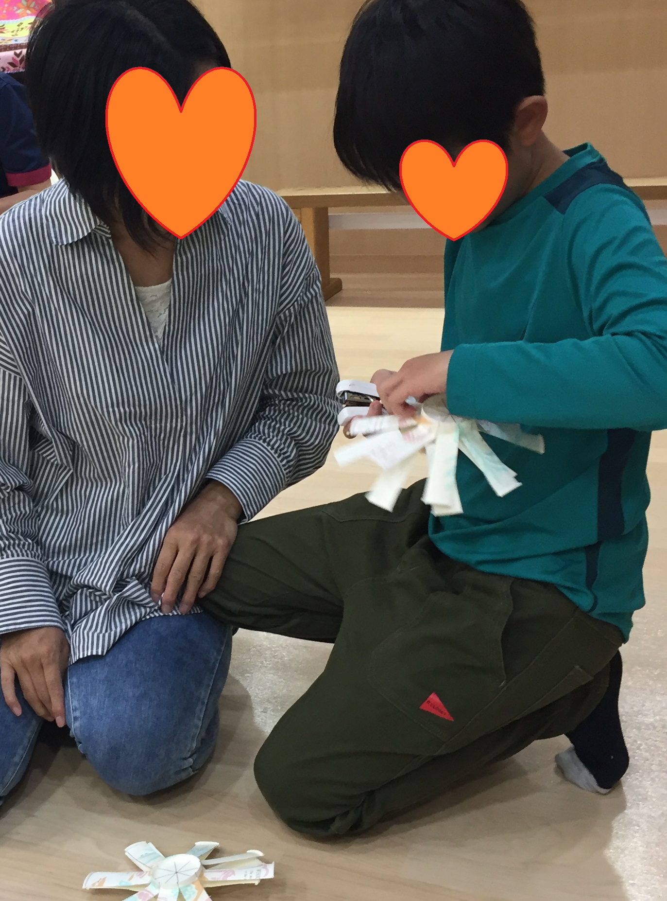 『紙皿紙コップで遊ぼう』というテーマで、二つおもちゃを作って遊びました。
