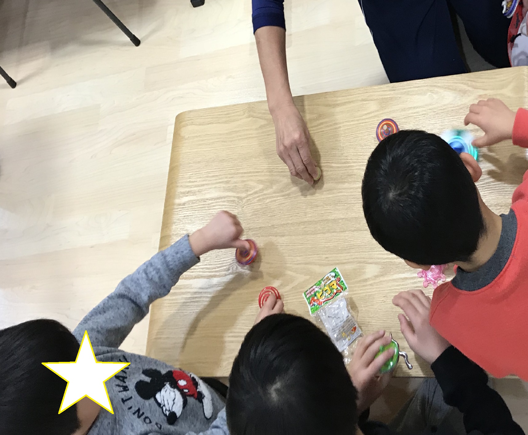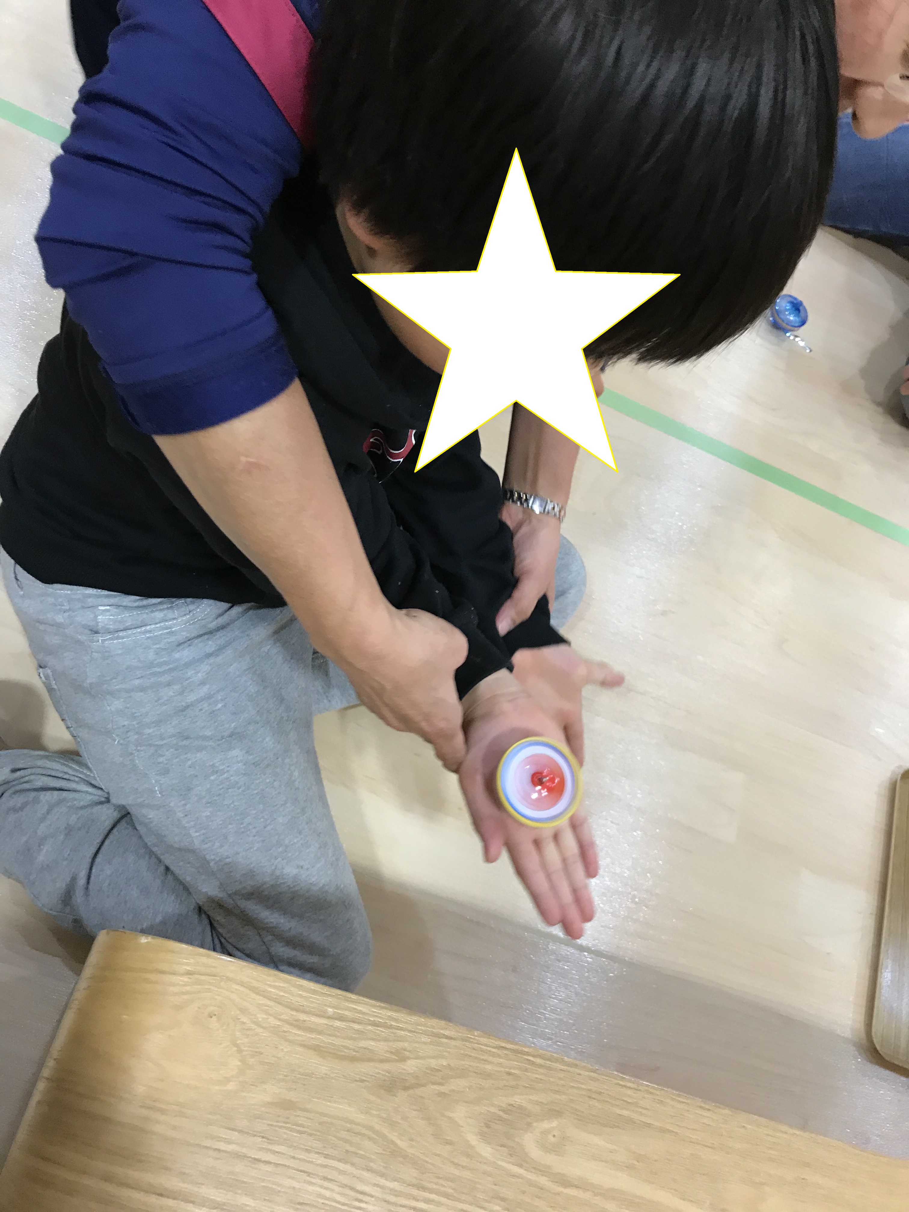 コマは色々なタイプのコマを用意していたので、それぞれに選んで楽しめていました。折り紙で作ったコマもキラキラ折り紙で作ってあり「これはキラキラしてる!!」と、喜んでくれました。大人がひもで回したコマを子どもの手に載せて、感触を感じてもらいたかったのですが、なかなかうまくいかず残念でした。