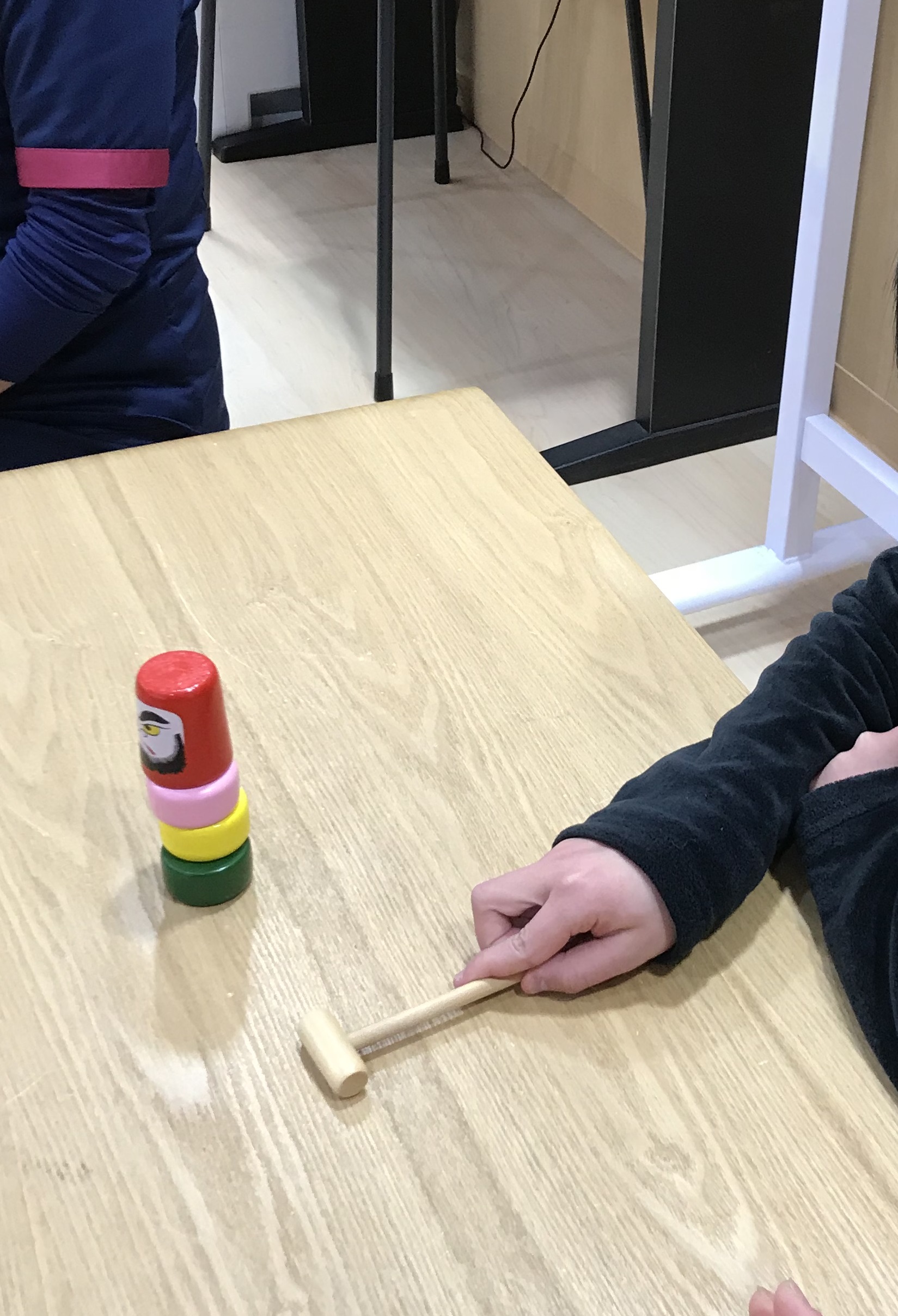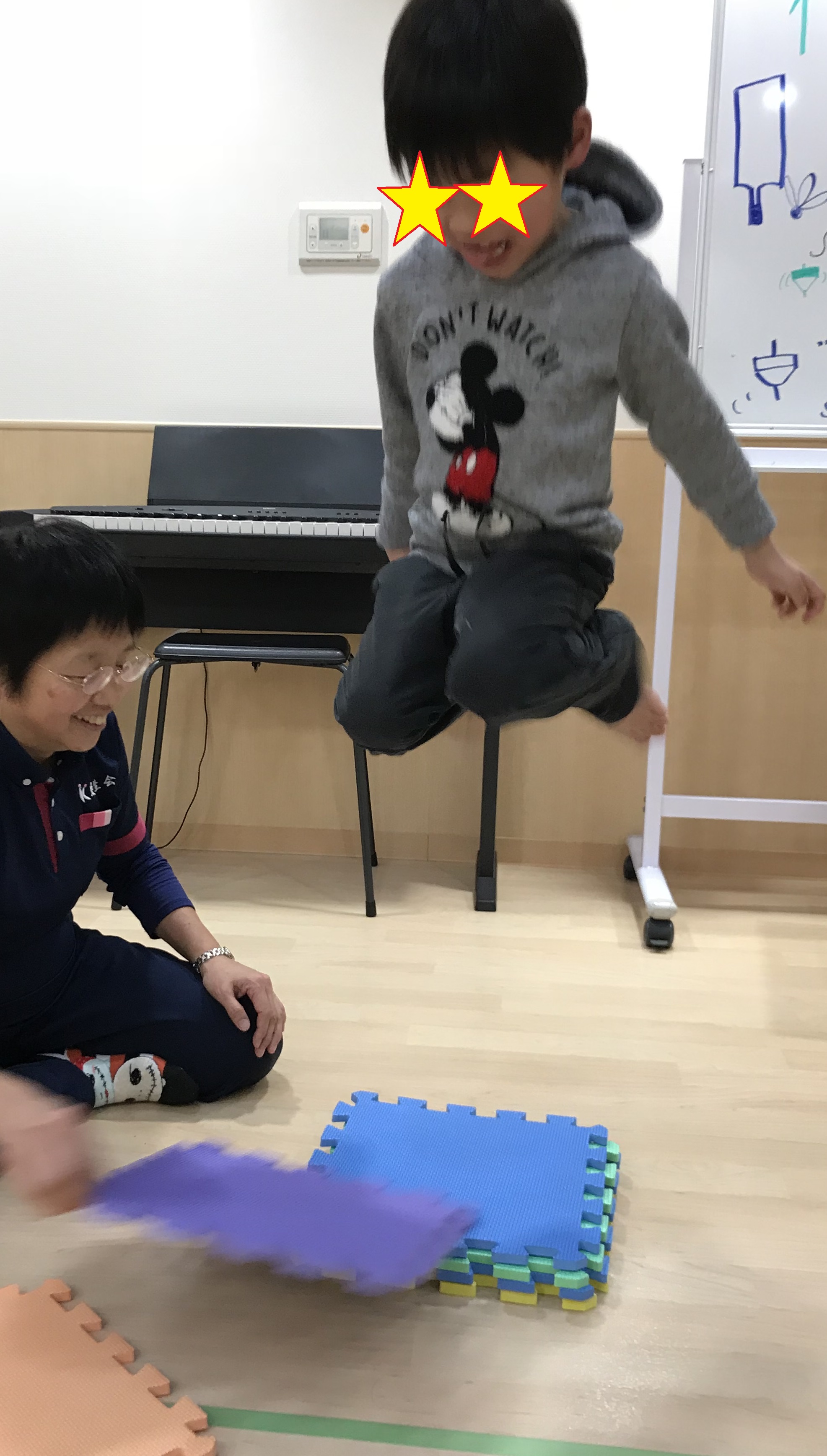 人間だるま落としは、マットの上に立って、大人の掛け声に合わせて飛び上がり、その間に足元のマットを大人が一枚ずつ引いていくと言う遊びでした。大人の呼吸に合わせて飛び上がらないと上手くいかないのですが、「せーの」の掛け声にみんなうまく合わせる事が出来ていました。