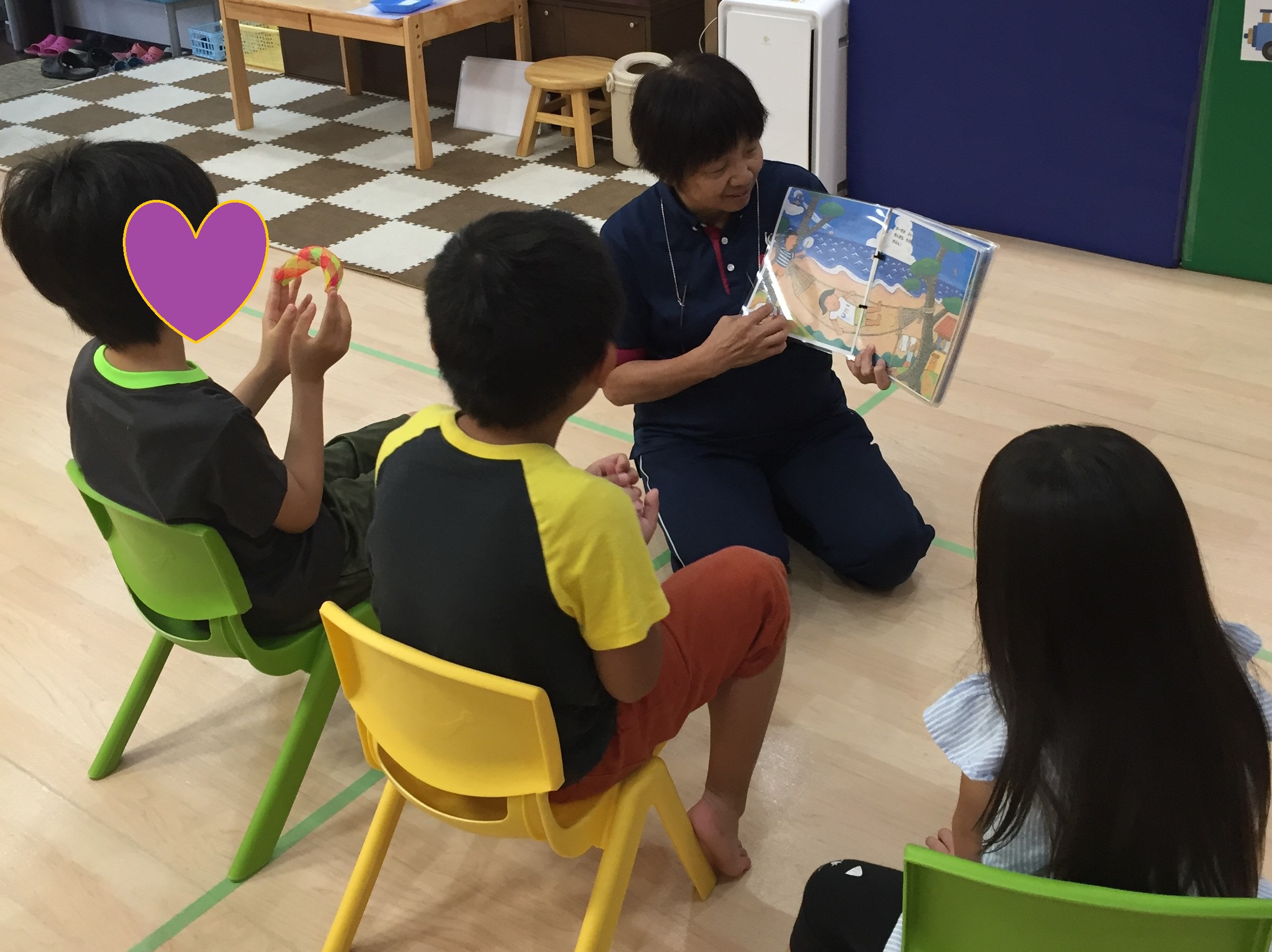 今回は遊びのテーマである『海』をイメージできるように「おーなみこなみざぶん!」という絵本から始まりました。昼間の明るい海や夕方の海、花火があがる夜の海、かき氷屋さん、夕立など夏を感じることができるたくさん場面を見ながら気持ちも一緒にわくわくしましたね。