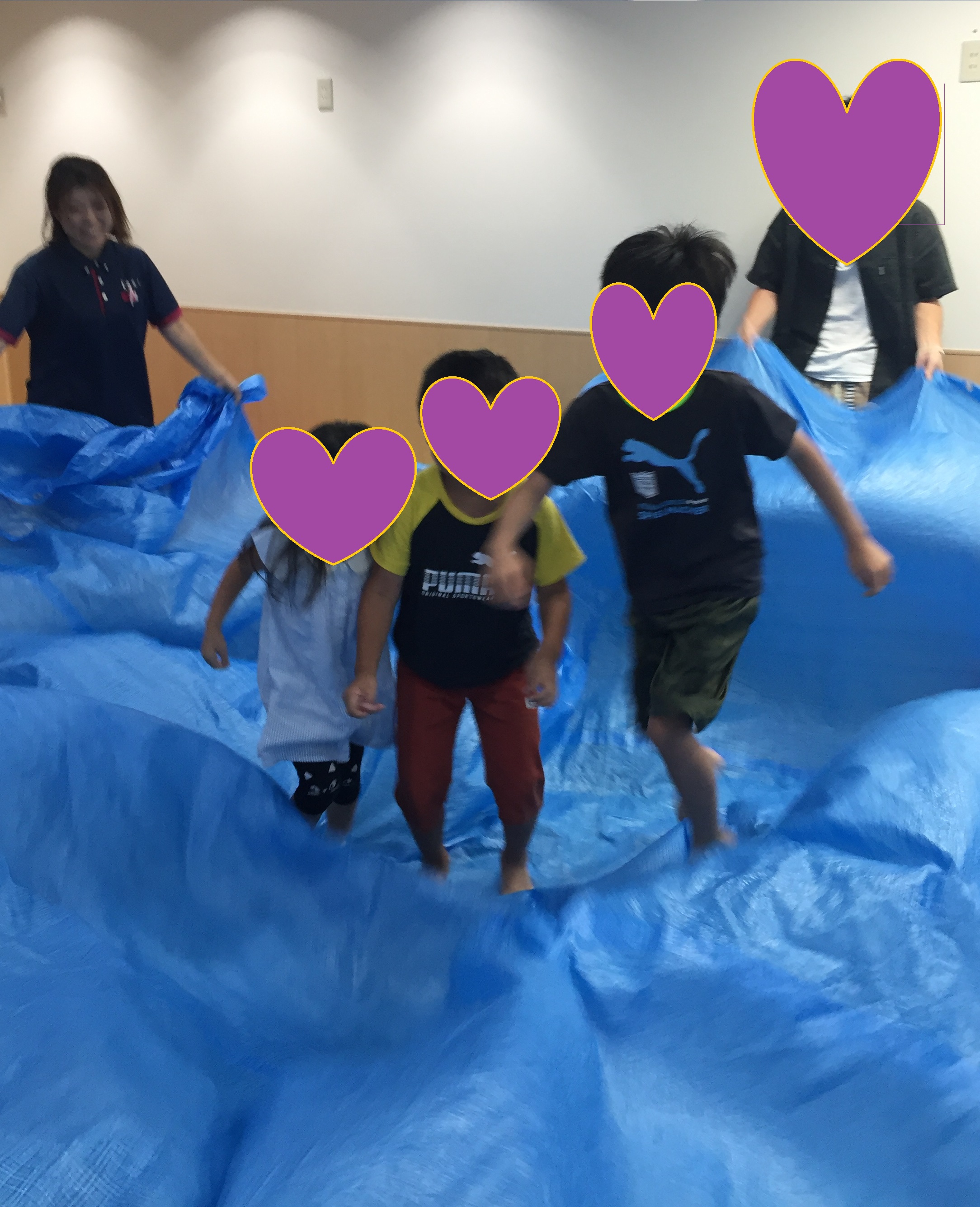 その後、今回のメインテーマである『波遊び』です。みんなで「うみー!!」と呼ぶとカーテンの奥から海(大きなブルーシート)が登場!!教室に広げるとみんなニコニコで大興奮でした。まずは、"バサッバサッ"とシートを揺らして波を作りました。シートの上に乗って波を追いかけたり、ジャンプしたり、平面ではなくデコボコとなったシートで思いっきり体を動かして遊びました。