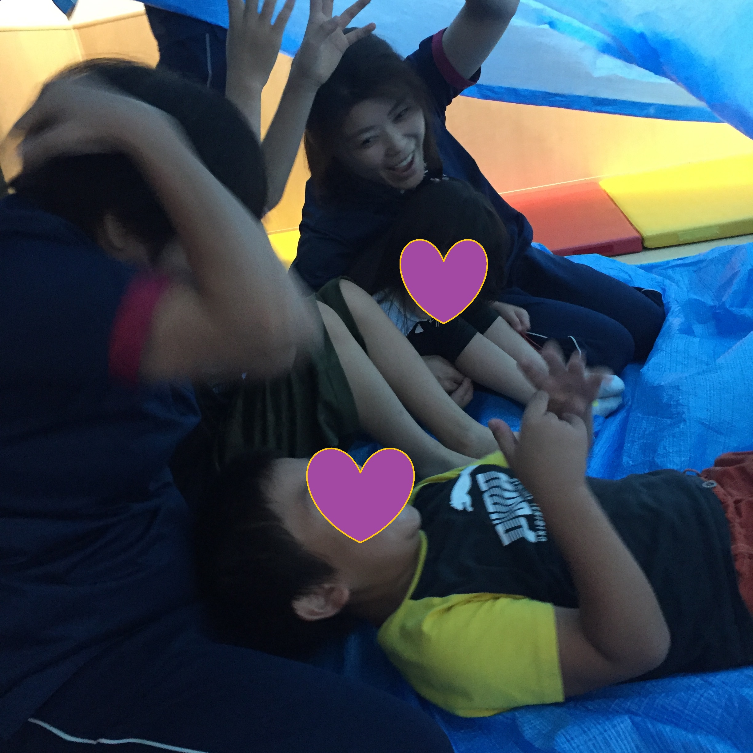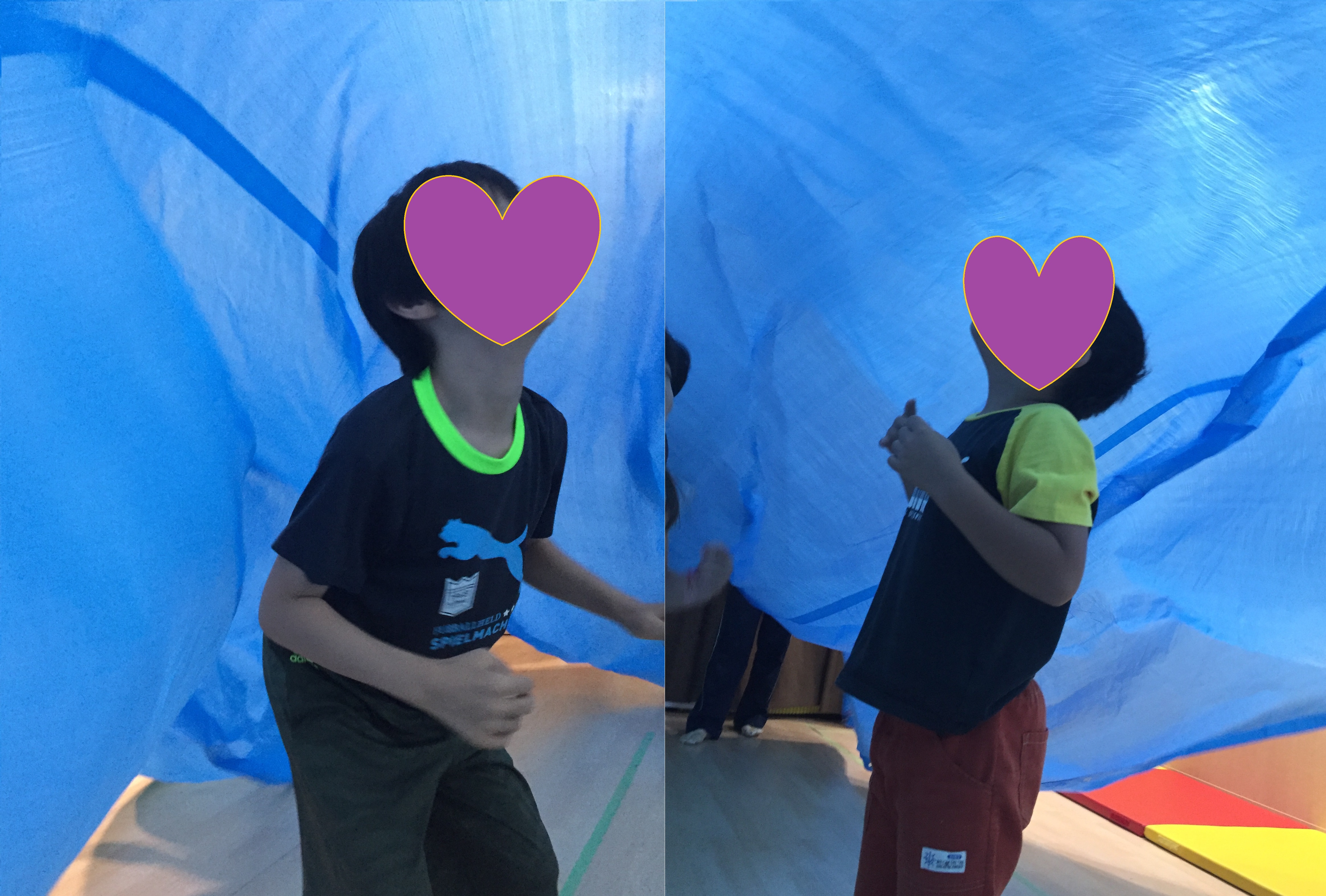 そのあとは、シートの上に座って『波が来た』です。波に見立てたシートが子どもたちに覆いかぶさり、視界が狭くなるのを感じました。ちょっと怖く感じるお友達もいましたが、先生やお友達の楽しそうな声と笑顔、人との温もりを感じながら、『楽しい』を共有することができました。