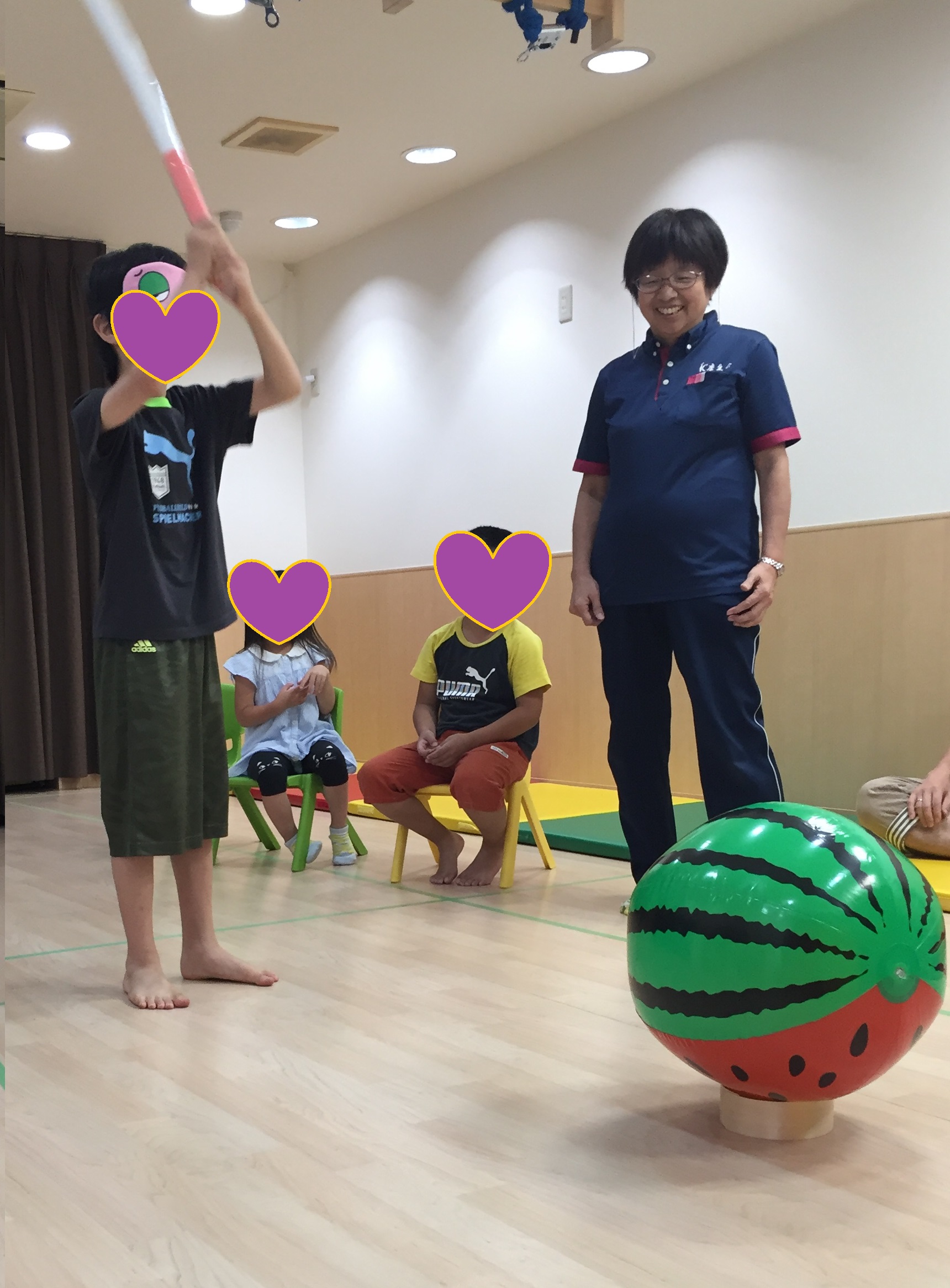 波遊びの後は、スイカのビーチボールでスイカ割りをしました。目隠しをして、お友達や先生の言葉をしっかり聞かなければいけません。「右!左!真っ直ぐ!もうちょっと右!」「がんばれー!」みんなの声を頼りにスイカの位置へ行きます。思いっきり棒を振り下ろして見事スイカに当たるとみんなで喜び合いました。みんなの言葉を聞いて「これくらいかな?」と想像したり、「目隠しする前はあの辺にあったな!」と頭の中でスイカの位置を考えながら集中して取り組む姿が印象的でした。順番も椅子に座って待つことができました。お友達同士で応援したりされたりそんな経験も集団の面白さですね。