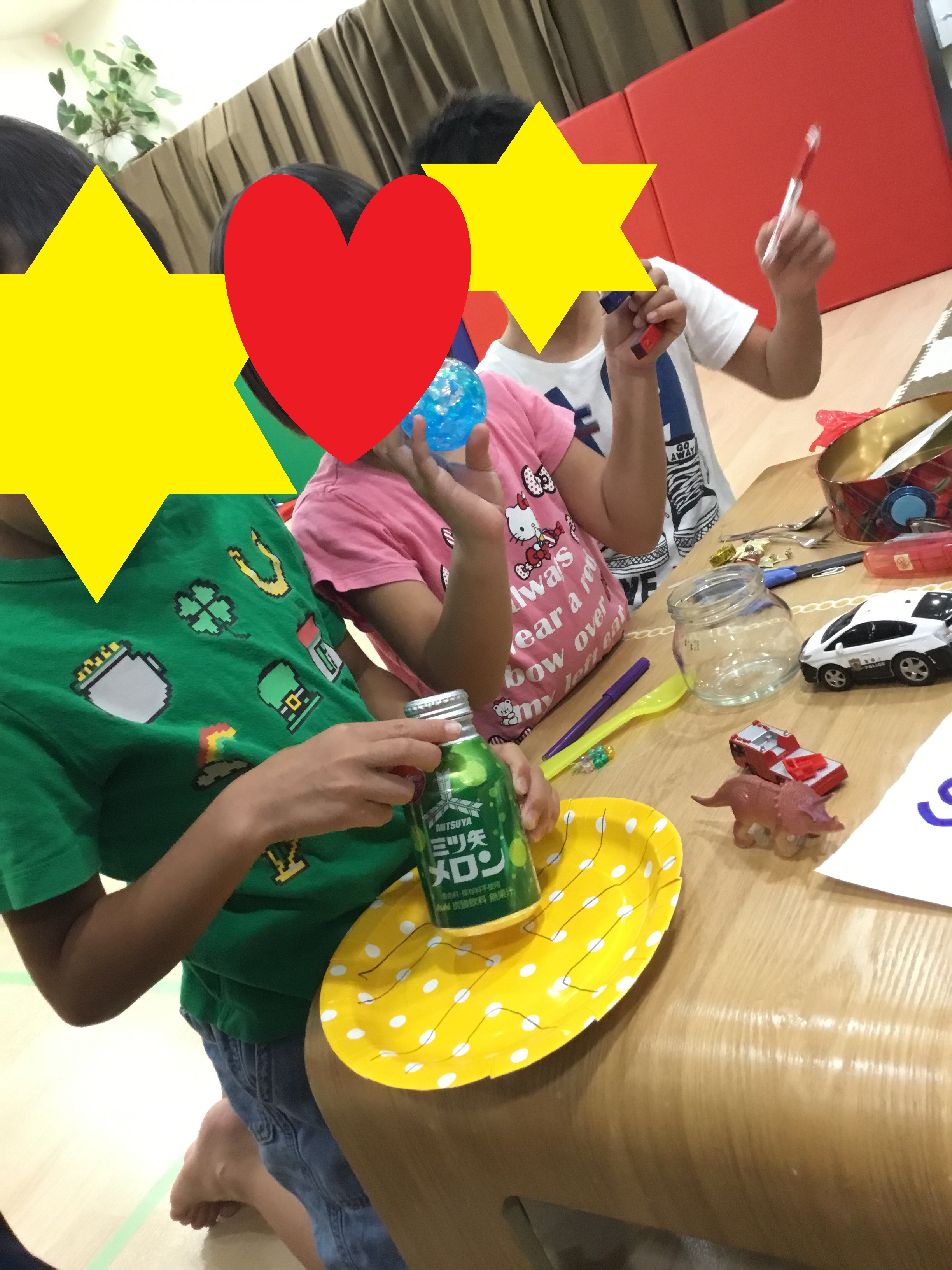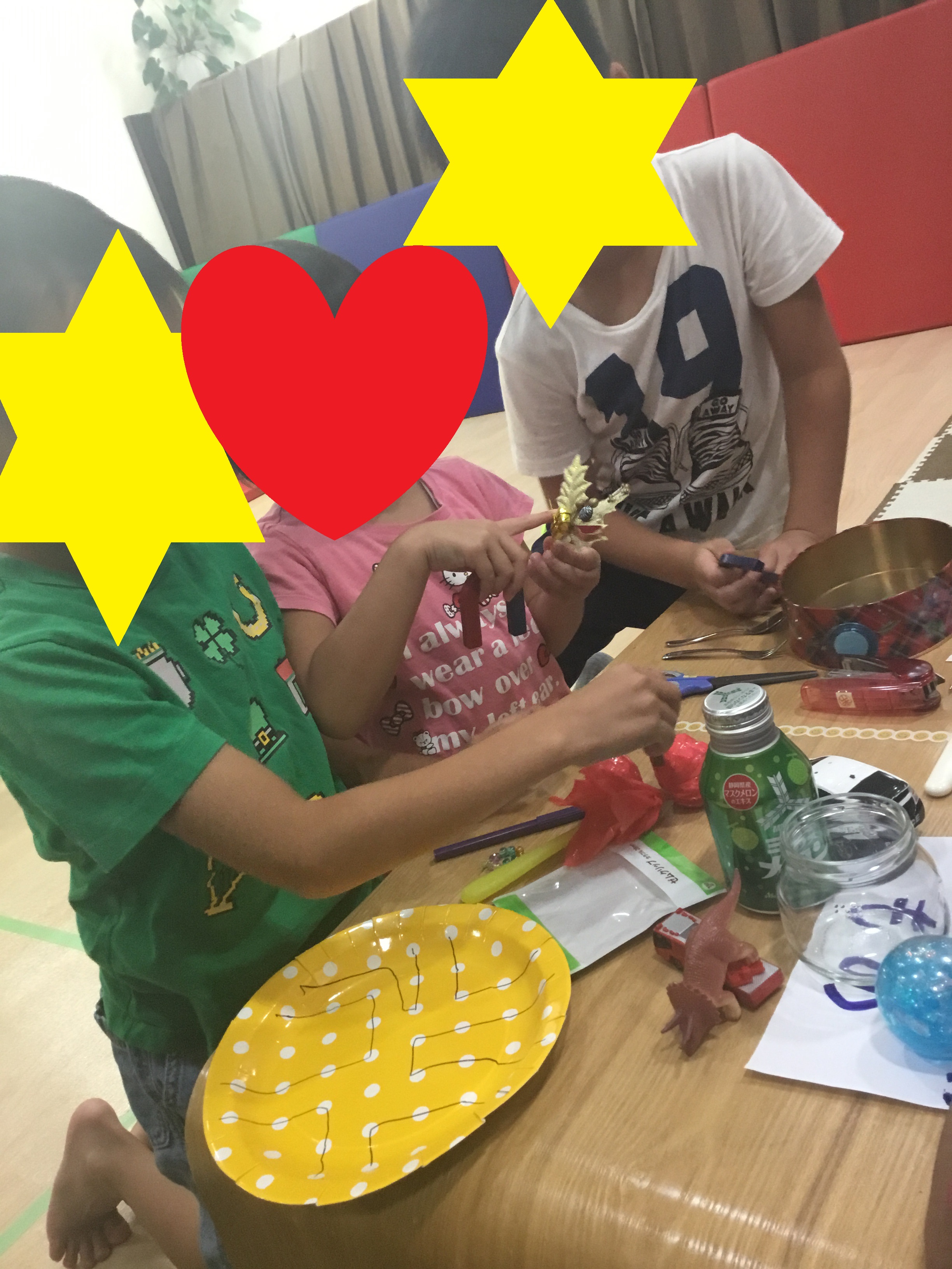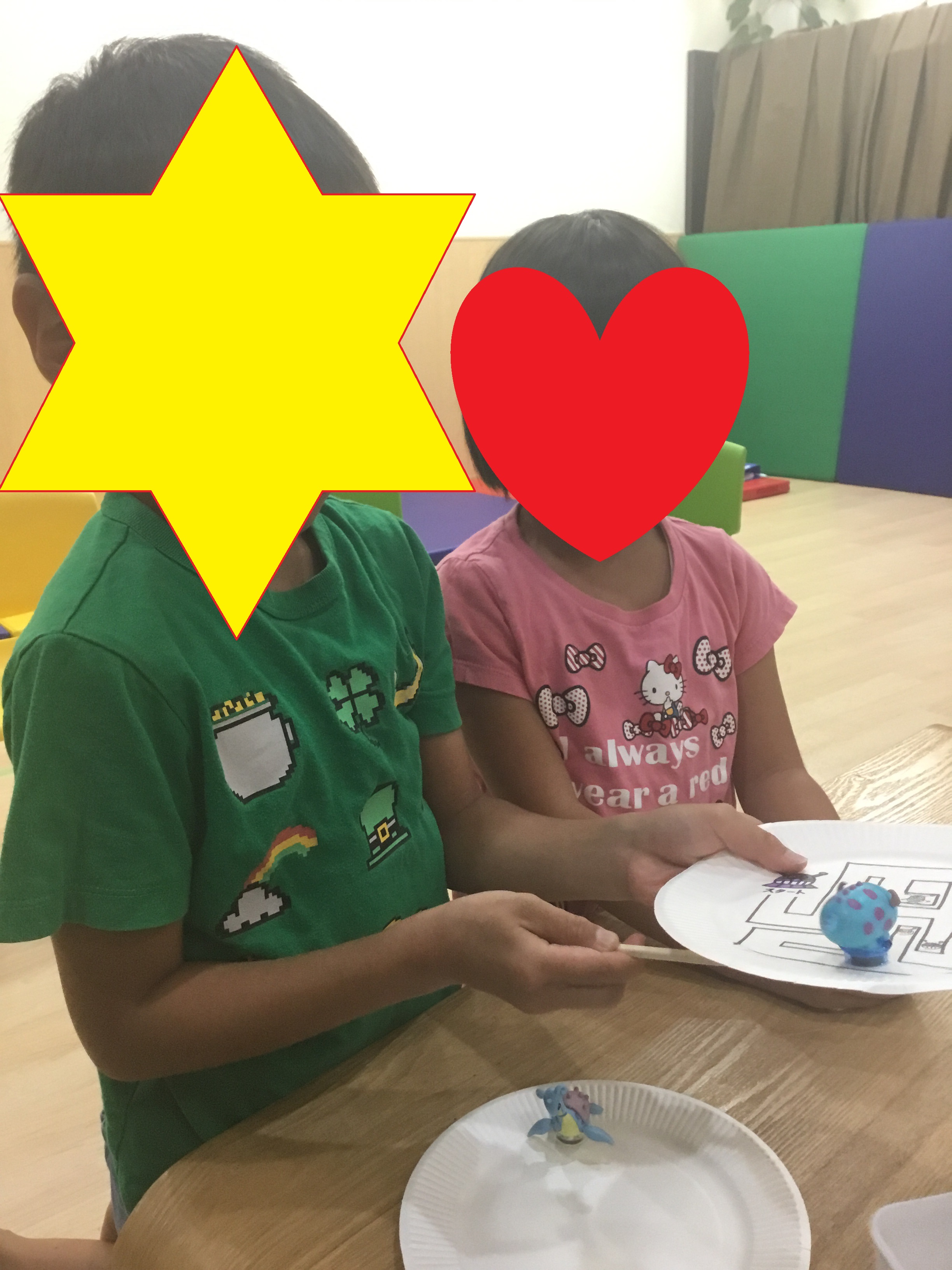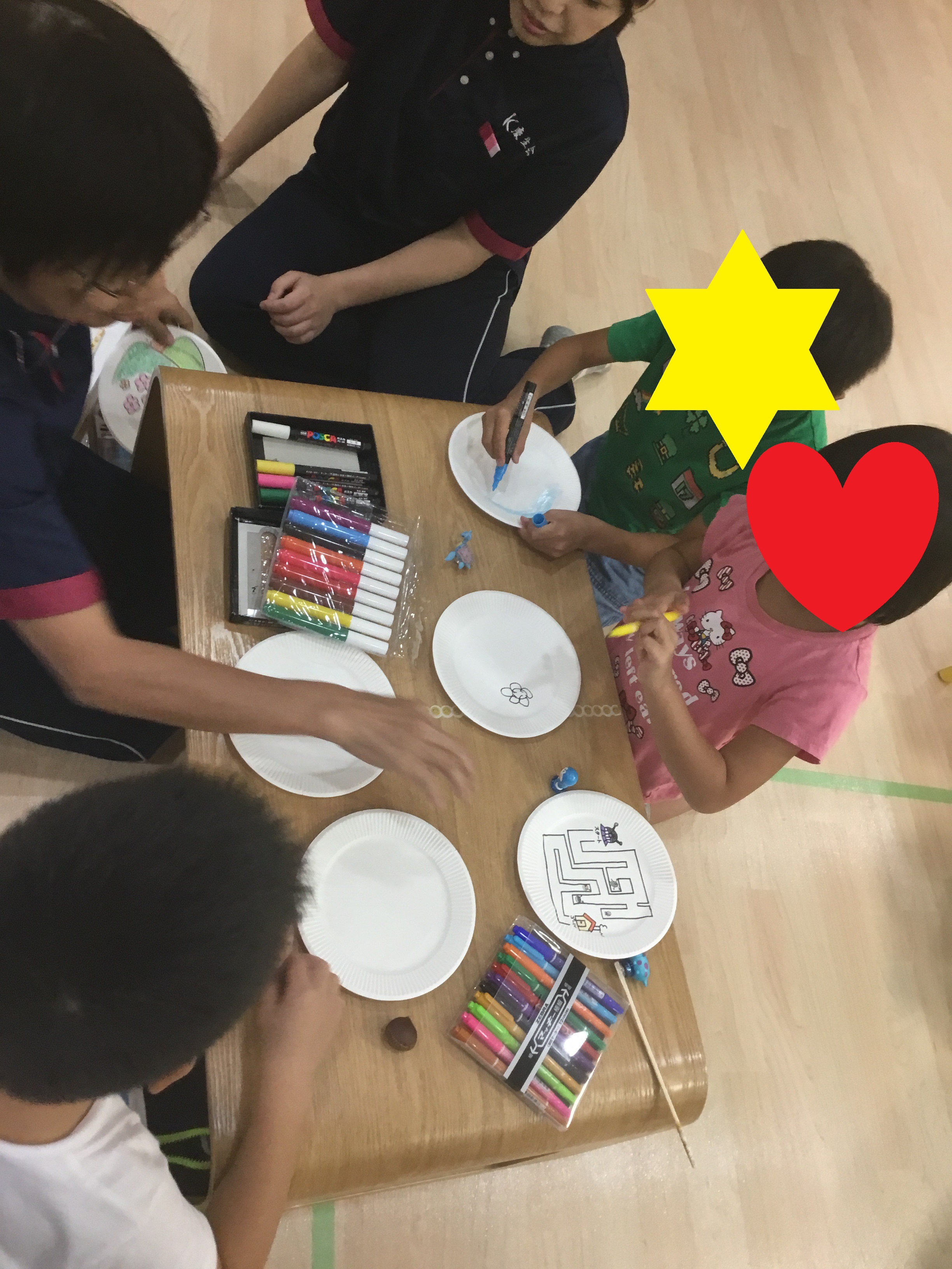 その後は、"磁石人形で遊ぼう・紙皿でステージを作ろう"です。紙皿にシールを貼ったり、絵を描いたり、色塗りをしたりしてオリジナルのステージを作りました。どんなステージにするのか自分が好きなものや何を書きたいのか、どの色がいるのか等先生たちに伝えながら工作に取り組んでくれました。完成した子から、素敵なステージの上で磁石人形たちをわりばしの先につけた小さな磁石を使って動かしました。