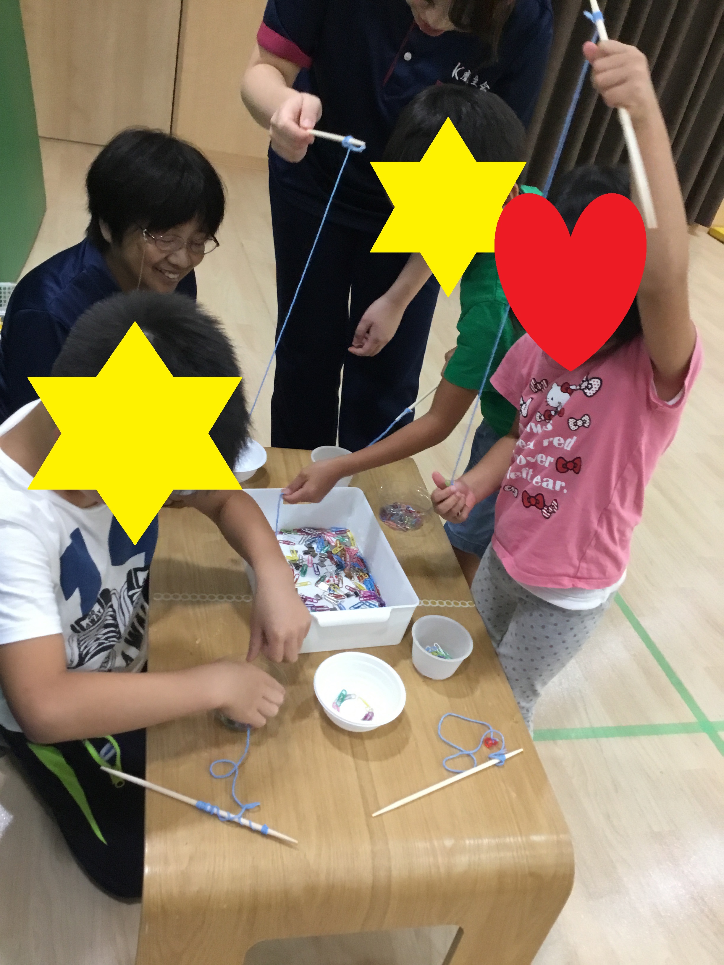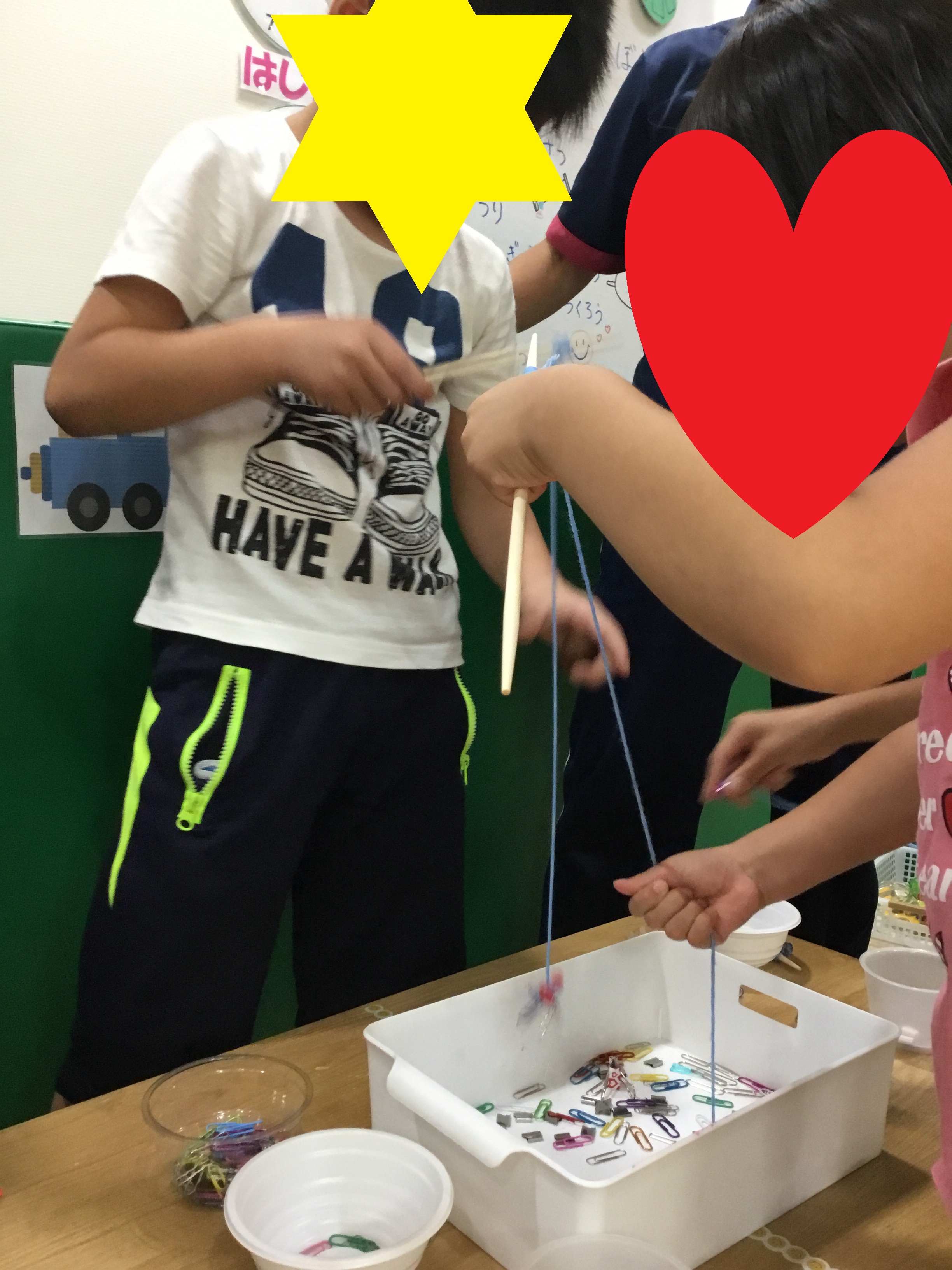 次に"クリップ釣り"です。箱にちりばめられたクリップを磁石で釣っていきます。クリップがいっぱい磁石にくっつく様子やクリップ同士がつながって磁石にくっついている様子に子どもたちも興味津々でした。「大きいのほしい!!」、「金のある!!」と子どもたちは夢中になって取り組んでくれました。箱のクリップが全部なくなるまで集中していました。