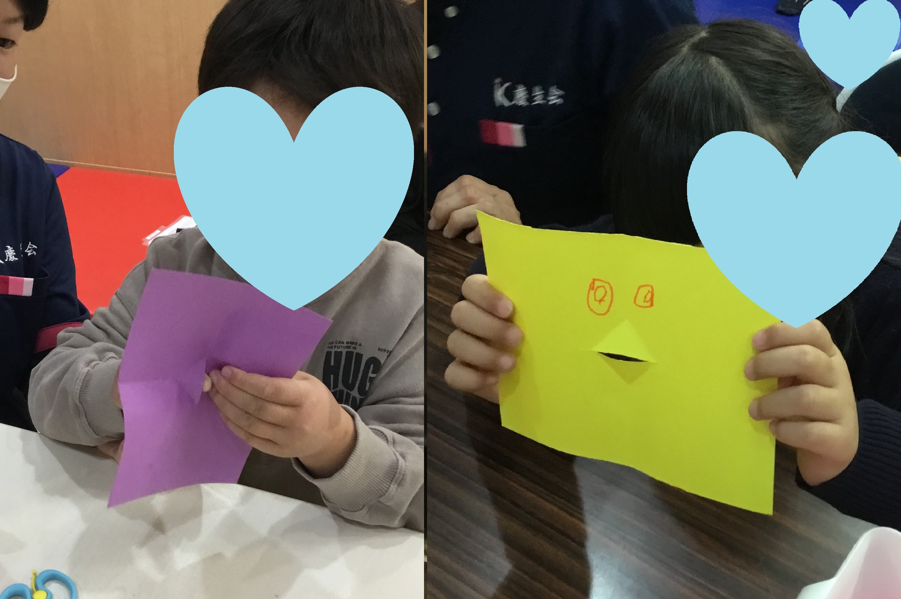 まずは、口がパクパク動くカード作りです。黒い線に沿ってはさみで切ったり、画用紙を折ったり、たくさん手先を使って取り組んでいました。目を書き、くちばしに色を付け、鳥さんの完成!!カードを開いて閉じて...鳥のくちばしがパクパク????♪何かお話しているような面白い動きに子どもたちも楽しそうに遊んでいました。