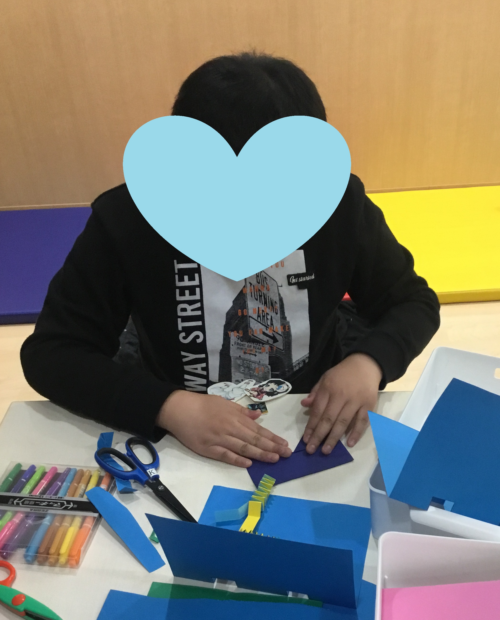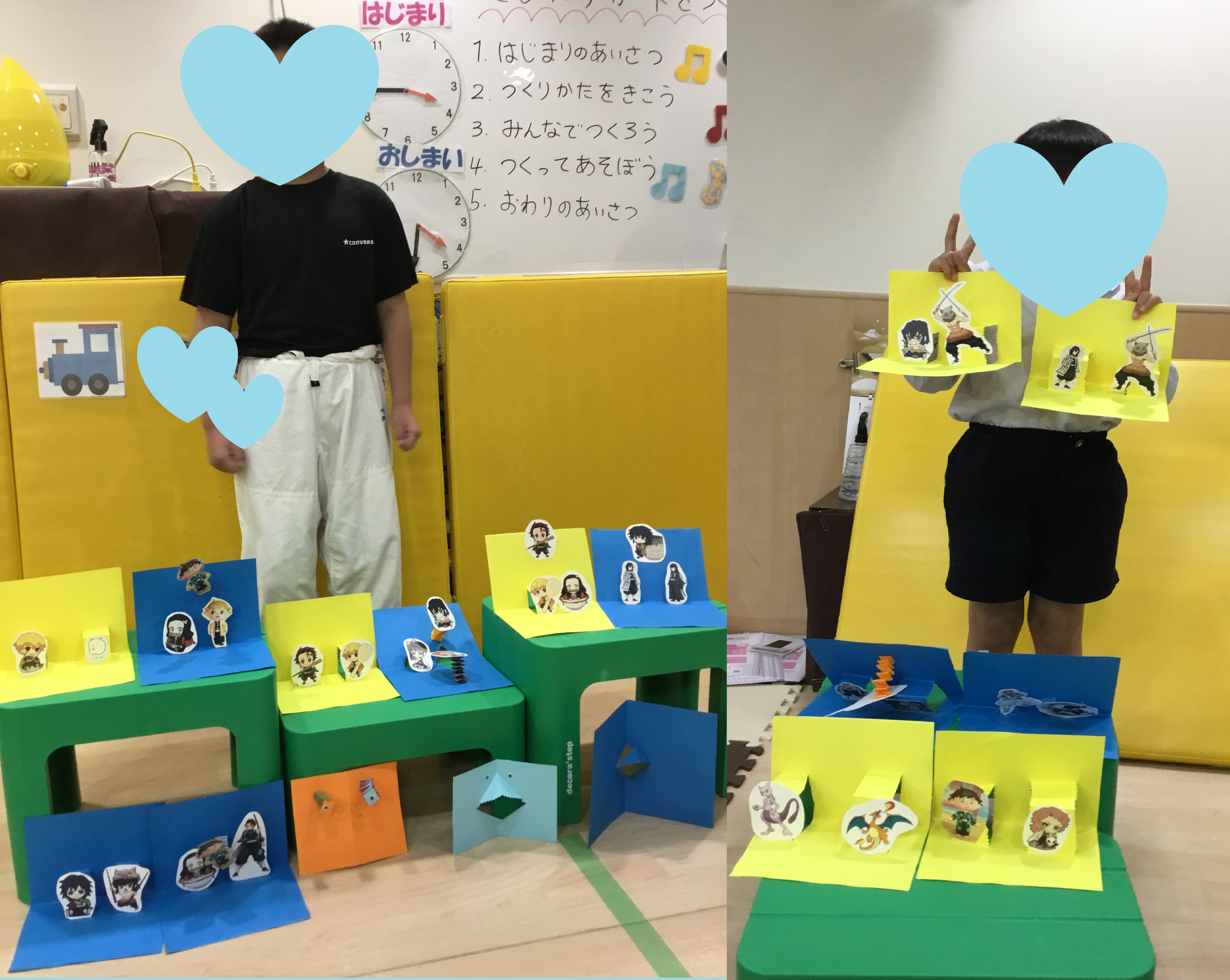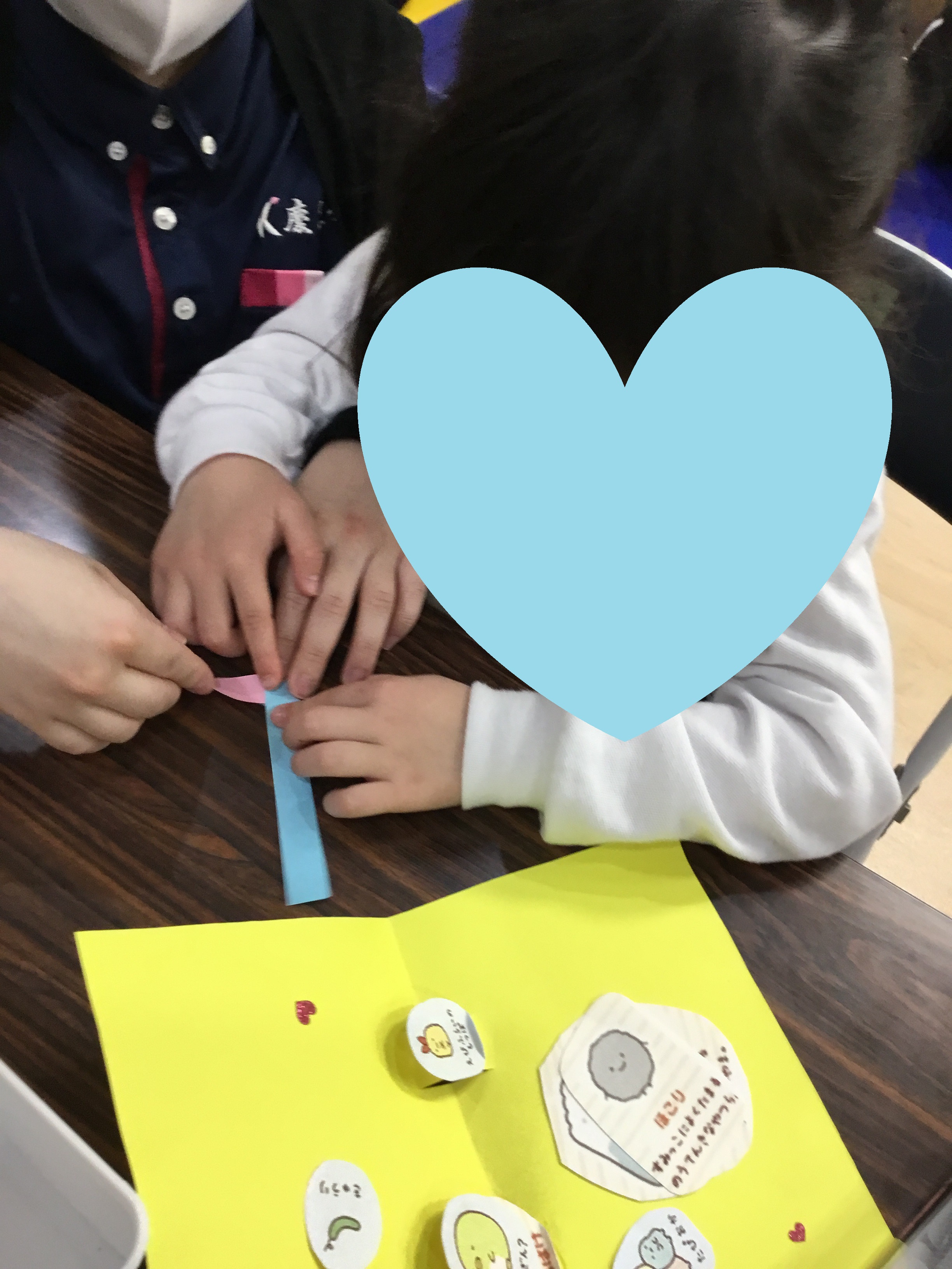 次は、自分たちの好きなキャラクターが飛び出すカードを作りました。はさみで土台を作ったり、両面テープをはがしてキャラクター達を貼ったり、集中して取り組んでいました。どんなカードにするのか自分の好きなものや、どの色がいるのか等先生に伝えながら工夫して作っていました。